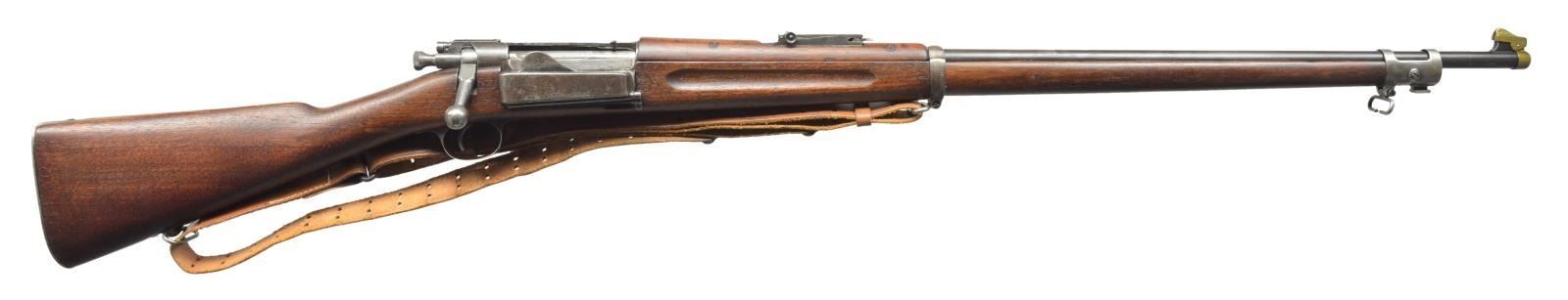 Cal. 30-40 Krag. S# 137276. Bbl. 30". Model 1901 ladder rear sight graduated to 2000yds. Blade front sight. Walnut stock set. Stock has faint boxed JSA 1898 inspectors mark. Encircled script "P" under grip. Trap buttplate has curved toe. Vintage military style sling. Brass muzzle cover & sight protector. CONDITION: Stock set has light professional type refinish w/ slight loss of wood around buttplate & receiver tang. Buttstock has repaired crack extending from trigger guard upward into comb area w/ sm. filled area at comb. Metal has traces of blue turning overall gray w/ patina & light wear. Bore is dark but retains strong rifling. (21-998/RW). CURIO. $700-900.