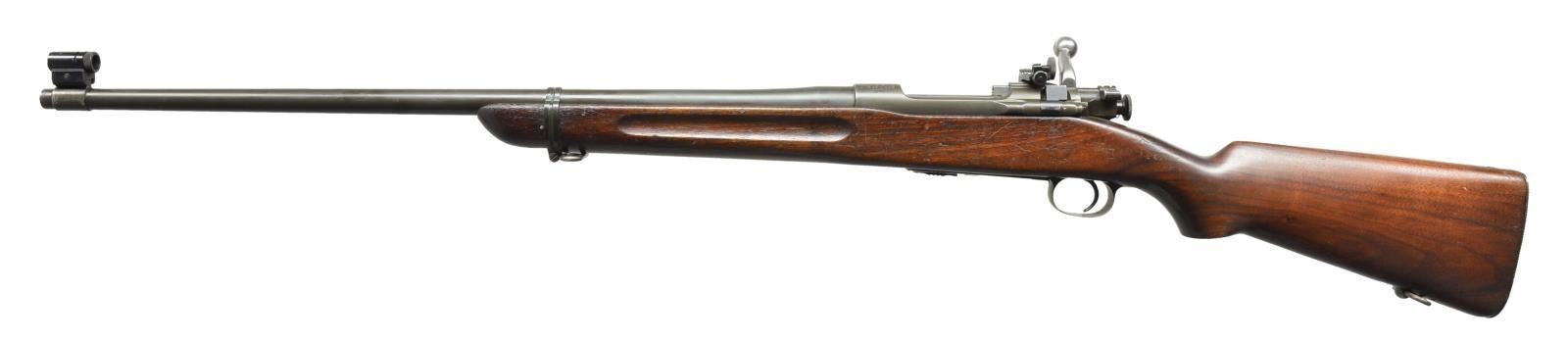 Cal. 22 LR. S# 1672B. Bbl. 24" marked "SA / flaming bomb / 8-25". Replacement globe front sight w/ original Lyman 48 receiver sight. Model 1922 M1 sales rifle modified to M2 configuration. Bolt, extractor & ejector are bright. Bolt handle marked "NS / M2". M2 Type cocking piece. Band fastened pistol grip walnut stock w/ deeply checkered trapdoor service style buttplate. Bottom of pistol grip stamped "M2". MAGS: 1 detachable 5 rd. marked "M2". CONDITION: 85% parkerized finish shows edge & bottom metal wear. Stock shows numerous scratches & handling marks. Bright bore w/ sound rifling. (21-673/DS). CURIO. $900-1,350.