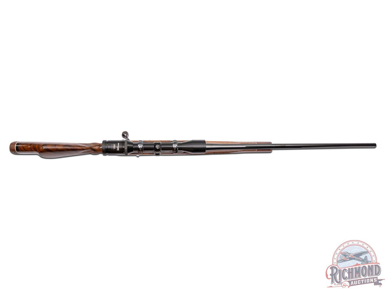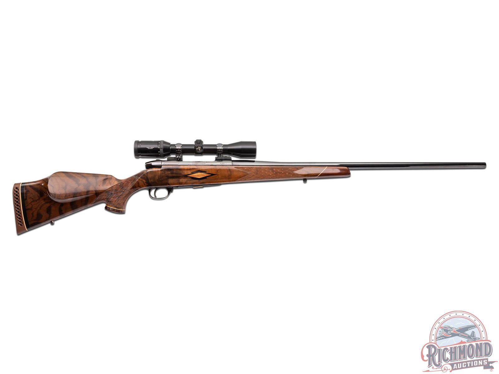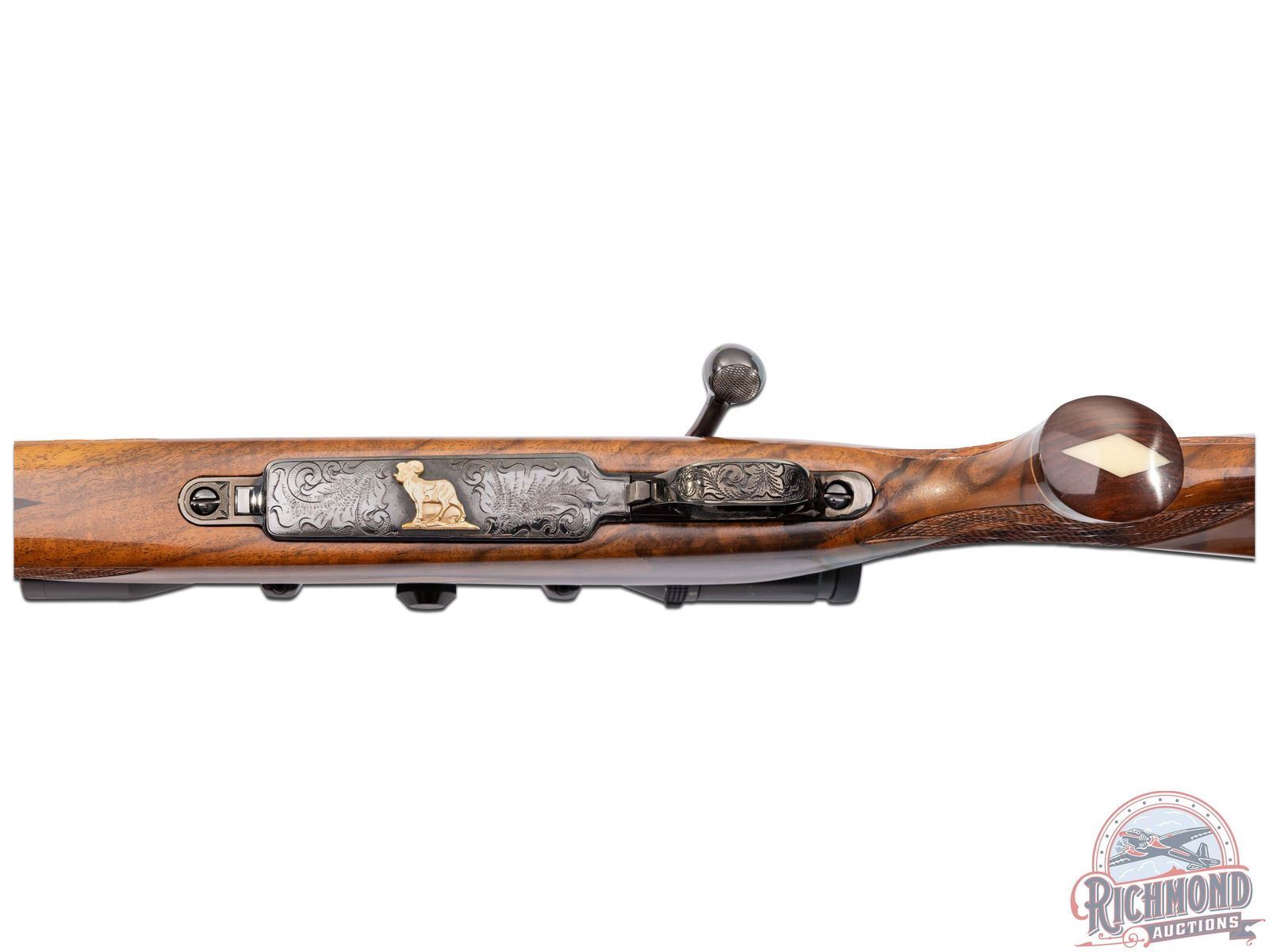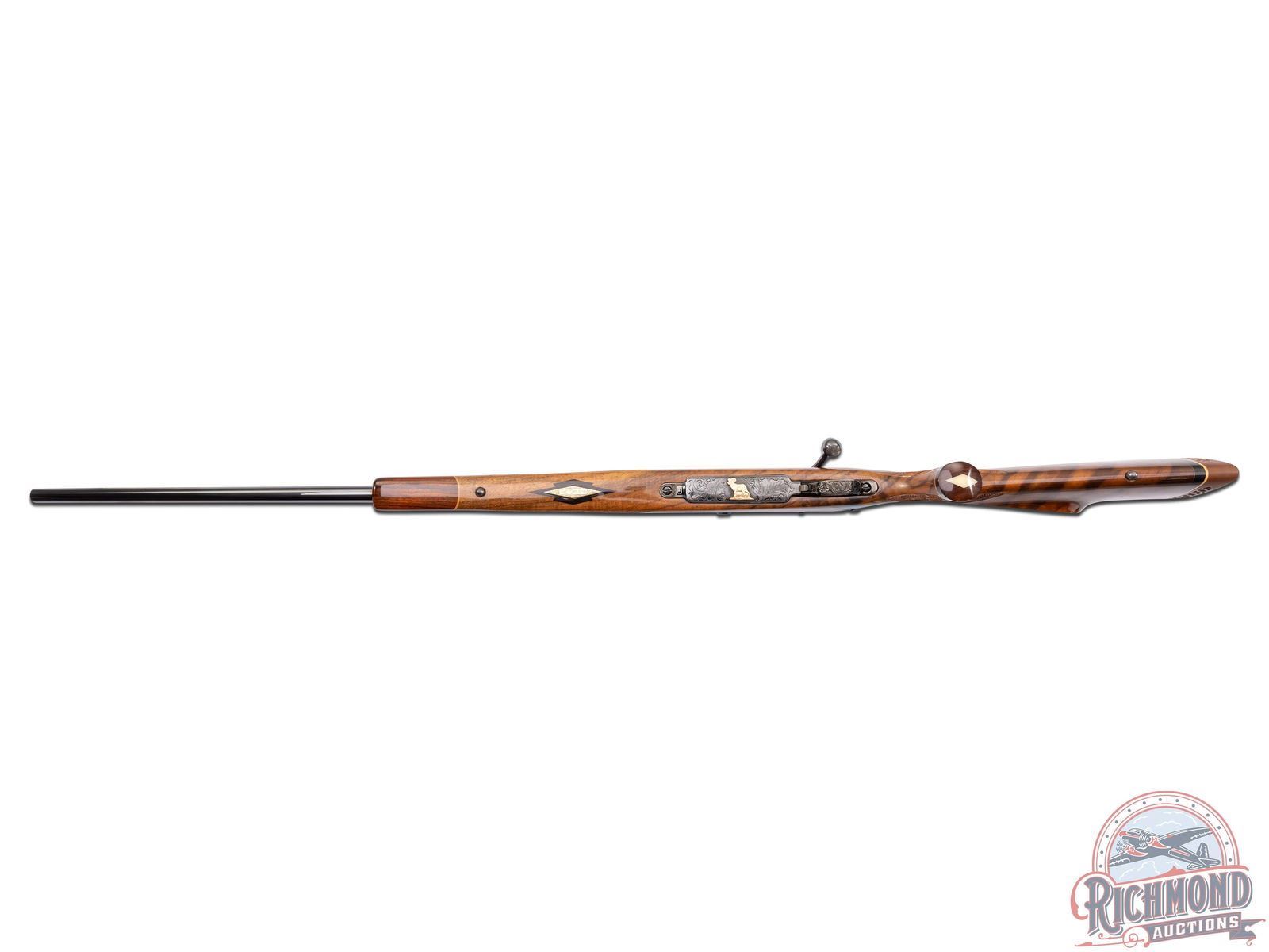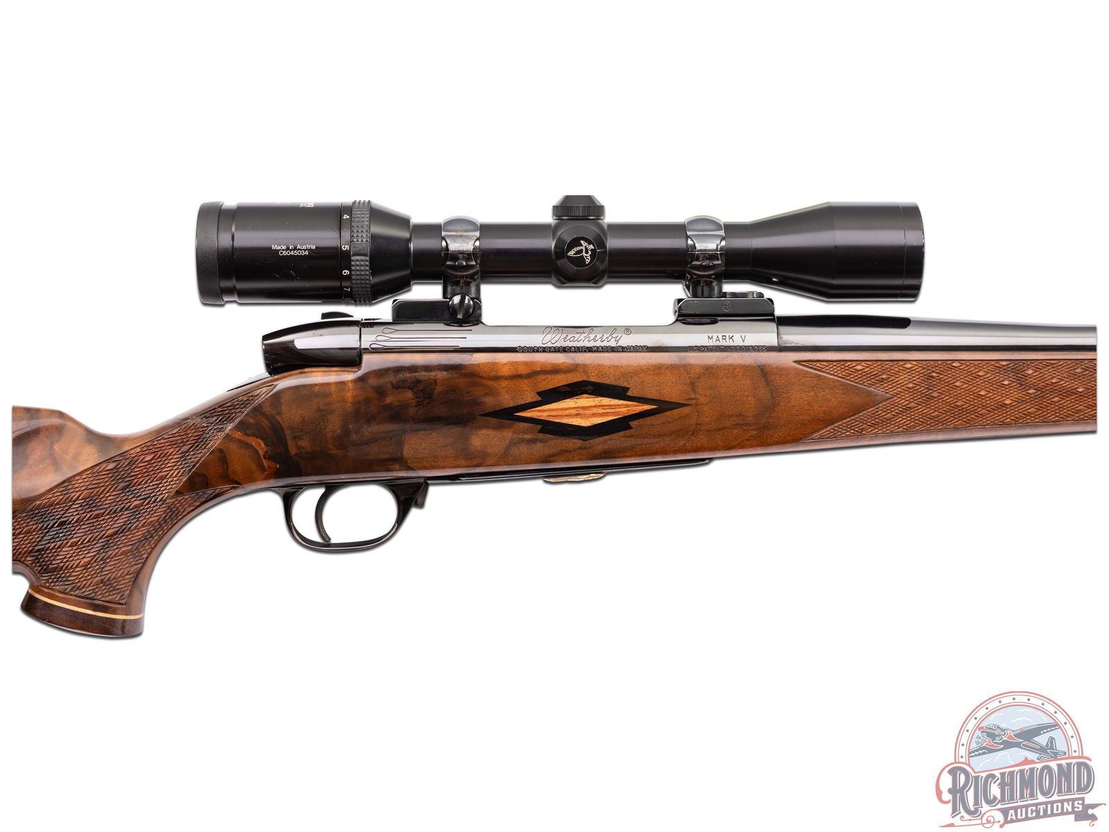 Manufactured circa 1980 in Japan for Weatherby South Gate, CA. Features a 26" blued round sightless tapered barrel with high polish, stamped "USE ONLY 257 WBY MAG." Left hand action receiver is a high polish blued stamped "MARK V / Weatherby South Gate, Calif, Made in Japan". Machine jeweled 9 lug bolt, two position safety, knurled bolt knob. Equipped with Redfield scope mounts and a 3-9x36 Swarovski Habicht scope. Beautiful engraved floorplate with scroll and punch dot background surrounding a gold embossed Big Horn sheep. Bottom of trigger guard has matching engraving. Stock is a 2X walnut Monte Carlo style with rosewood forearm tip and pistol grip cap with white diamond inlay. Pistol grip and forearm are hand checkered with 12 LPI skip-line checkering. Left side of the stock and both sides of the receiver feature a diamond bi-wood inlay consisting of ebony and birch. Bottom of stock features a similar inlay with gold engraved diamond and initials "M.P.T." Factory sling swivel studs. butt stock is fitted with a factory ventilated recoil pad. LOP: 13-1/2". CALIBER: 257 WBY MAG. S/N: H122168. FFL STATUS: Modern.