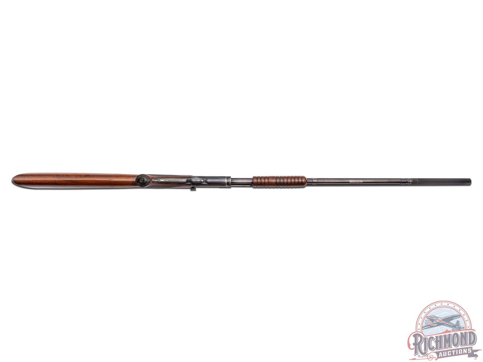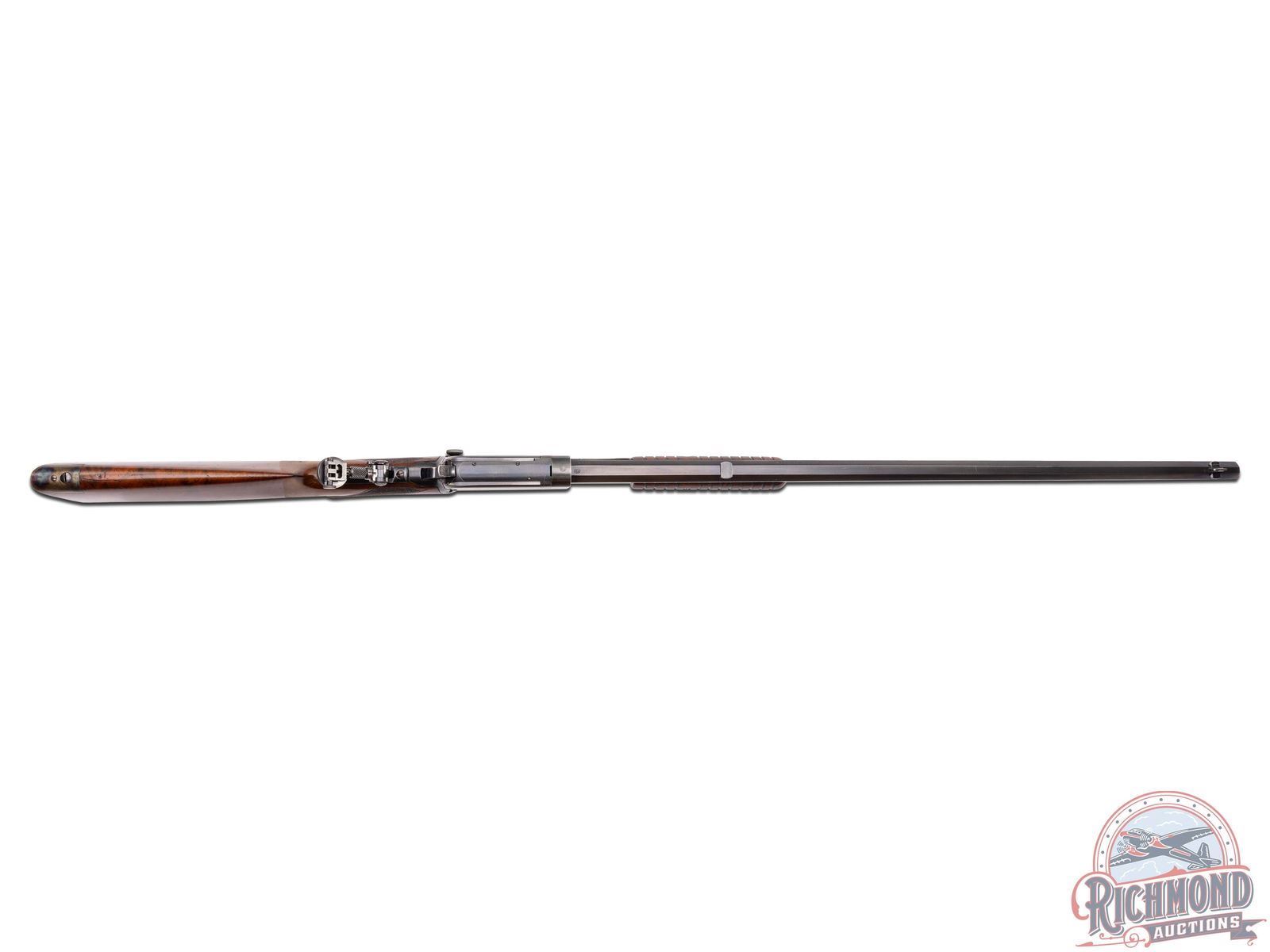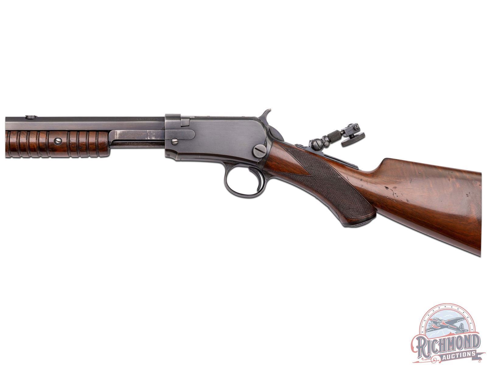 Manufactured in 1910. Features a 24" octagon barrel with a tang mounted Lyman peep sight and blade front sight with nickel bead. Barrel is stamped with the two line Winchester address on the left side flat. Caliber "22 W.R.F." stamped near the receiver as well as Winchester proof marks on barrel and receiver. Matching serial number stamped under the receiver and rear of trigger guard. Nicely figured walnut deluxe wood stock with hand-checkered pistol grip fitted with a factory Winchester pistol grip cap. Crescent case colored butt plate with brass gate and includes field cleaning rods. Twelve line ribbed walnut foregrip / slide. Deluxe 1890 models are hard to come by in this great of condition! CALIBER: 22 WRF. S/N: 445608. FFL STATUS: Curio & Relic.