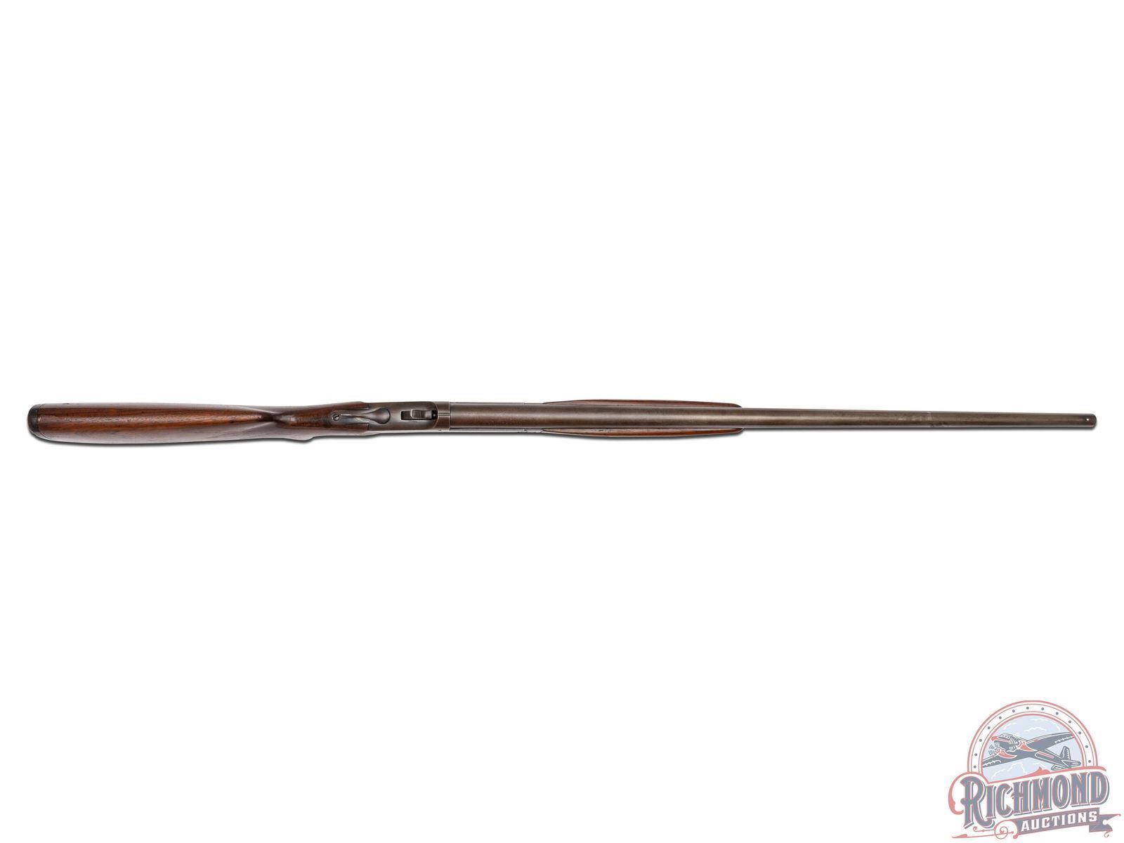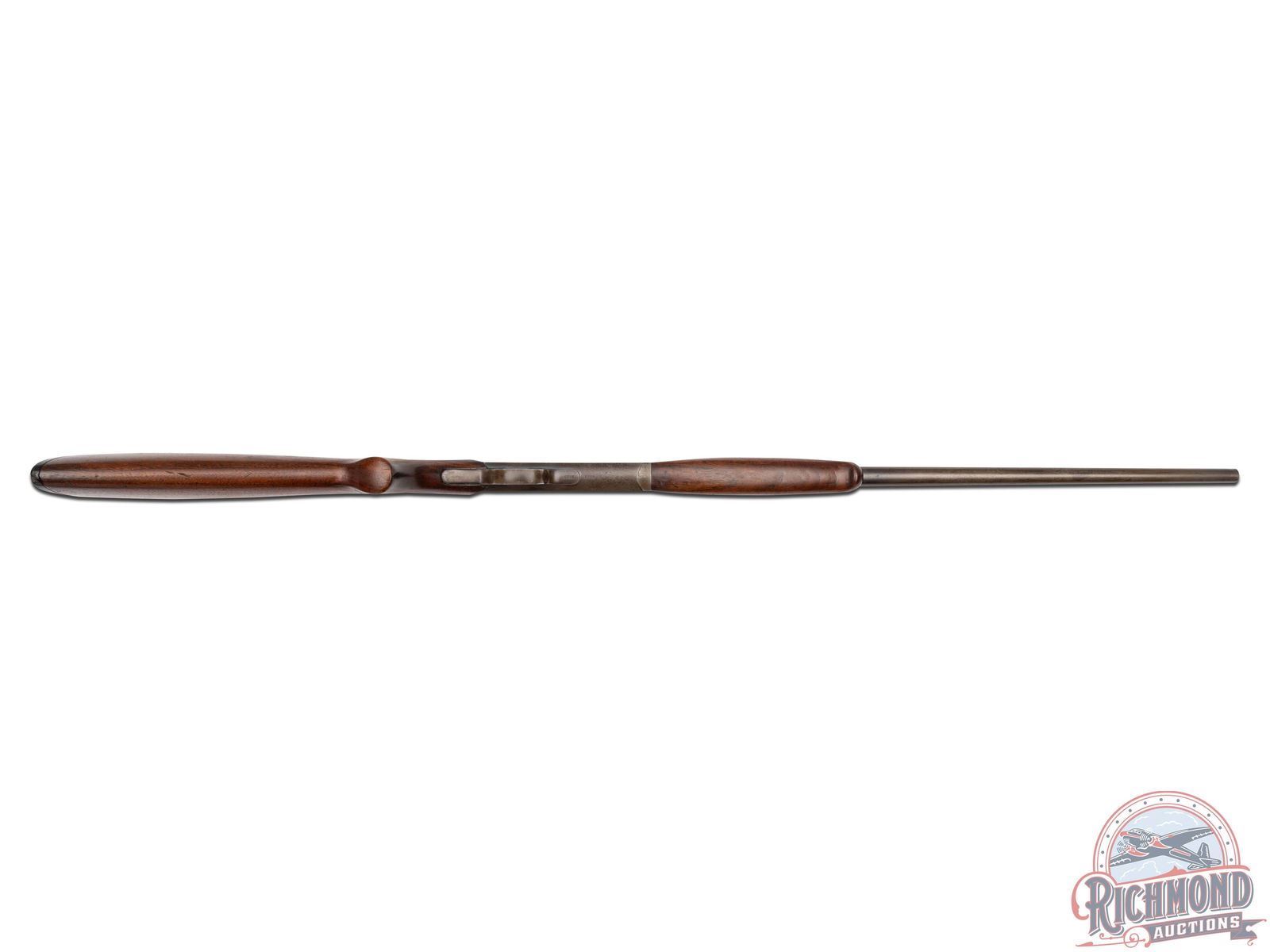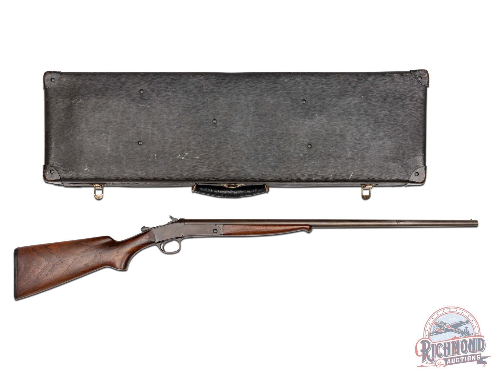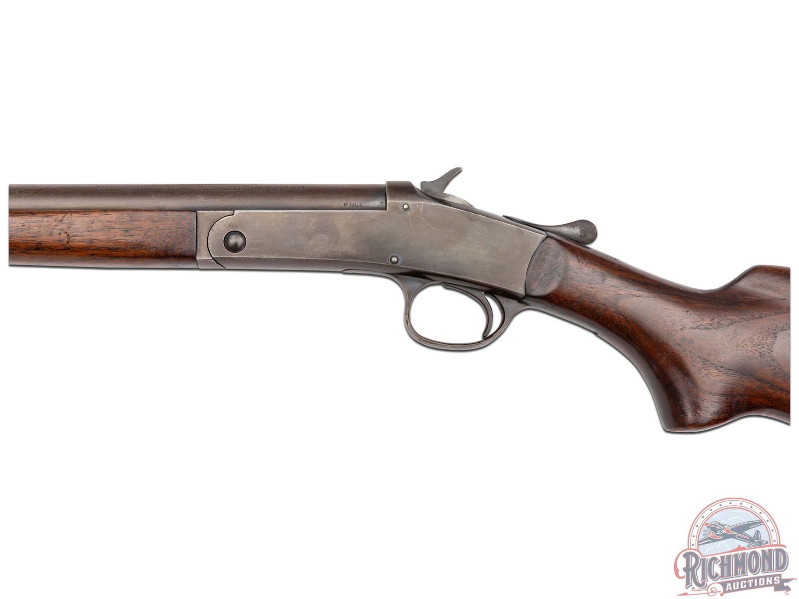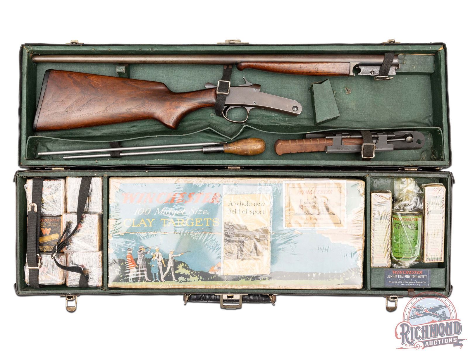Manufactured circa 1921. This rare set contains a Winchester model 20 single 26" barrel shotgun with full choke chambered for 2-1/2" shells with brass front bead and standard markings. Walnut butt stock with uncapped pistol grip and snap on Schnabel tip forearm. Fitted with a factory Winchester hard rubber butt plate. Included is a Winchester "Midget Hand Trap" with wooden handle for clay throwing. Six vintage 25 round boxes of Winchester brand 2-1/2" cardboard shell .410 gauge shells in yellow/black/red boxes. One box of Winchester brand Midge set Clay Targets. Gun cleaning rod with wood handle. Original Winchester "A whole new field of sport" brochure. Winchester "Metal Preparations" pamphlet. Period correct Winchester brand can of Gun Oil and two period correct boxes of Winchester Gun Grease. All comes in the original case with green textured paper lining. The original Winchester "Junior Trapshooting Outfit" label is still intact with a leather slip to lift and reveal a compartment below in the case. LOP: 13-1/8". CALIBER: 410. S/N: 5625. FFL STATUS: Curio & Relic.