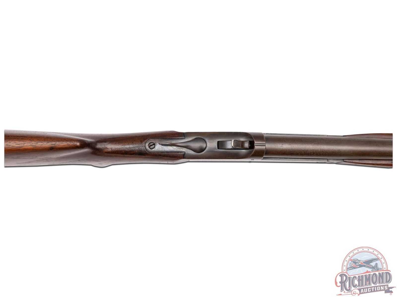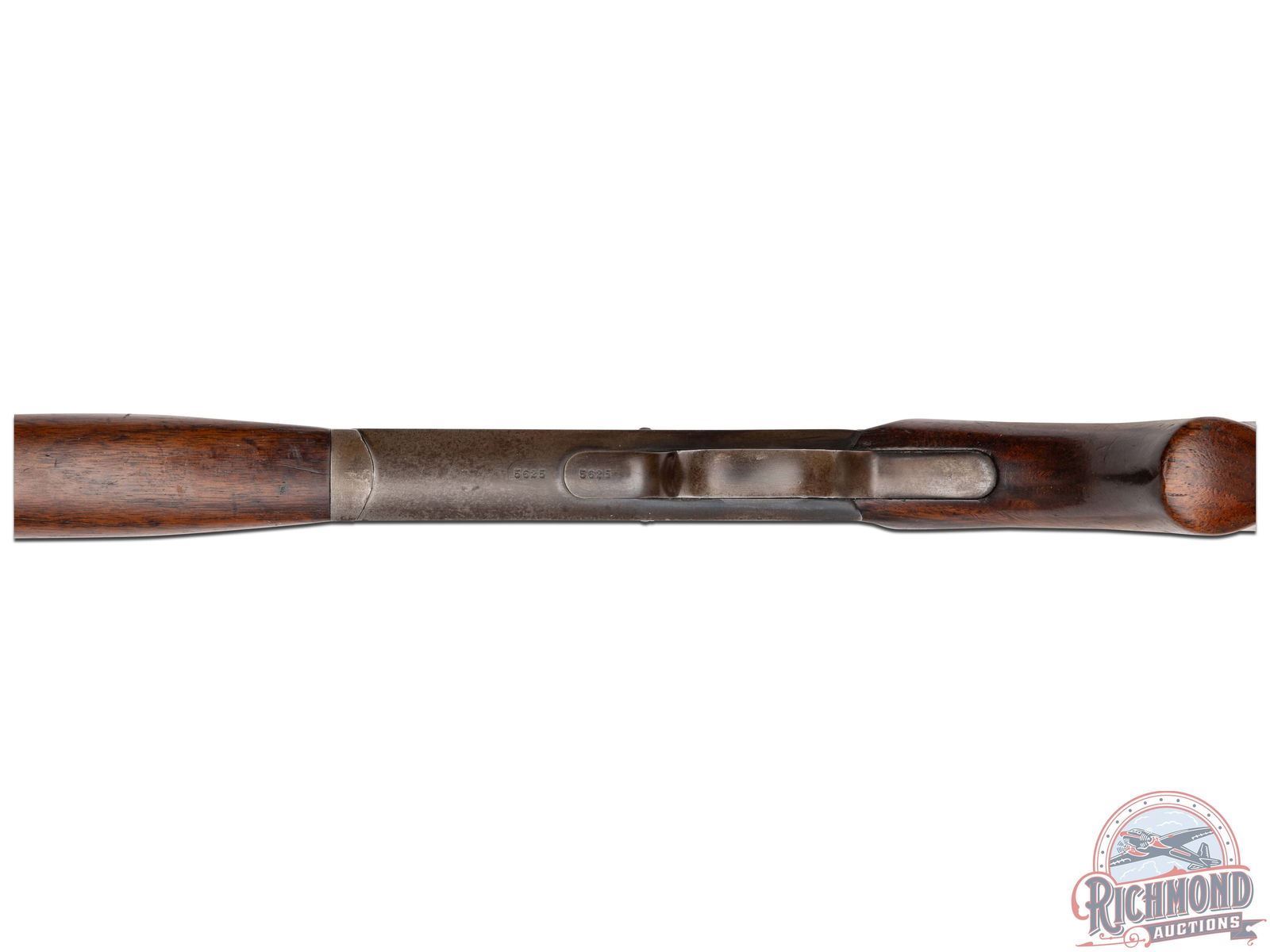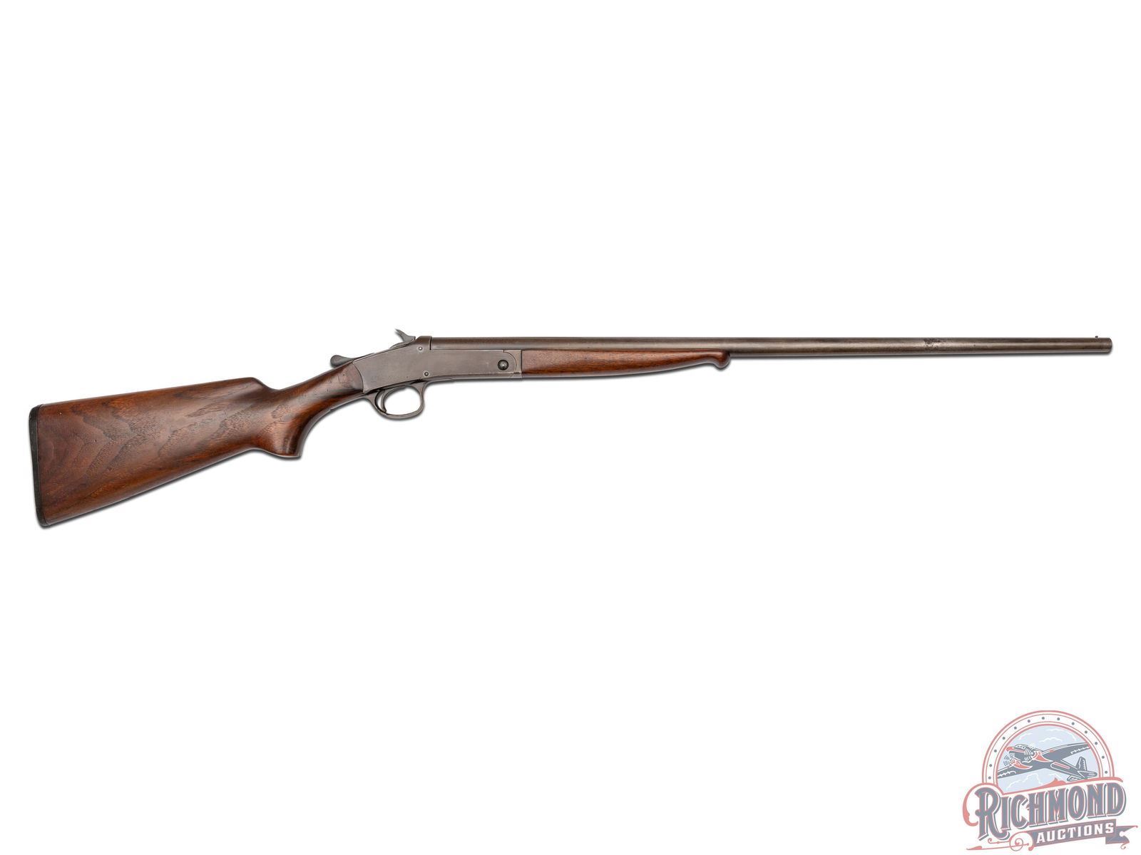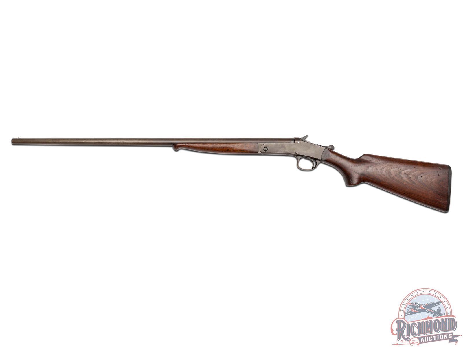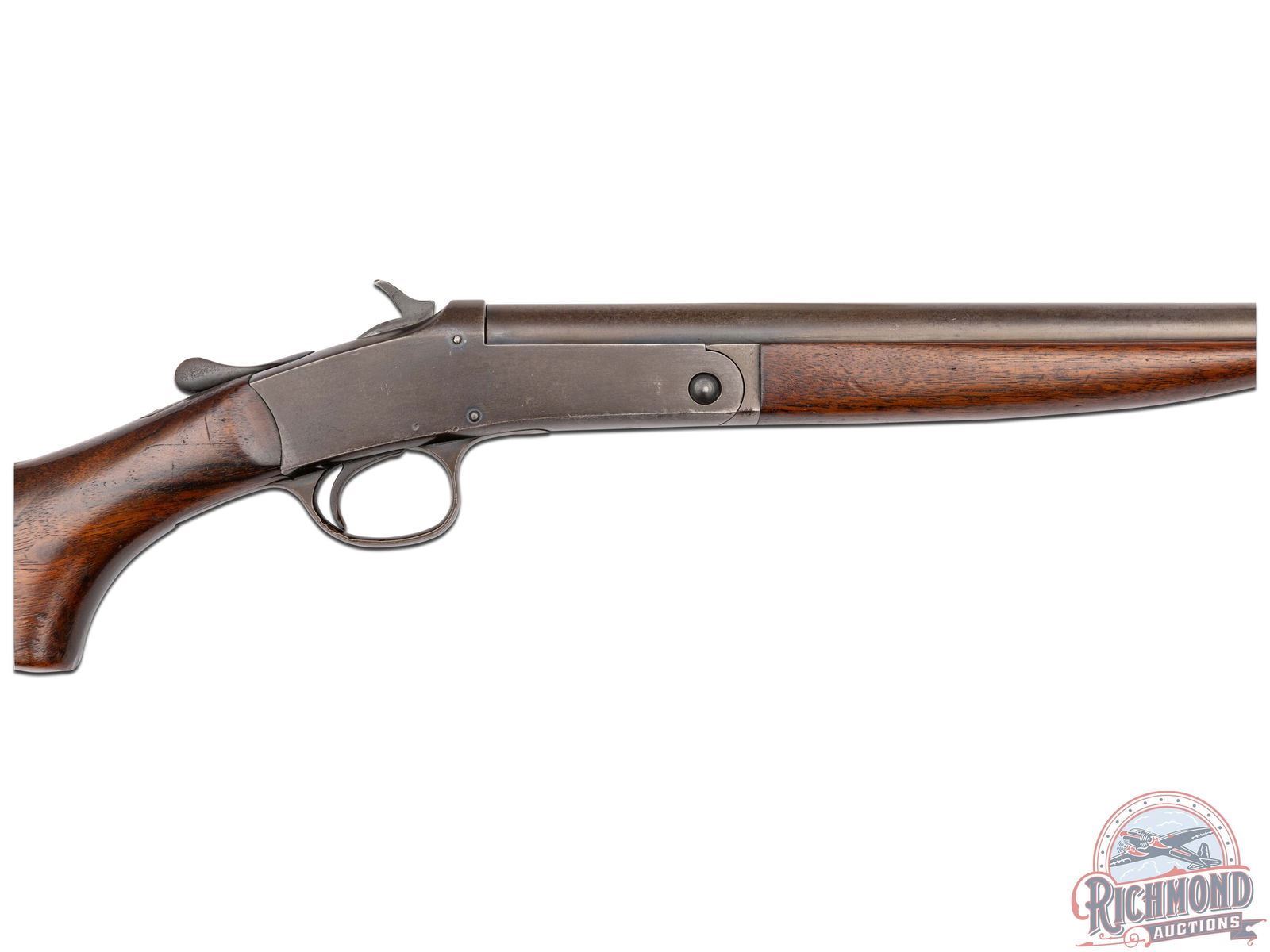 Manufactured circa 1921. This rare set contains a Winchester model 20 single 26" barrel shotgun with full choke chambered for 2-1/2" shells with brass front bead and standard markings. Walnut butt stock with uncapped pistol grip and snap on Schnabel tip forearm. Fitted with a factory Winchester hard rubber butt plate. Included is a Winchester "Midget Hand Trap" with wooden handle for clay throwing. Six vintage 25 round boxes of Winchester brand 2-1/2" cardboard shell .410 gauge shells in yellow/black/red boxes. One box of Winchester brand Midge set Clay Targets. Gun cleaning rod with wood handle. Original Winchester "A whole new field of sport" brochure. Winchester "Metal Preparations" pamphlet. Period correct Winchester brand can of Gun Oil and two period correct boxes of Winchester Gun Grease. All comes in the original case with green textured paper lining. The original Winchester "Junior Trapshooting Outfit" label is still intact with a leather slip to lift and reveal a compartment below in the case. LOP: 13-1/8". CALIBER: 410. S/N: 5625. FFL STATUS: Curio & Relic.