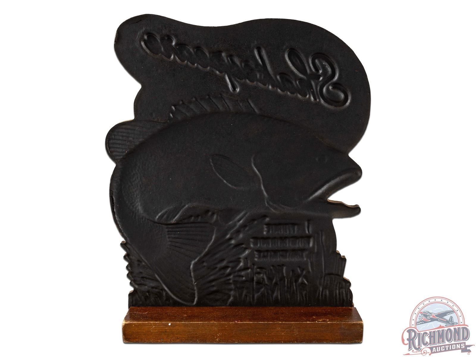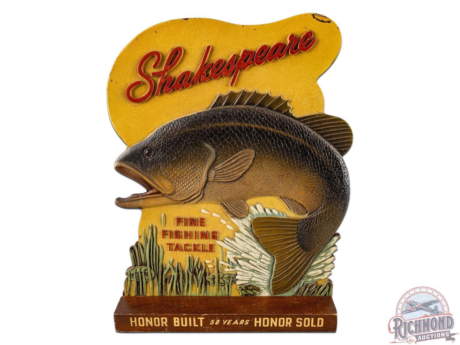 Excellent two-piece countertop display celebrating Shakespeare's 50 years, reading "Honor Built, 50 Years, Honor Sold." Exceptional molded graphics of a largemouth bass on the vertical die cut piece. Exhibits great color with age crackle in the yellow throughout. Detachable top is intact with a few minor nicks and dings around the top edge. Wood base is very nice with general age wear along the edges and corners. Text is clear, complete and legible. Overall, an exceptional Shakespeare sign and the only example we have seen. 11" H x 8" W x 2.75" D.