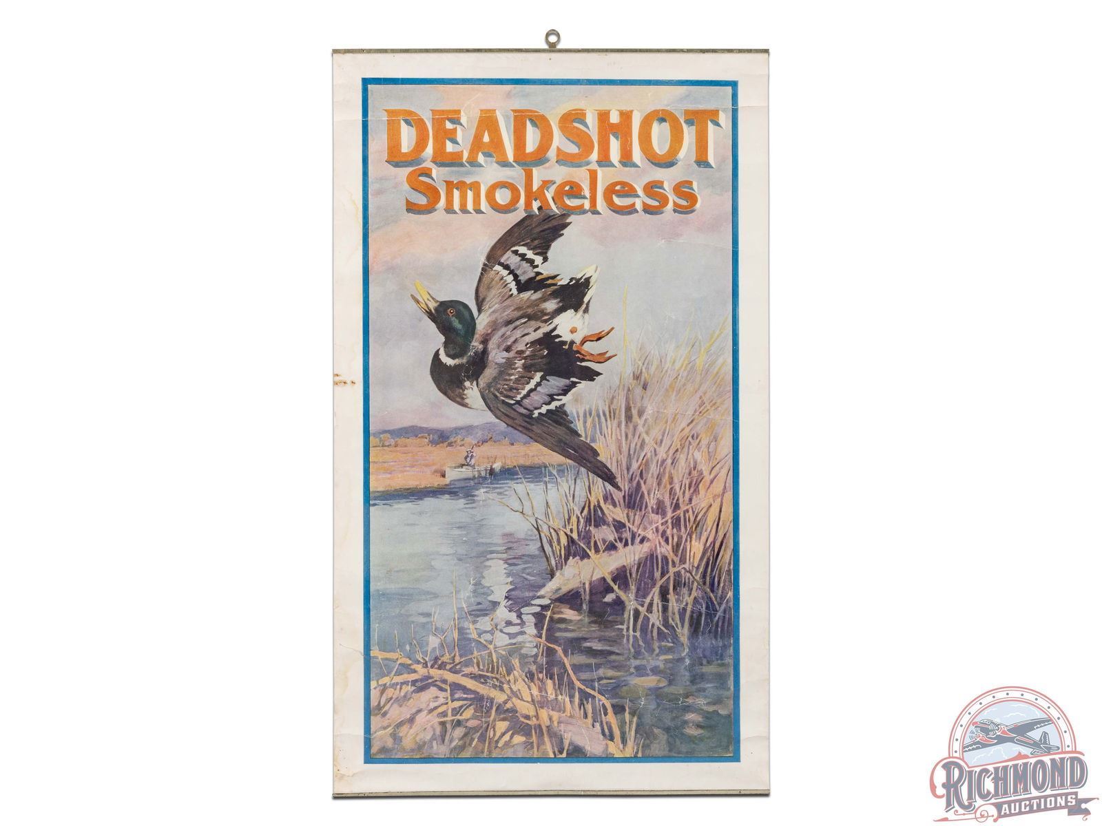 Hard to find paper lithograph poster sign featuring a falling Mallard and a successful hunter on his boat. Excellent graphics and good colors. The poster has multiple creases and tears throughout with some spotting and water damage, predominately along the left border. Includes top and bottom bands. Shrink wrapped and secured to foamboard. Overall, a desirable and seldom seen poster. 24" H x 14" W.