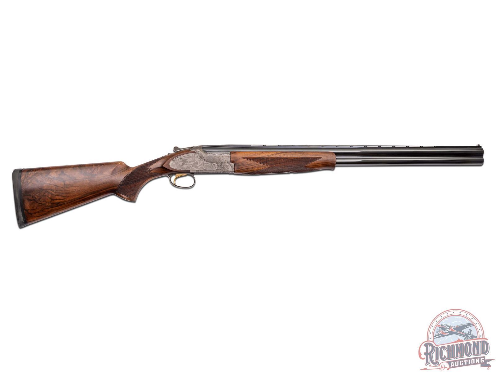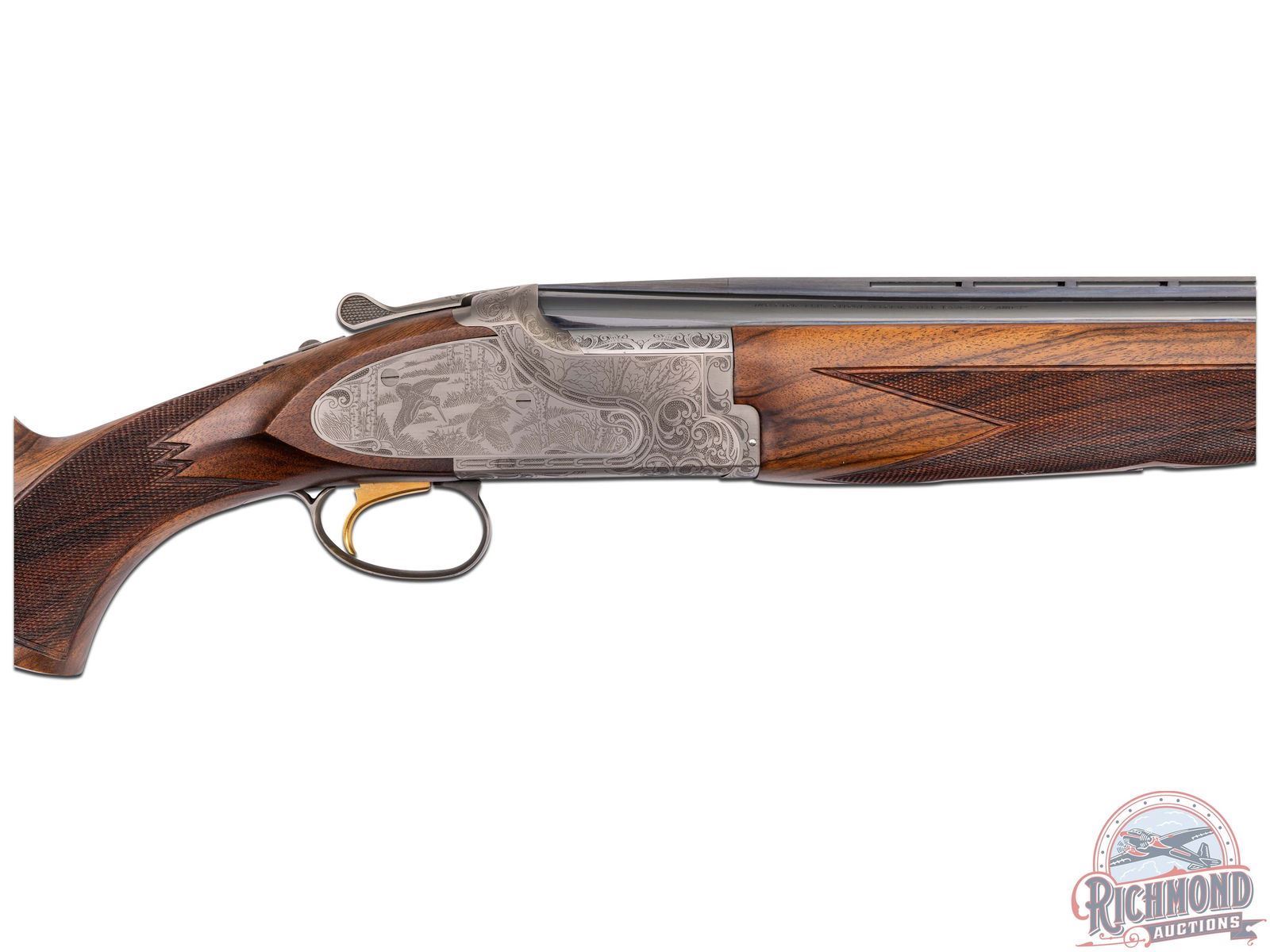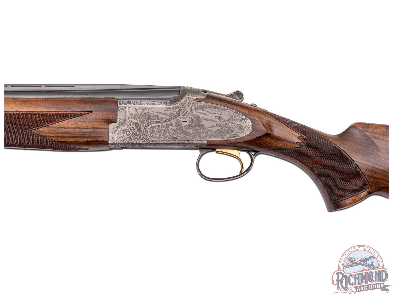 Made in Japan by Browning in 2000. This model was only made between 2000-2003. 28" blued fluid steel barrels in 12 gauge with Invector chokes, ejectors, and 3" chambers with Browning Utah and Montreal Addresses. Satin finished floral engraved action with side plates featuring woodcock scene on right and pheasant on left and floral scene with "Privilege" on bottom. Action has gold washed single selective trigger, top tang safety selector, and satin finished Browning Deerhead Logo trigger guard. Fine Circassian walnut checkered pistol grip stock with German silver oval vanity plate, and Browning hard rubber recoil pad. Matching walnut checkered Schnabel forearm with latch release. LOP: 14-1/4". DAC: 1-1/2". DAH: 2". CALIBER: 12 GA. S/N: 08334MZ131. FFL STATUS: Modern.