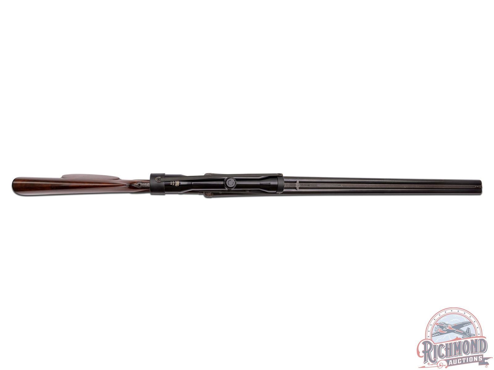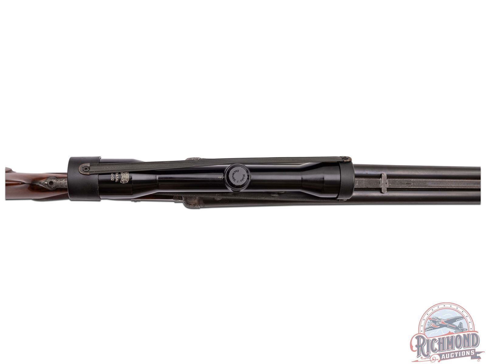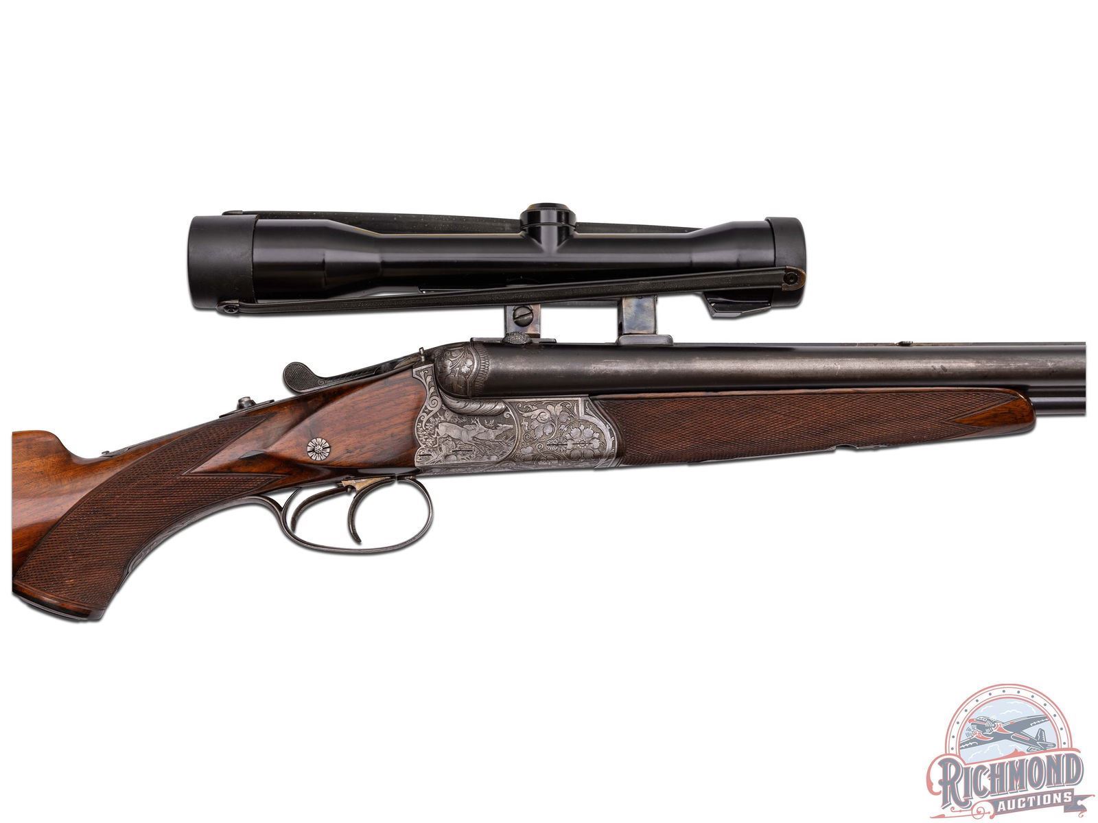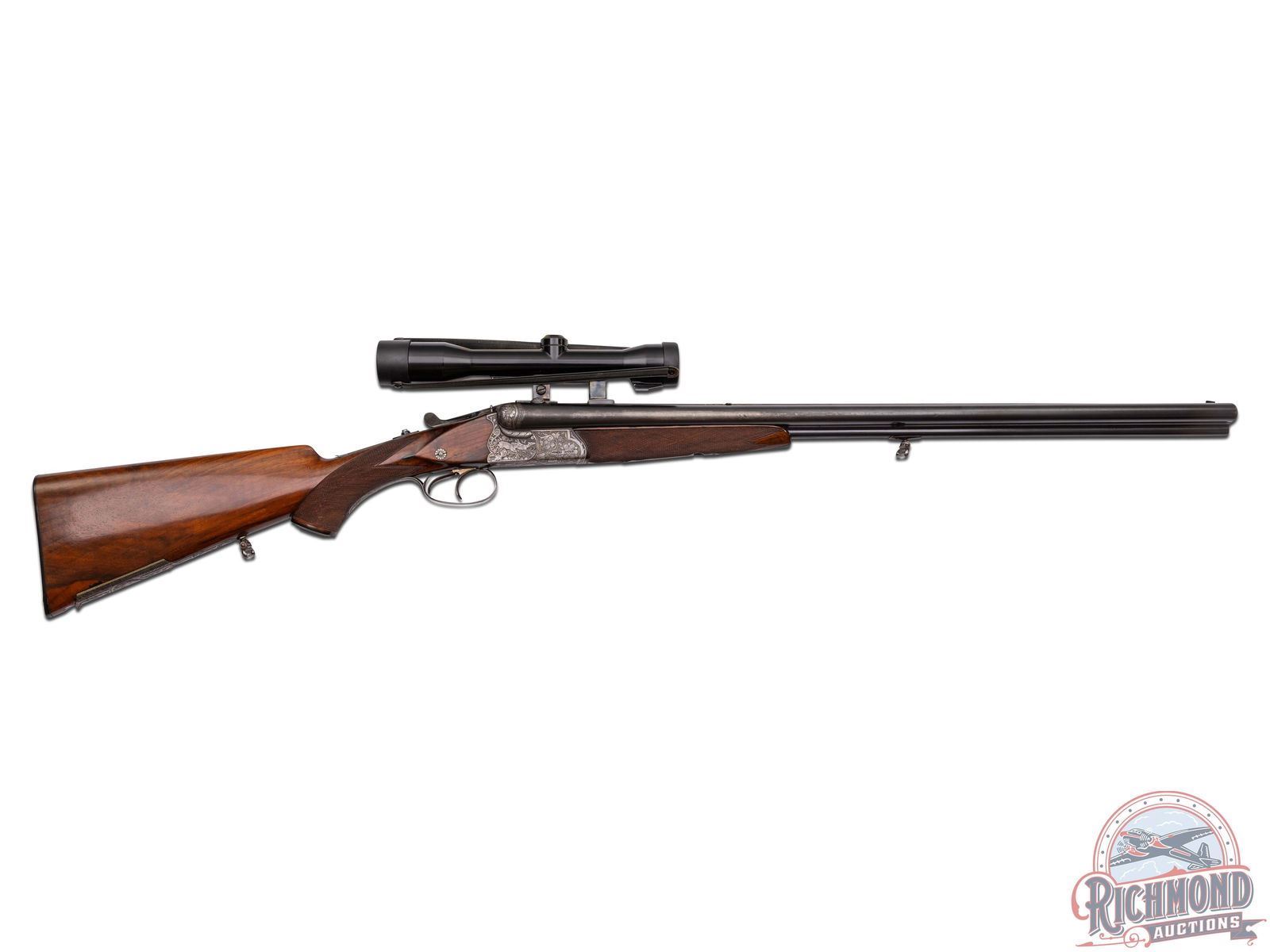 Made in Germany and marked F.R. Menzel, who was most likely a Sporting Goods Dealer with gun probably made by Heinrich Kreighoff as evident with a "HK" mark on the barrel flats. Made circa 1925. 26-3/4" blued Krupp steel barrels marked on matted rib "Fr. Menzel Stuttgart" with rifle sights, extractors, and with 16 gauge side by side barrels over 8x57JR caliber rifle barrel. Barrels fitted with claw mounts, new made claws, and Post-War Hensoldt 4x32 scope. Coin finished game scene engraved scalloped action with side clips, cocking indicators, double triggers (front is set), Greener crossbolt and safety, and tang hidden peep sight. Action has hirsch scene on left side and raybuck on right in floral background. Bottom of action is floral engraved with dog clutching a bird and the phrase "Original Anson & Deeley System". Walnut checkered pistol grip stock with right handed cheekpiece, bullet trap, and horn butt plate and grip cap. Matching checkered splinter forearm with ebony tip inlay and Anson & Deeley release latch. LOP: 14". DAC: 1-5/8". DAH: 2-5/8". CALIBER: 16/8x57JR. S/N: 7464. FFL STATUS: Curio & Relic.