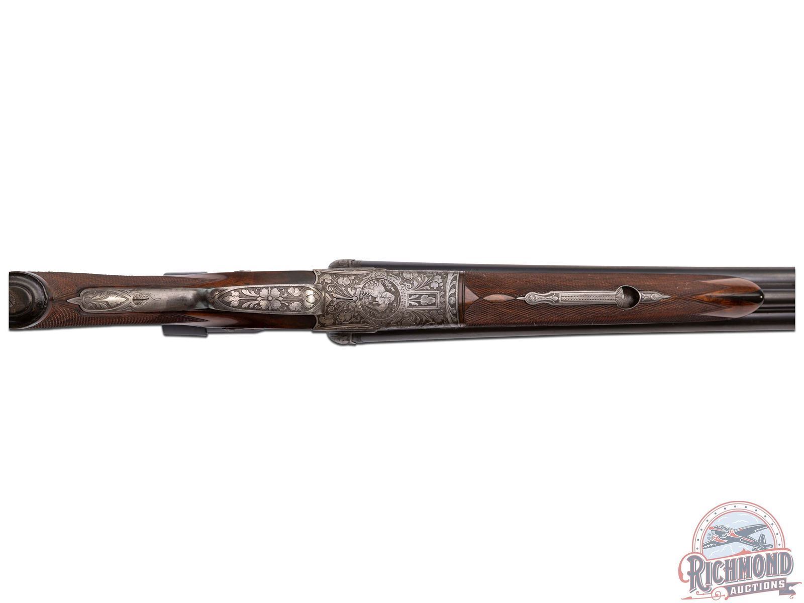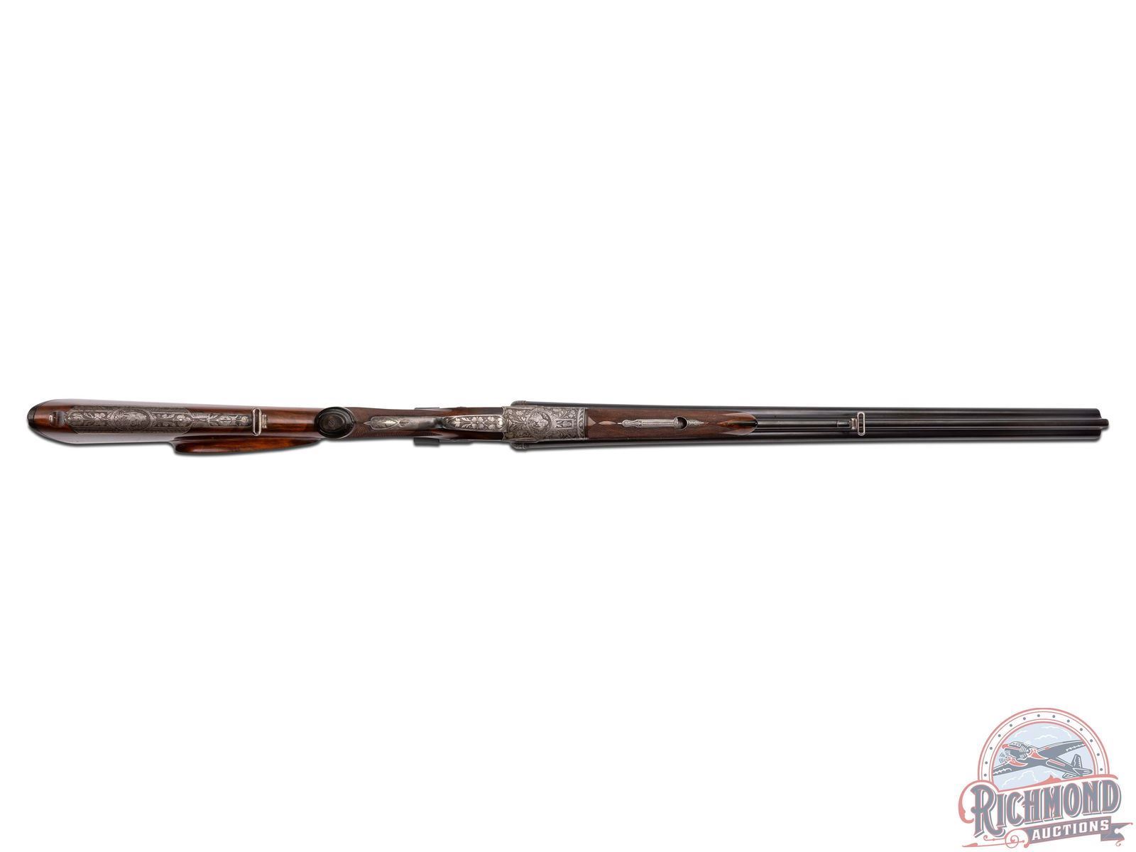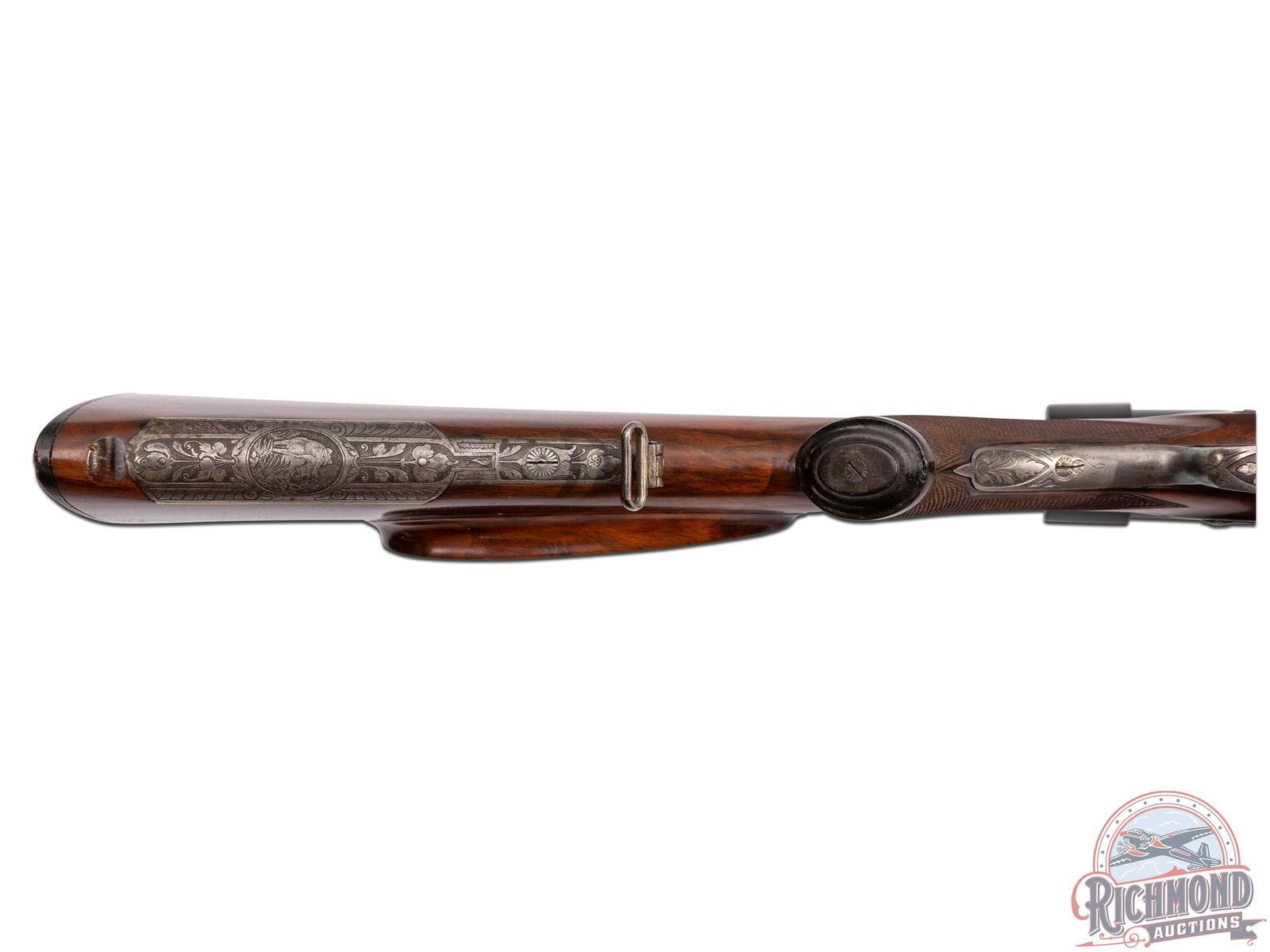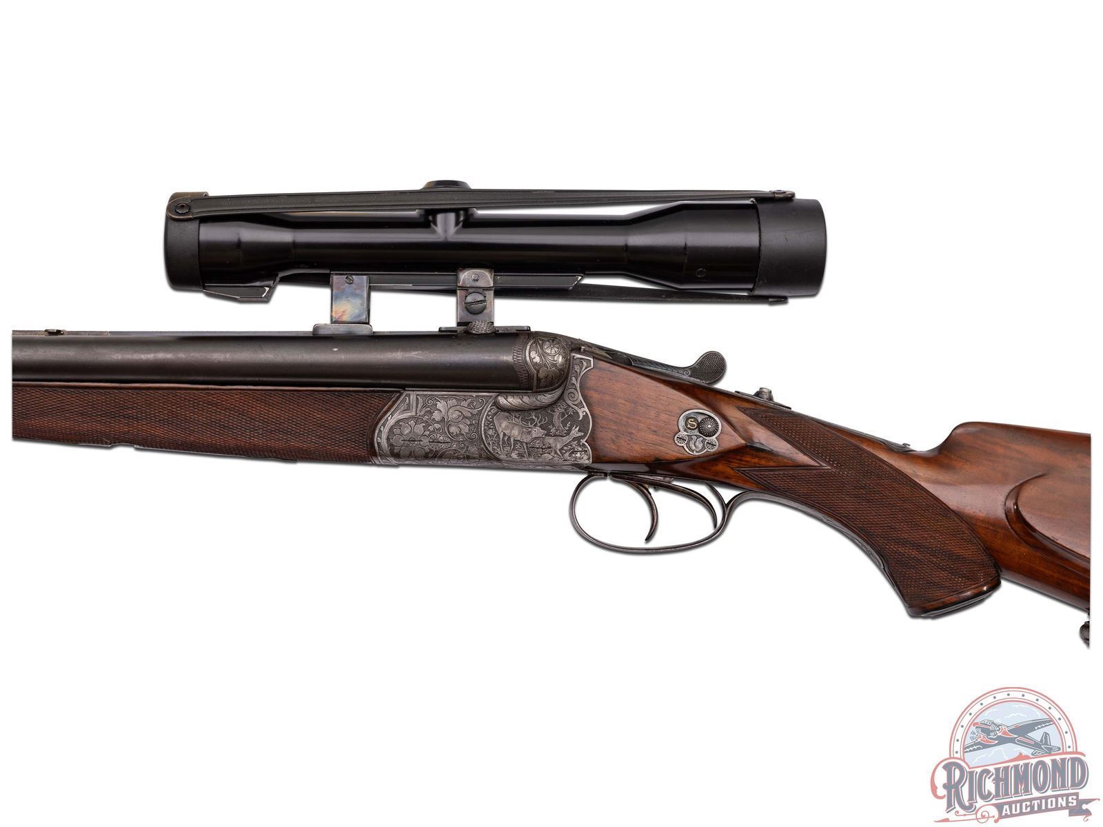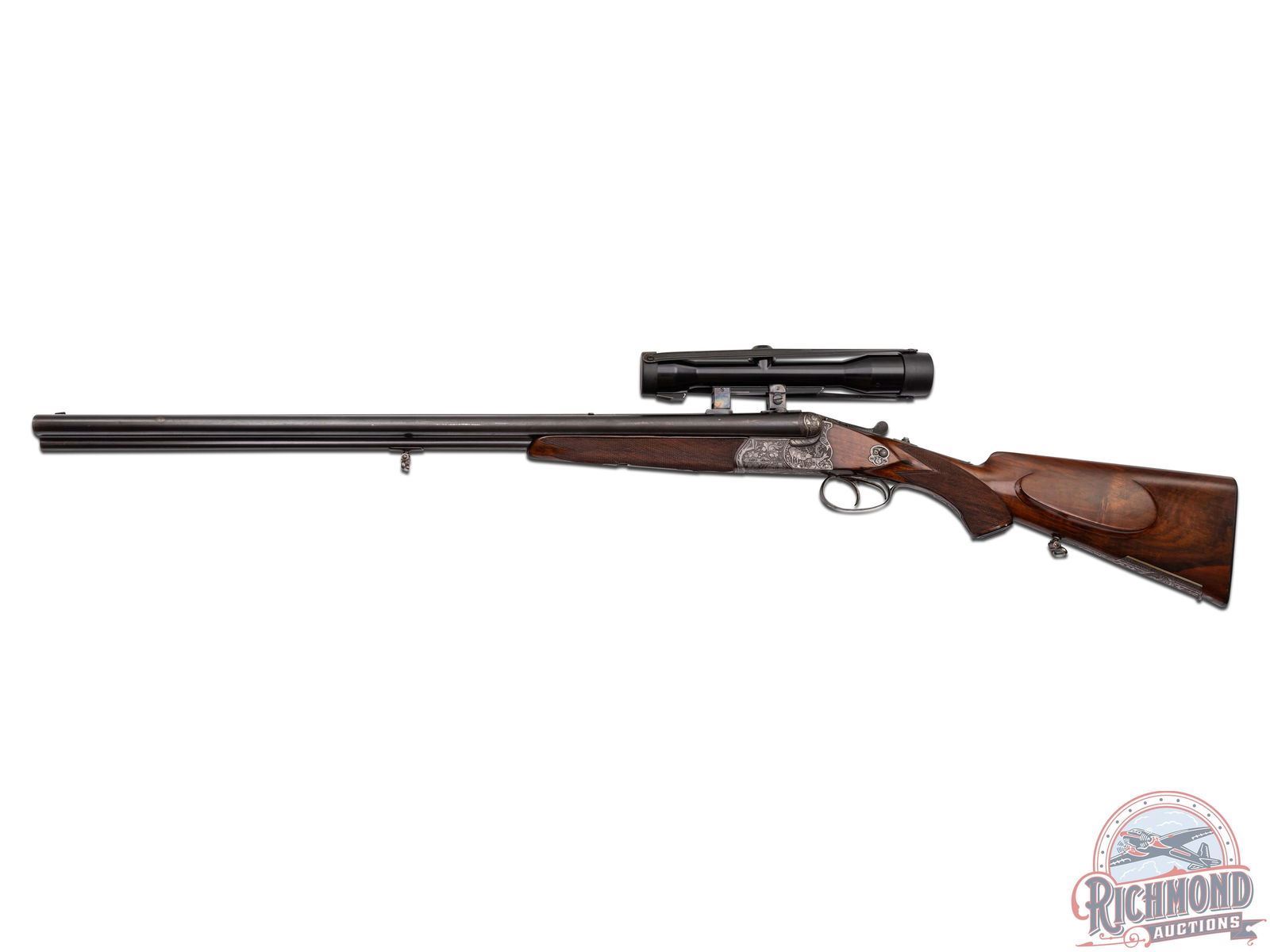Made in Germany and marked F.R. Menzel, who was most likely a Sporting Goods Dealer with gun probably made by Heinrich Kreighoff as evident with a "HK" mark on the barrel flats. Made circa 1925. 26-3/4" blued Krupp steel barrels marked on matted rib "Fr. Menzel Stuttgart" with rifle sights, extractors, and with 16 gauge side by side barrels over 8x57JR caliber rifle barrel. Barrels fitted with claw mounts, new made claws, and Post-War Hensoldt 4x32 scope. Coin finished game scene engraved scalloped action with side clips, cocking indicators, double triggers (front is set), Greener crossbolt and safety, and tang hidden peep sight. Action has hirsch scene on left side and raybuck on right in floral background. Bottom of action is floral engraved with dog clutching a bird and the phrase "Original Anson & Deeley System". Walnut checkered pistol grip stock with right handed cheekpiece, bullet trap, and horn butt plate and grip cap. Matching checkered splinter forearm with ebony tip inlay and Anson & Deeley release latch. LOP: 14". DAC: 1-5/8". DAH: 2-5/8". CALIBER: 16/8x57JR. S/N: 7464. FFL STATUS: Curio & Relic.