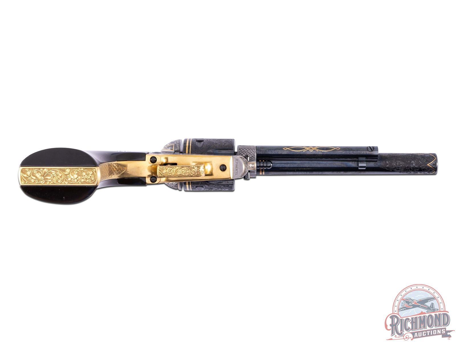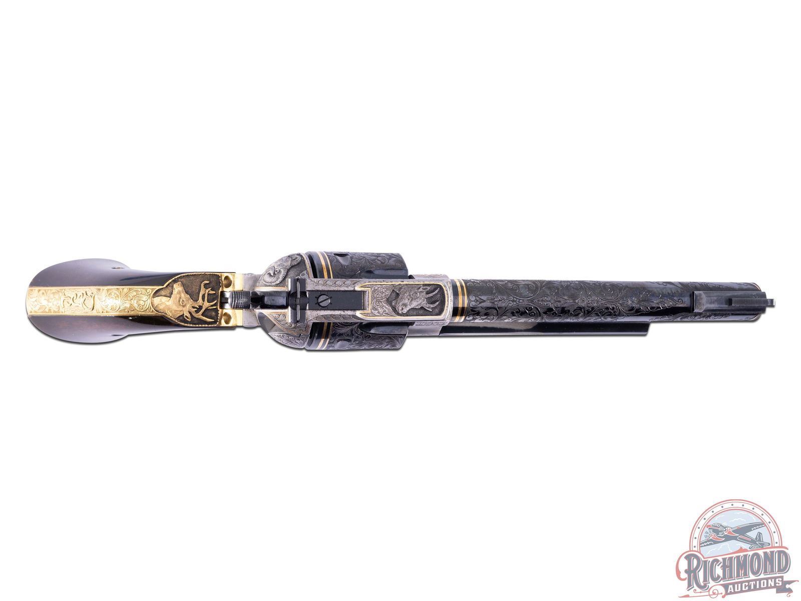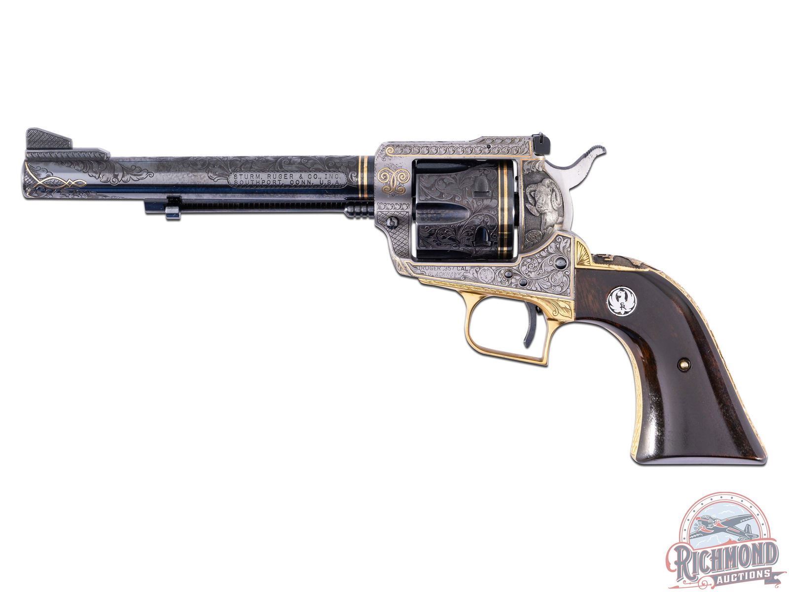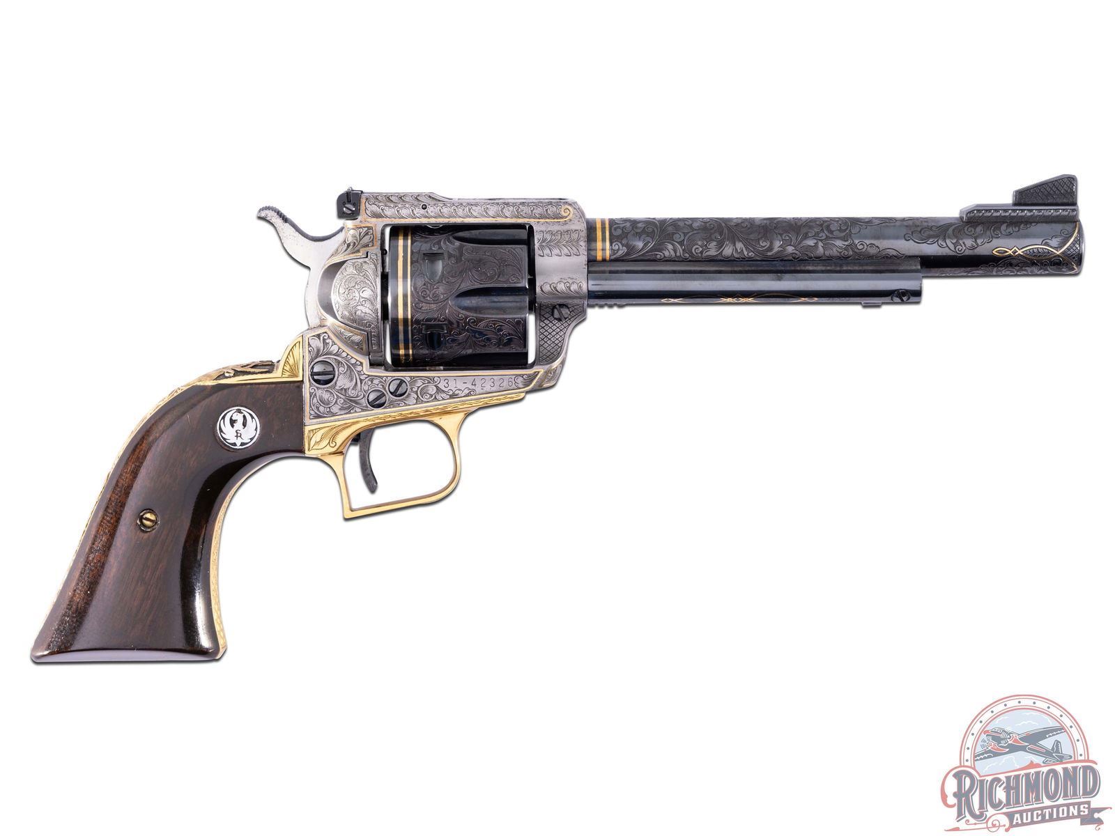 Manufactured in 1973 by Sturm, Ruger & Co. A true work of art by the late Franz Marktl! Features a blued 6.-1/2" barrel with 80% engraved coverage. Rear notch adjustable sight and ramp blade front sight. Engraving on the barrel features a floral scroll design with punch dot background. Gold scroll inlaid around the muzzle end and a double line gold inlaid near the frame, as well as a scroll pattern on the ejector shroud. The front ramp is engraved on the sides with a floral border and basketweave pattern. Six round fluted cylinder features matching floral scroll engraving with a double lined gold inlay at the rear. Coin Finished receiver and loading gate features 90% engraved coverage with matching floral scroll design, floral border and basketweave pattern with gold inlay border lines and a scroll design on the left front side. The top of the frame features a very detailed mountain goat head. Opposite of the loading gate features a detailed big horn sheep head. Bottom of the receiver is signed "F.MARKTL". Gold washed frame has 75% engraved coverage with matching floral scroll design, floral borders and basketweave pattern. Top of the backstrap features a detailed buck head. Fitted with smooth dark walnut wood grips with the Ruger Phoenix silver tone medallions. Franz Marktl was a Master Engraver artist and one of the last European trained Engravers with works commissioned by royalty and US Presidents. His works are rarely found on auction because of the high quality and attention to detail that many high end collectors seek out. His works have been showcased in the Metropolitan Museum of Art and the Smithsonian Museum. CALIBER: 357 MAG. S/N: 31-42326. FFL STATUS: Curio & Relic.