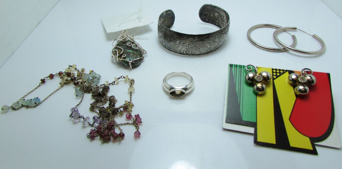 Collection Includes: Sterling Silver Bangle (monogrammed), Sterling Silver Wire Pendant With Moss Agate, Sterling Silver Tube Hoops, Silver Ring With Marquise Shaped Orange Stone (Size7), 36" Silver Strand With Multi Colour Beads, Boyd Bond Sterling Silver Screw On Earrings