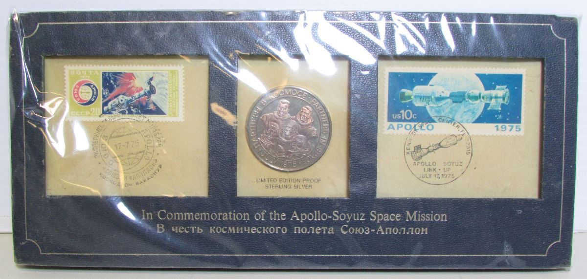 Sterling Silver Proof Coin - Commemoration Of The Apollo-Soyuz Space Mission - With 2 Stamps