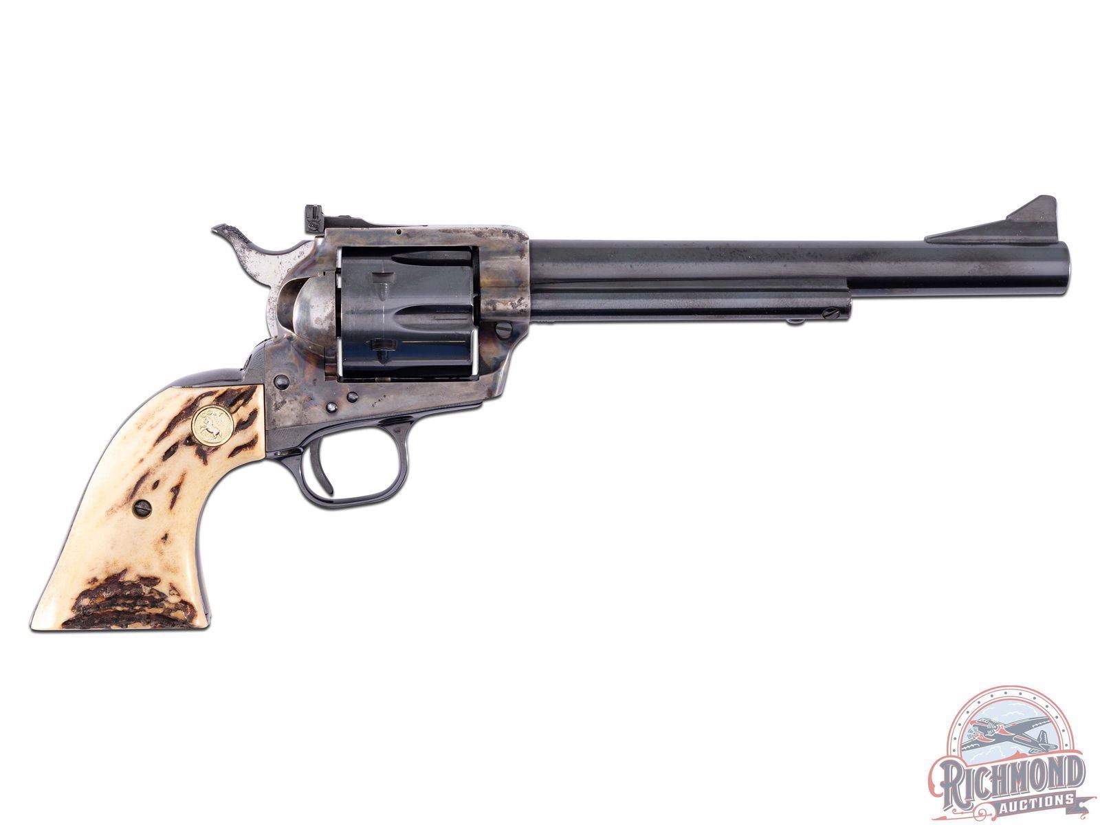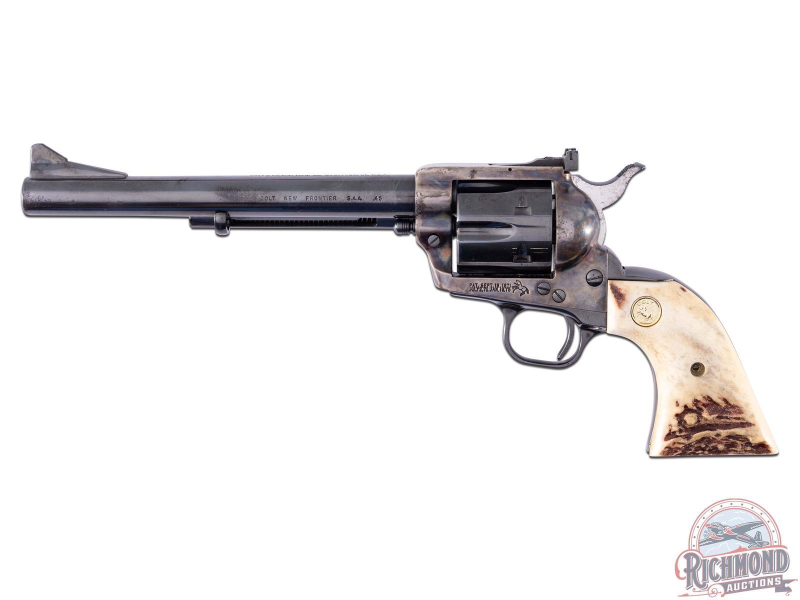 Manufactured in 1965. This beautiful revolver features a blued 7-1/2" barrel with rear adjustable notch sight and ramped blade front sight. Stamped on the left side of the barrel "COLT NEW FRONTIER S.A.A. .44 SPECIAL" and Colt's single line address on the top. Vibrant case colored receiver surrounds a blued 6-round fluted cylinder. Blued trigger guard and grip straps. Fitted with Colt factory stag grips and gold tone Colt medallions. CALIBER: 45 Colt. S/N: 05362NF. FFL STATUS: Curio & Relic.