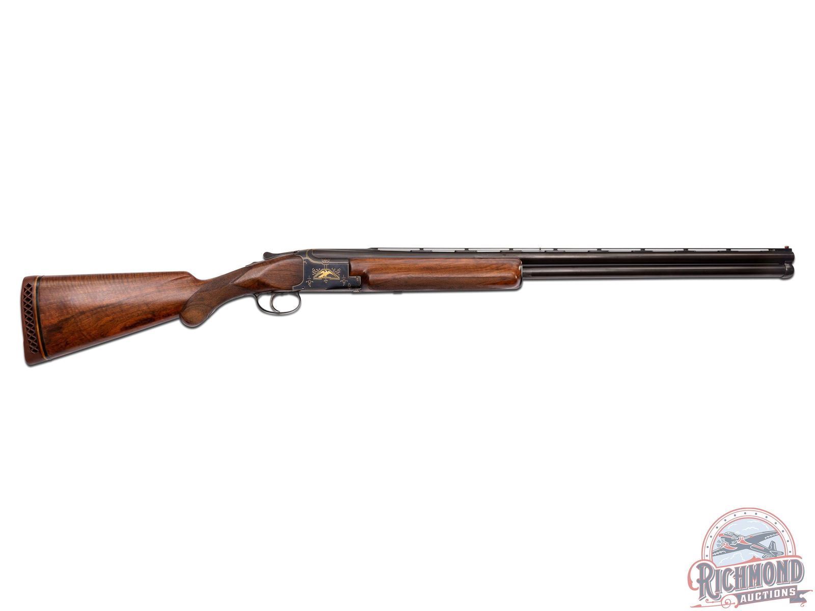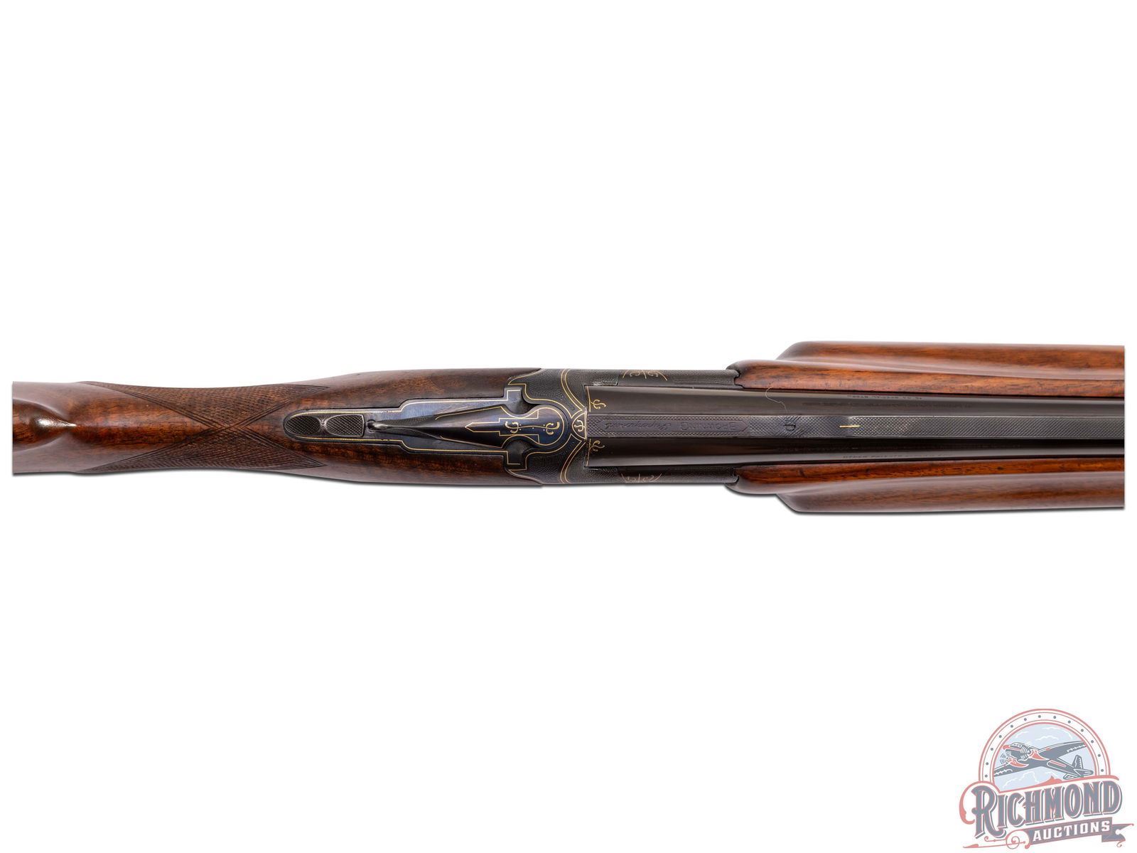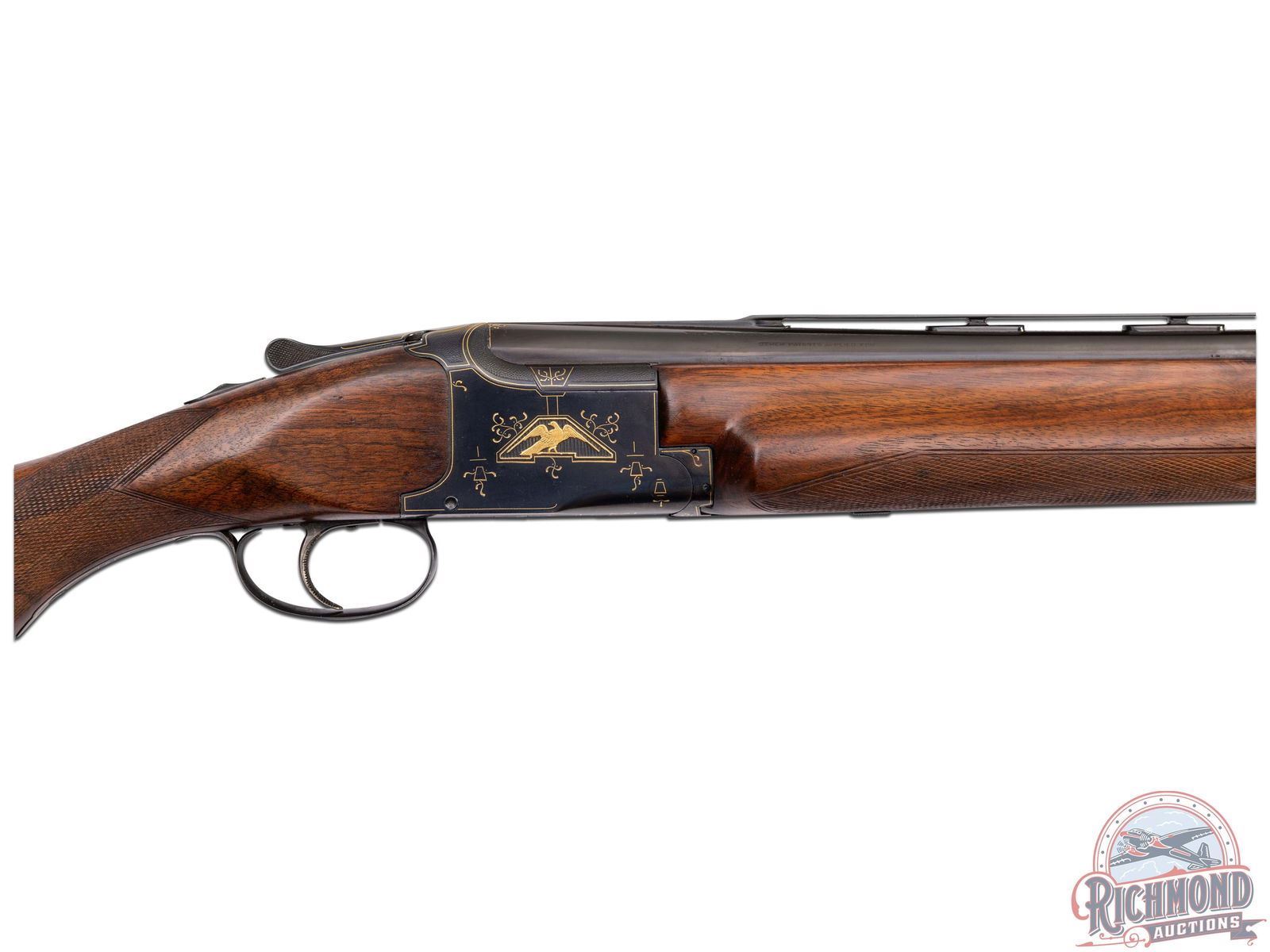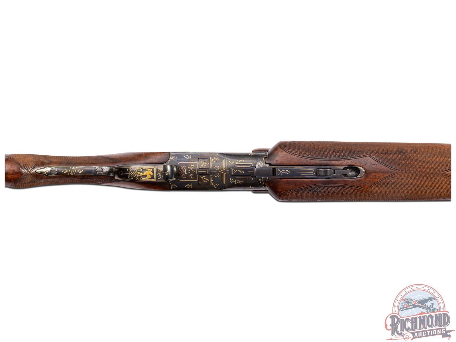 Made in Belgium by Browning in 1933. Super rare and hard to find Pre-war Browning Midas Grade. 30" Special Steel 12 gauge barrels with 2-3/4" chambers, ejectors, and marked full and modified chokes. Barrels fitted with ventilated rib with Lyman Red Hi-Viz front sight and mid-bead sight and marked with "Browning SUPERPOSE" at breech with Gold line work on lugs, breeches, rib, and barrel stops. Barrels are spaced with no rib, a unique feature. Blued boxlock action with Pre-War "Art Deco" gold work with gold birds triangle on side panels and trigger guard bow. Bottom of action features line gold work. Action has Browning single selective triggers and non-automatic safety. Type T dimension Tiger Striped walnut long tang round knob pistol grip stock with period added white line recoil pad. Matching walnut checkered competition type attached latch release forearm horse shoe plate. Pad and forearm may have been special order. This was the top-of-the-line in 1933 from Browning. LOP: 14". DAC: 1-1/2". DAH: 1-3/4". CALIBER: 12 GA. S/N: 4138. FFL STATUS: Curio & Relic.