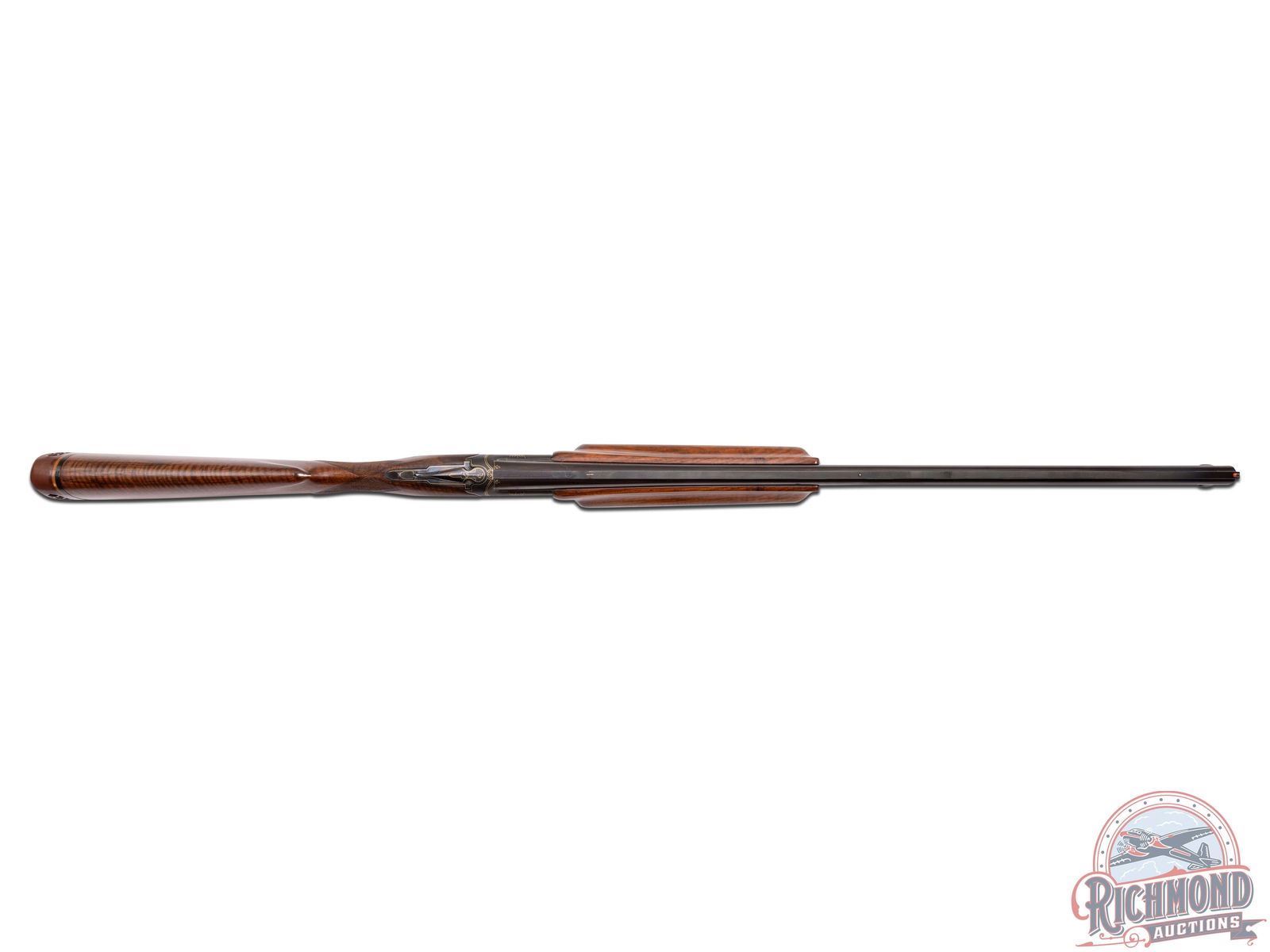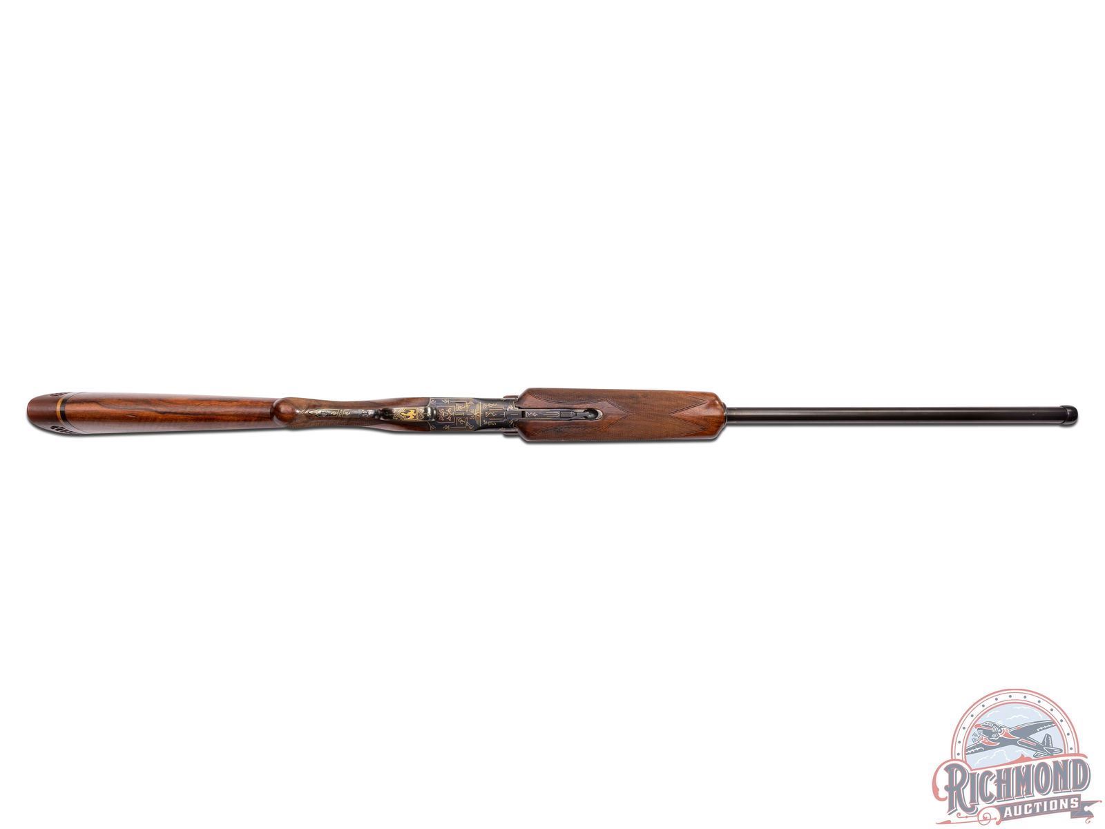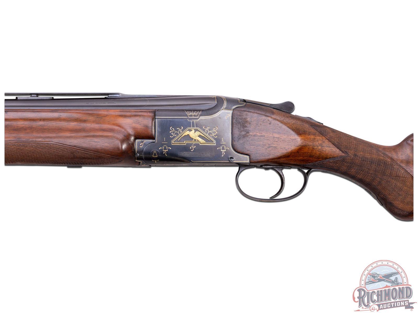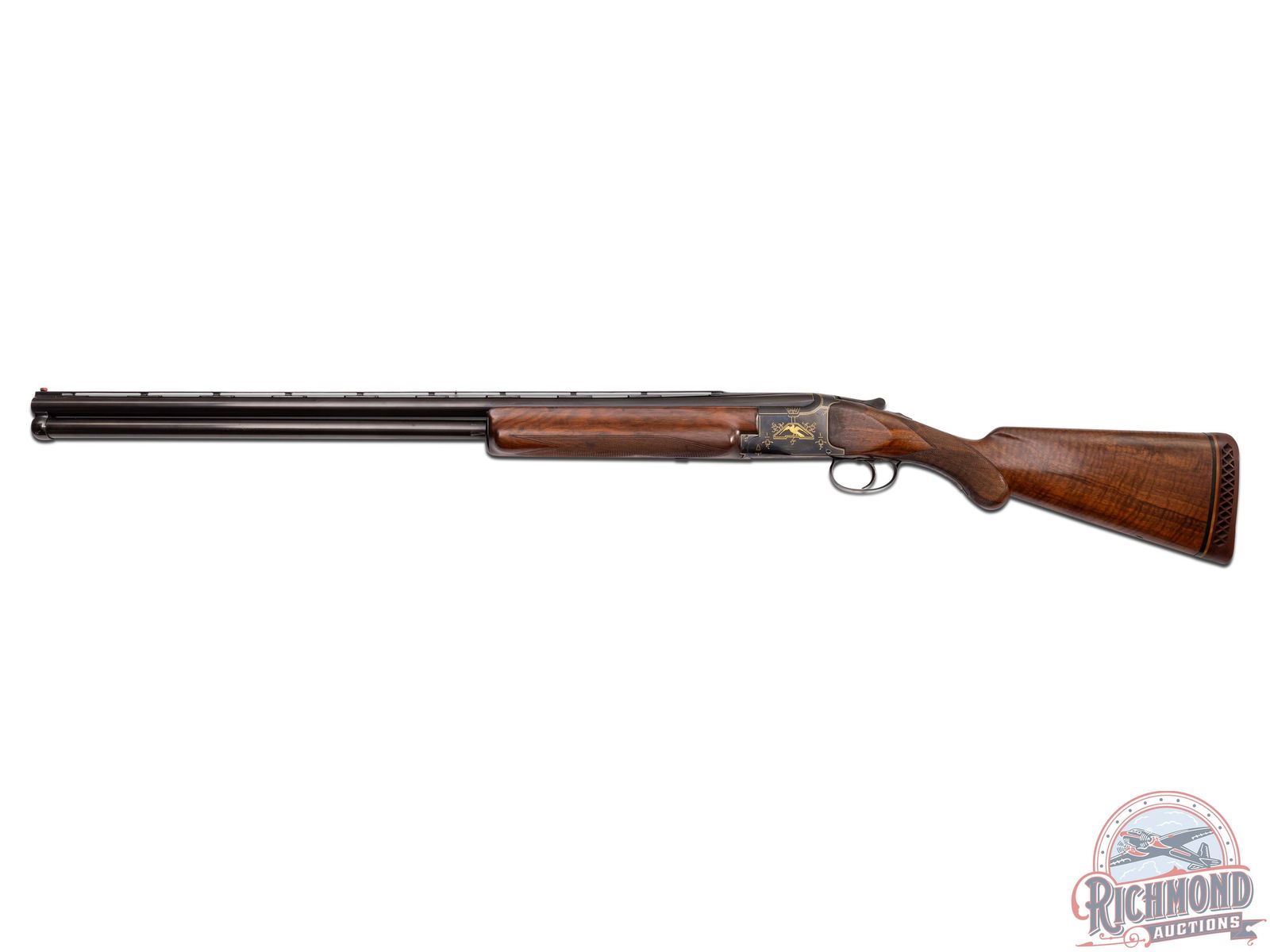 Made in Belgium by Browning in 1933. Super rare and hard to find Pre-war Browning Midas Grade. 30" Special Steel 12 gauge barrels with 2-3/4" chambers, ejectors, and marked full and modified chokes. Barrels fitted with ventilated rib with Lyman Red Hi-Viz front sight and mid-bead sight and marked with "Browning SUPERPOSE" at breech with Gold line work on lugs, breeches, rib, and barrel stops. Barrels are spaced with no rib, a unique feature. Blued boxlock action with Pre-War "Art Deco" gold work with gold birds triangle on side panels and trigger guard bow. Bottom of action features line gold work. Action has Browning single selective triggers and non-automatic safety. Type T dimension Tiger Striped walnut long tang round knob pistol grip stock with period added white line recoil pad. Matching walnut checkered competition type attached latch release forearm horse shoe plate. Pad and forearm may have been special order. This was the top-of-the-line in 1933 from Browning. LOP: 14". DAC: 1-1/2". DAH: 1-3/4". CALIBER: 12 GA. S/N: 4138. FFL STATUS: Curio & Relic.