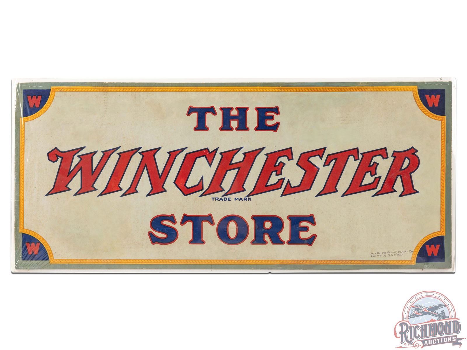 Early cardboard Winchester Store sign with strong colors. Nice condition overall with some general age related wear including a few creases, mild spotting, and edge wear. The bottom left corner appears to have minor spots of older touch-up. Handwritten along the bottom right corner reads, "From the old Baldwin Hardware Store. Given to us by Kelly Dickson." Shrink wrapped and secured to foamboard. 15.75" H x 36.5" W.