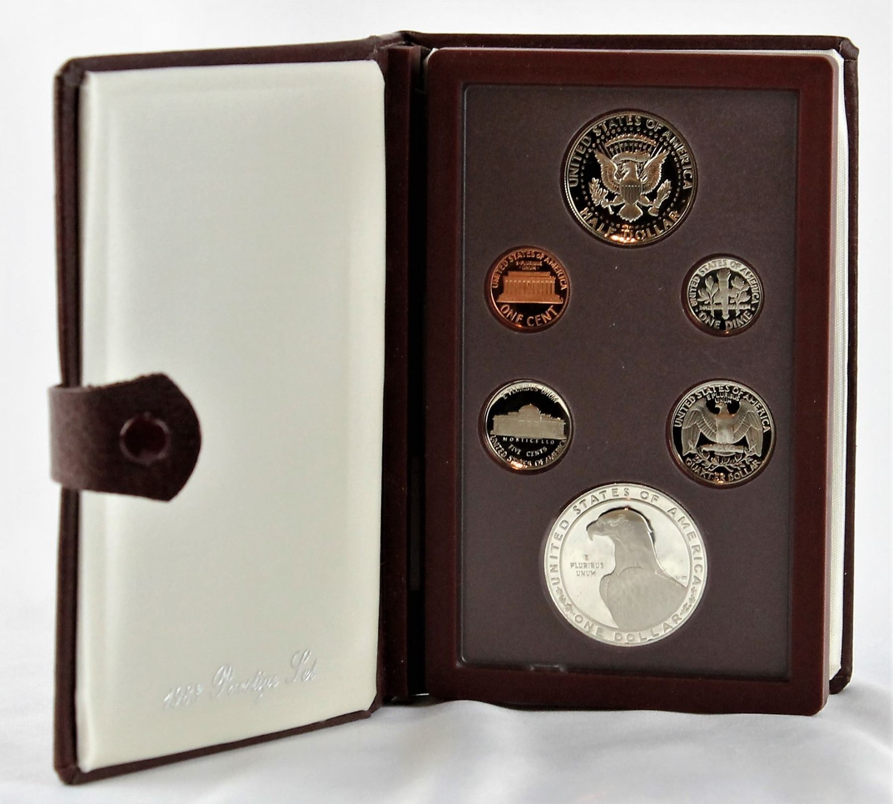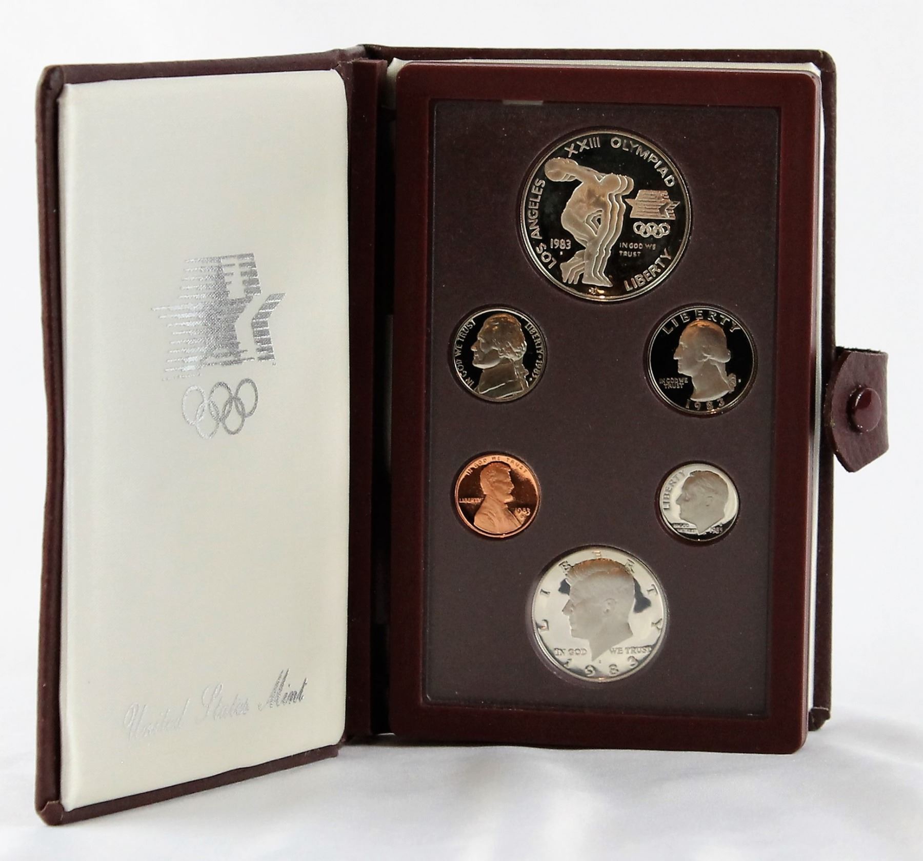 United States 1983 Olympic Prestige Set, consisting of 6 coins. Comes in a maroon, hand crafted and leather case with snap. Each coin with its own setting.