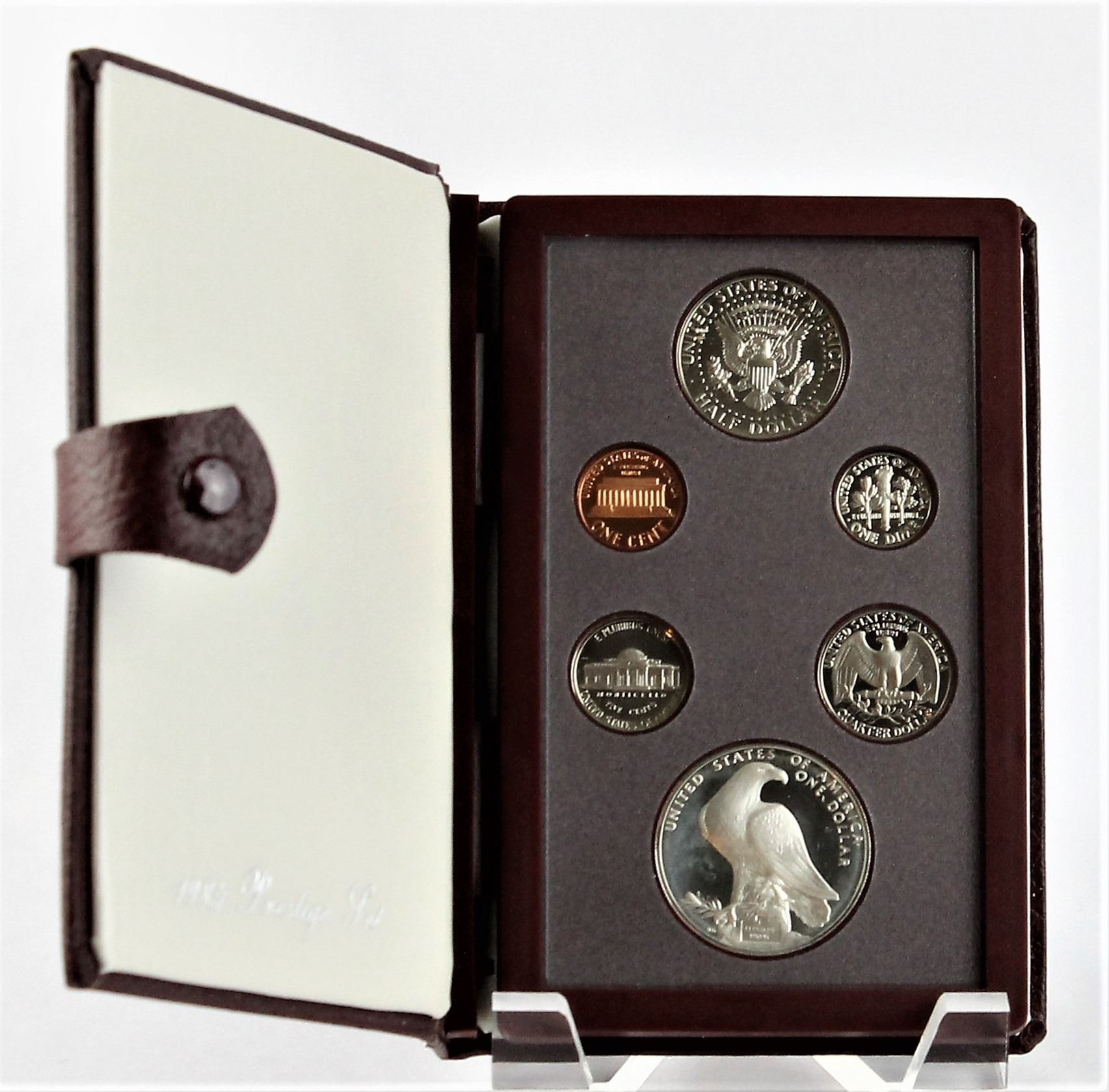 United States 1984 Prestige Set, consisting of 6 coins. Comes in a maroon, hand crafted and leather case with snap. Each coin with its own setting.
