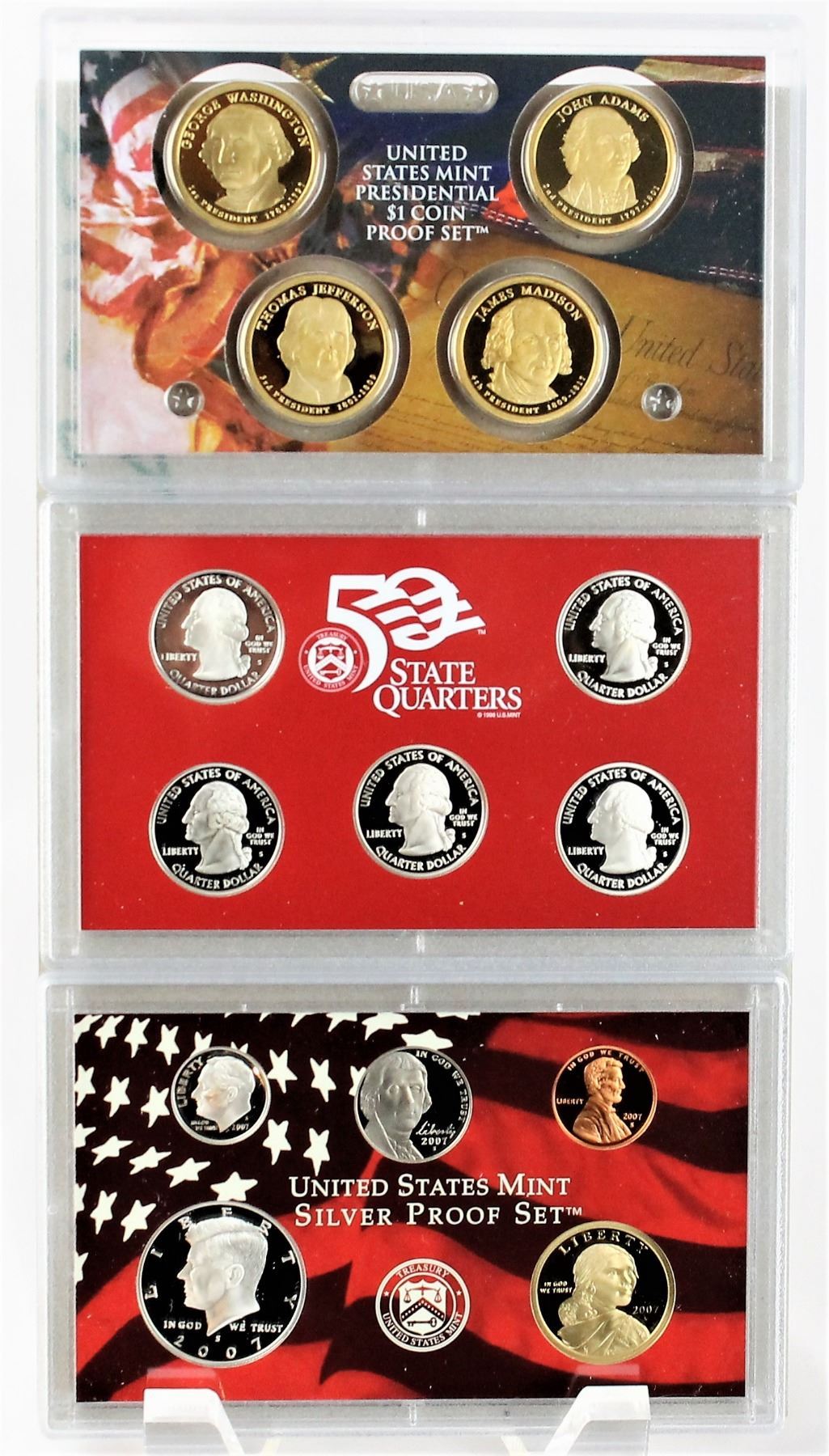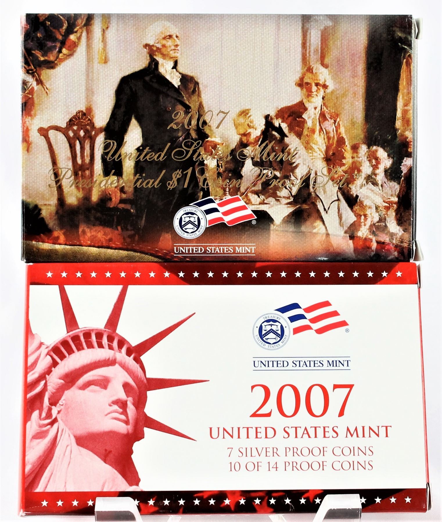 This 14-piece set includes a half dollar, dime, nickel, and cent, the 2007 Statehood Quarters, and the first four coins of the Presidential Dollar series all in a beautiful proof finish. The half dollar, dime and quarters are minted in 90% Silver.