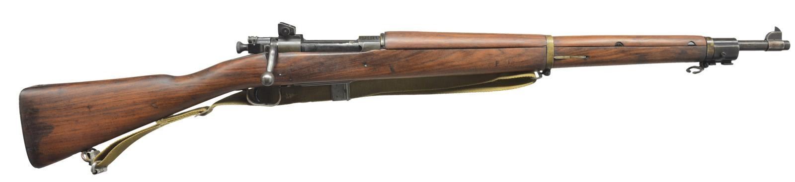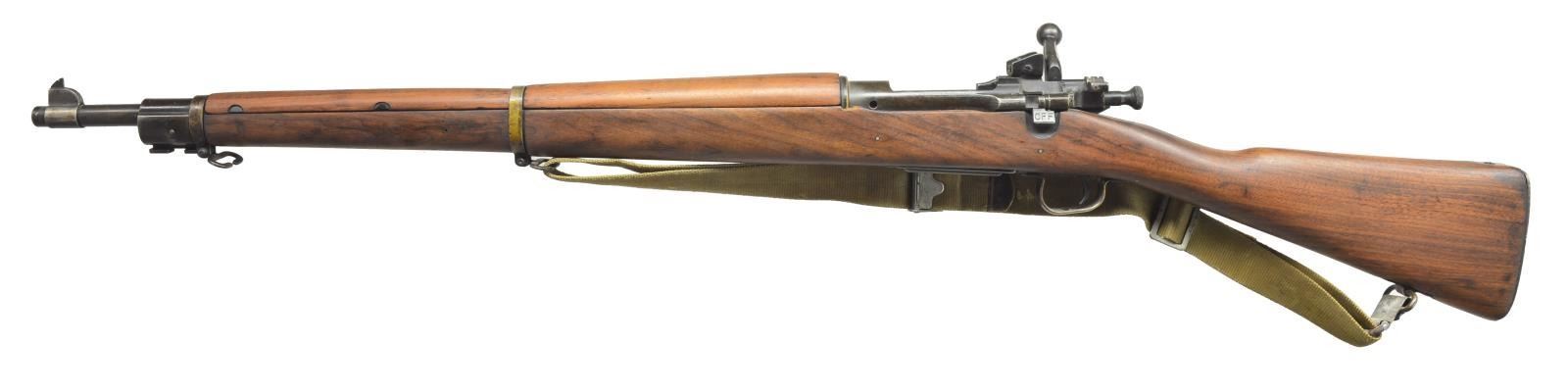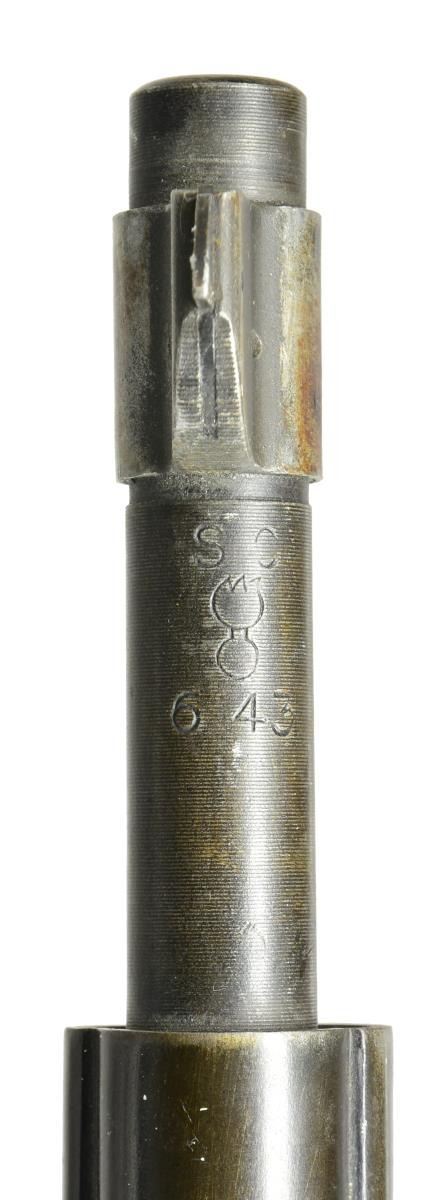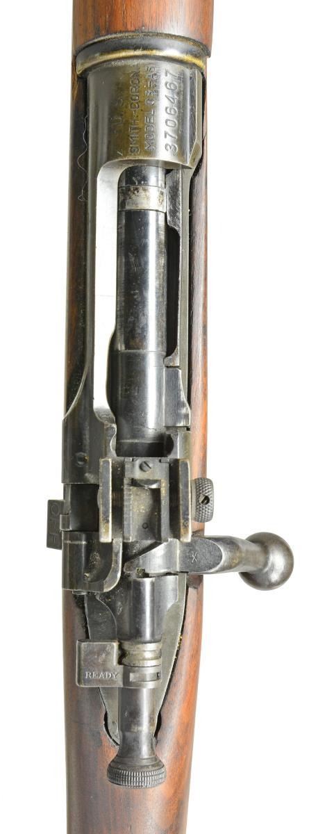 Cal. 30-06. S# 3706467. Bbl. 24", marked behind front sight "S.C.", flaming bomb, "6" "43". Adjustable aperture rear sight. Blade front sight. Replacement bolt marked on top of handle w/ "X". Safety lug on bolt is not correct Smith Corona profile. Bolt shroud & safety marked "R". All stamped furniture. Large bow trigger guard is correct Smith Corona type. Trap buttplate has shallow checkering. Non matching walnut stock set w/ replacement handguard. Stock has two reinforcement pins. Green nylon sling. CONDITION: stock set has arsenal rework type finish rendering markings obscure w/ light wear, scattered handling marks & staining. Notable staining on right side of butt has 3 filled dents on right side of butt. Stock has relief cut for bolt handle & sm. missing chip on left side at handguard ring. Metal has 70% original finish w/ light wear, thinning, scattered scratches. Front sight has notable loss of finish due to installation & removal of sight protector. Good, shiny bore w/ frosting in grooves. (21-1477/RW). CURIO. $600-800.