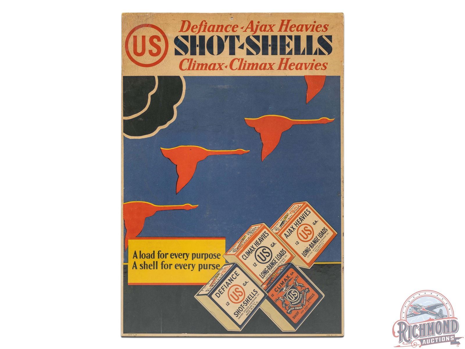 Scarce single sided cardboard easel back sign featuring four different 12 gauge shotgun shell boxes and geese in flight. Reads "A load for every purpose, A shell for every purse." Sign has minor edge wear, mostly along the right edge and top. The top presents with some light spotting a few small tears with general age toning throughout. Wrapped and mounted to foamboard. Marked CS93-4-29 Litho in USA on the bottom edge. 19.5" H x 13.5" W.