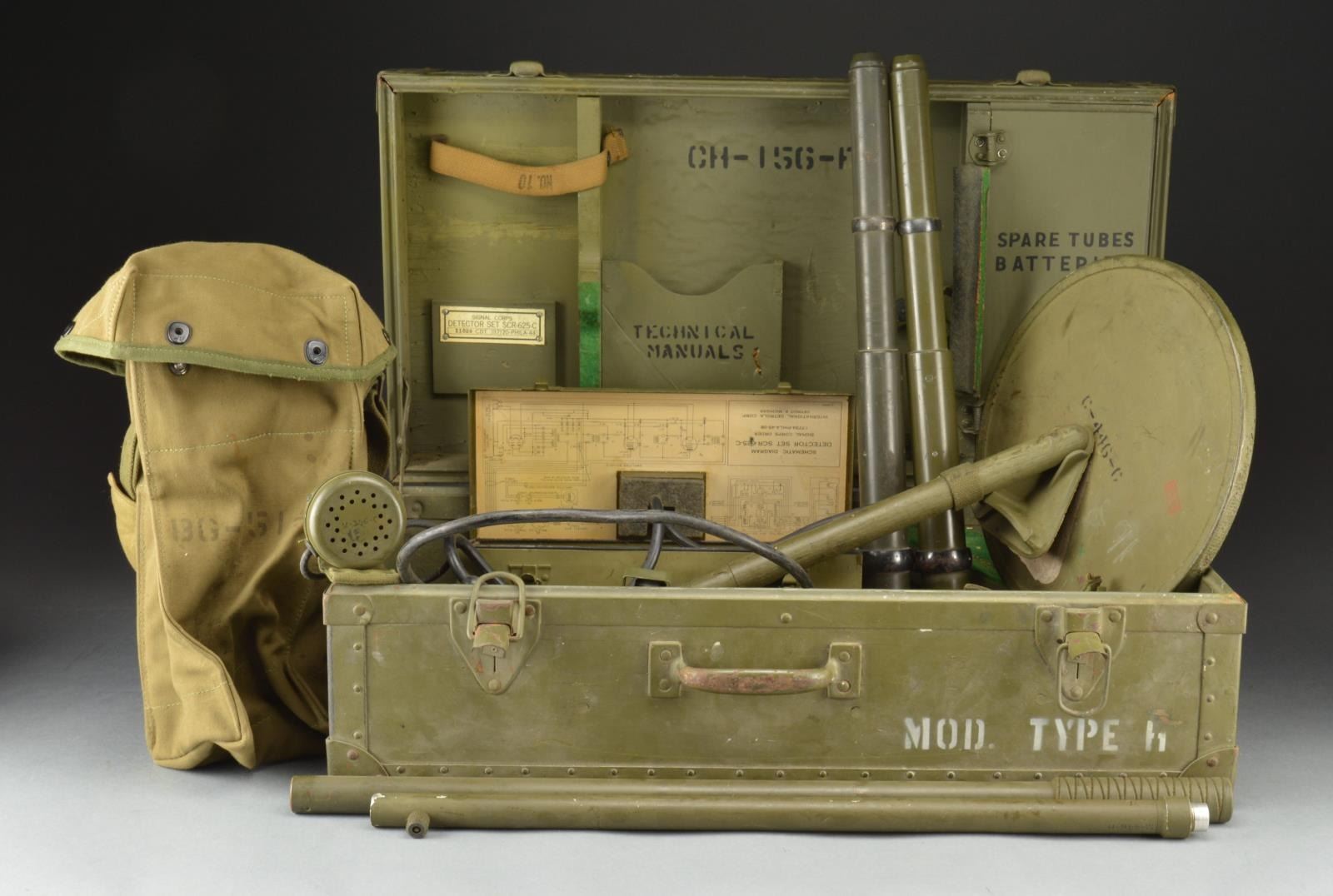 SCR-625-C MINE DETECTOR SET. Set includes search coil, rod sections, amplifier w/out batteries, control box, handle M44, earphone & padded canvas carrying case w/ shoulder straps. Set housed in metal reinforced wooden chest measuring 28" x 15" x 10". Box marked in white paint "DETECTOR SET SML 04-4175. 100-200. DETECTOR SET" & S#. / 2 TANK M-51 TELESCOPES. Telescopes mfg. w/out reticles marked "M.H.R.CO. 1942 D.A.". One additionally marked "R.J.D.". CONDITION: detector set has generally good appearance w/ military green paint & legible markings. Set appears generally complete, except missing manuals, spare tubes & batters. Search coil has become detached from it's handle mt. & appears to have repaired wire splices. Telescopes have lg. degree of green painted finish. Optics are slightly cloudy, but appear serviceable. (02-15172/RW). $350-550.