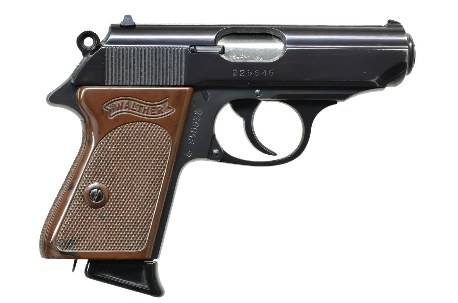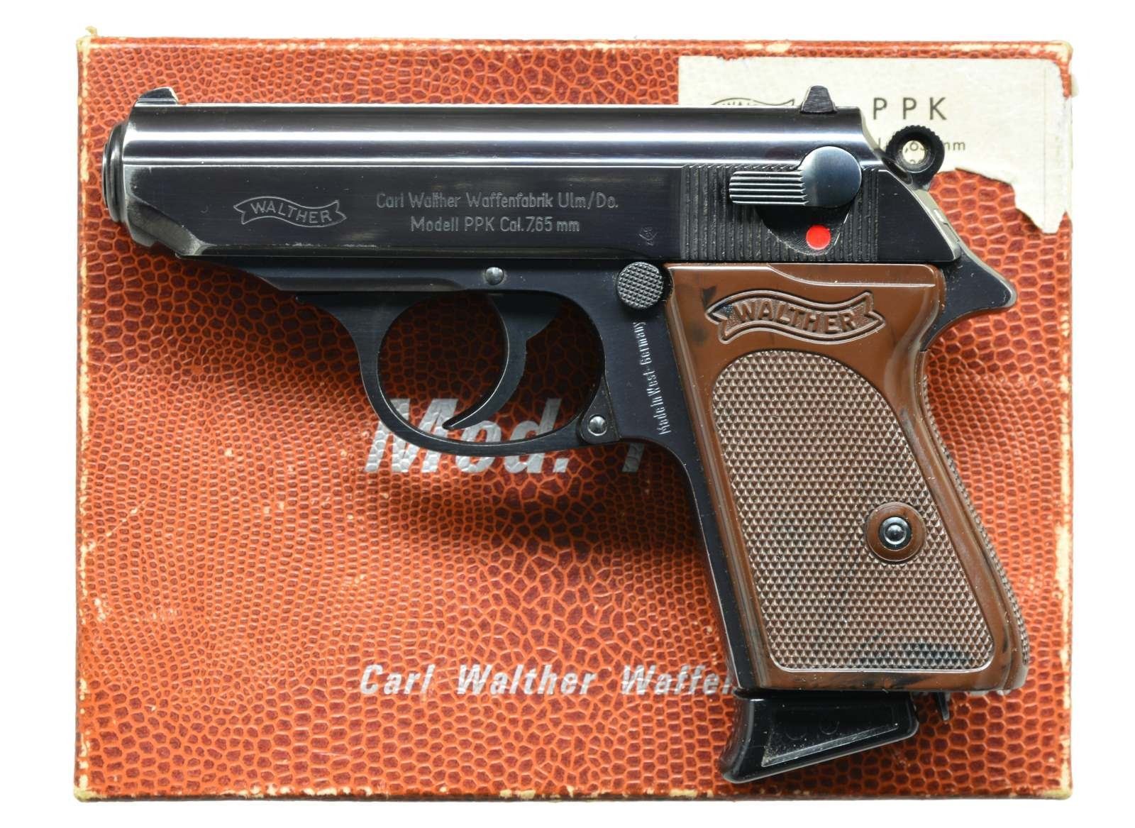 Cal. 7.65mm. S# 226646. Bbl. 3.31". Mfg. 1968 in W. Germany; last year of importation into U.S. due to GCA of 68. Exact model immortalized by Ian Fleming w/ James Bond. Blued finish w/ brown checkered Walther banner grips. Slim raised rib w/ wavy grooves having fix blade front sight & drift adj. rear. Matching # slide & numerous eagle "N" proofs. MAGS: 3 total; near excellent factory 8 rd.; 2 factory packed w/ pistol being blued having flat base & finger extension base, 1 matte stainless w/ finger extension base. UNATTACHED ACCESSORIES: matching # factory pebble grained 2 piece compartmentalized box w/ brass cleaning rod, manual & wonderful 15 meter test target. CONDITION: light finish loss on front corners of slide; all other aspects near excellent including bore & grips. (21-1089/NW). CURIO. $550-800.