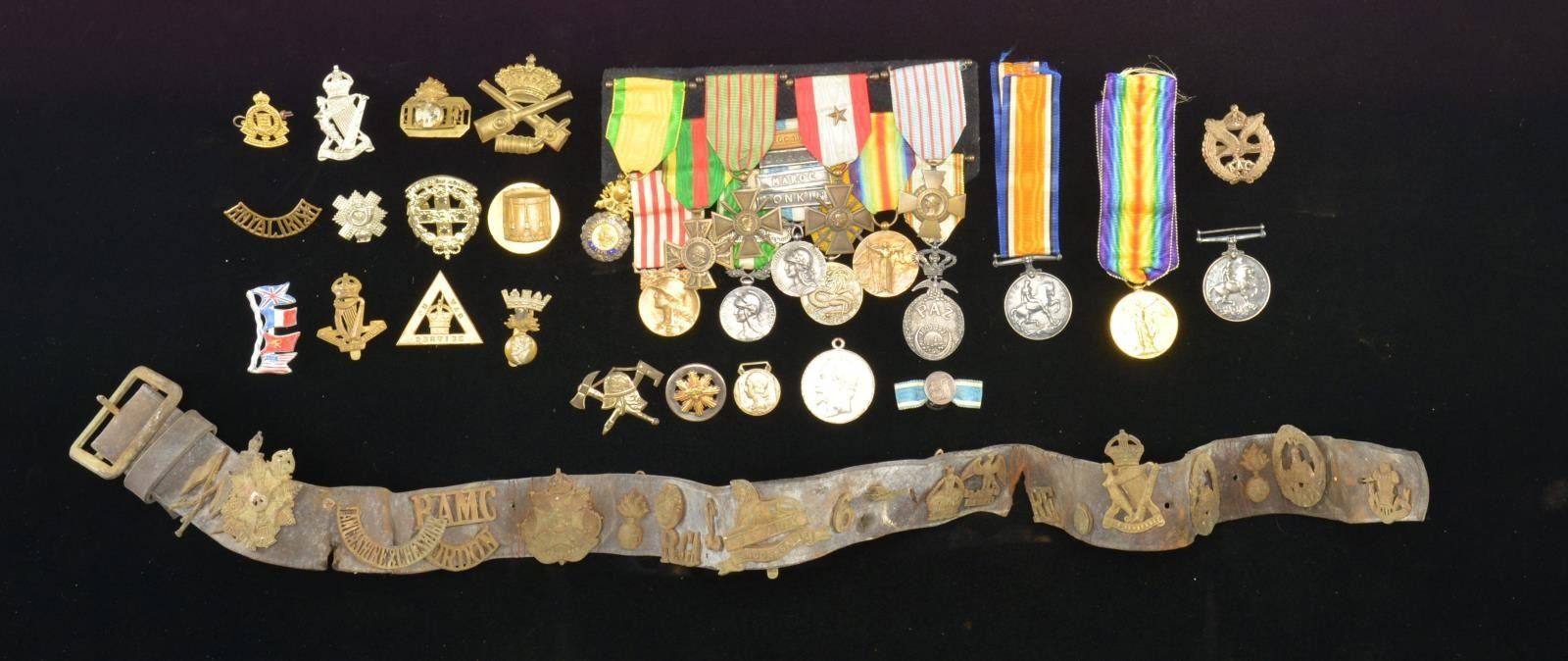 EUROPEAN MILITARIA. 1) A stunning group of 11 mostly French military medals that includes the Medaille Militaire. / Croix de Guerre 1914-1918. / Croix de Guerre Overseas. / Croix du Combattant. / Combattant Volontaire. / Medaille Coloniale including a brass bar that reads, “MORAC 1925-26” & 3 silver bars that read, “SAHARA”, “MORAC” & “TONKIN”. / WWI French Chobillon unofficial Victory Medal. / 1914-1918 Commemorative Medal. / Morac Medal w/ silver “MORAC” bar. / Kim-Tien Indo-China medal. / Spanish Peace of Morocco Medal 1925-1927. There is some old paperwork w/ this group that seems to indicate that the medals belonged to 1 French soldier named Gustave Focke of the French Foreign Legion. CONDITION: all medals seem to be in very good condition w/ their original ribbons & bars. 2) This group consists of 2 British 1914-1918 War Service medals, 1 having ribbon. / 1 British WWI Victory Medal. / 1 British WWI “hate belt” having a variety of buttons & insignia attached. / 1 Sm. bag of 14 British collar, hat & other insignia. / 1 German Fire Brigade pin. / 1 German lapel pin that reads, “EHRE DER ARBEIT”. / 1 French Napoleon the Third medal, no ribbon or ring. / 1 French pin that reads, “AUSTERLITZ 8e Regiment de’ Artillerie”. / 1 French school medal, no ribbon. / 1 French artillery button. CONDITION: most items show light wear. The leather on the “hate belt” is quite dry & stiff. (02-14451-2/BF). $700-1,000.