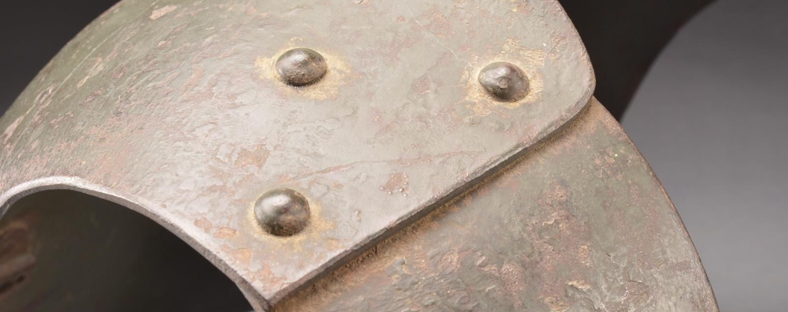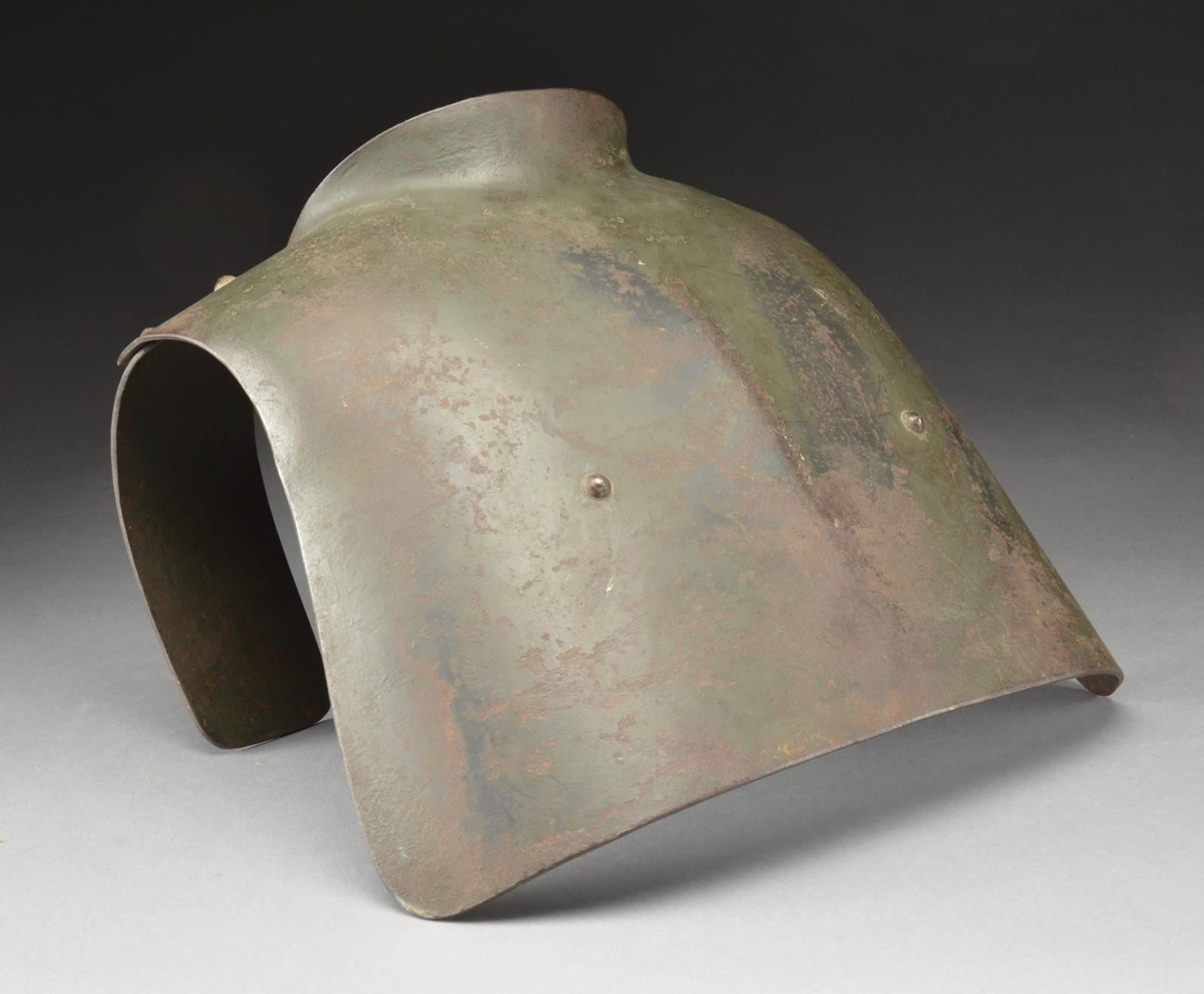 Issued in large quantities subsequent to 1916 know as "SAPPENPANZER" in German. Armor is marked in lower inside left corner w/ interlocking circles indicating Krupp mfg., "K" & "64". This armor originally had abdomen & groin plates suspended from the chest plate by web straps & padded w/ felt pads to deaden noise used also in conjunction w/ hinged armored visor which attached to the "Horns" on the helmet. This armor was too heavy for many uses & was used primarily by sentries & machine gun crews. The lower plates & suspension are not present, however the chest plate has the inside loops still in place. The armor has backstraps attached by rivets. CONDITION: armor has nice appearance w/ good amount of original dark grayish green paint w/ wear, light oxidation & patina. Has small areas of white paint. (02-15324/RW). $400-600.