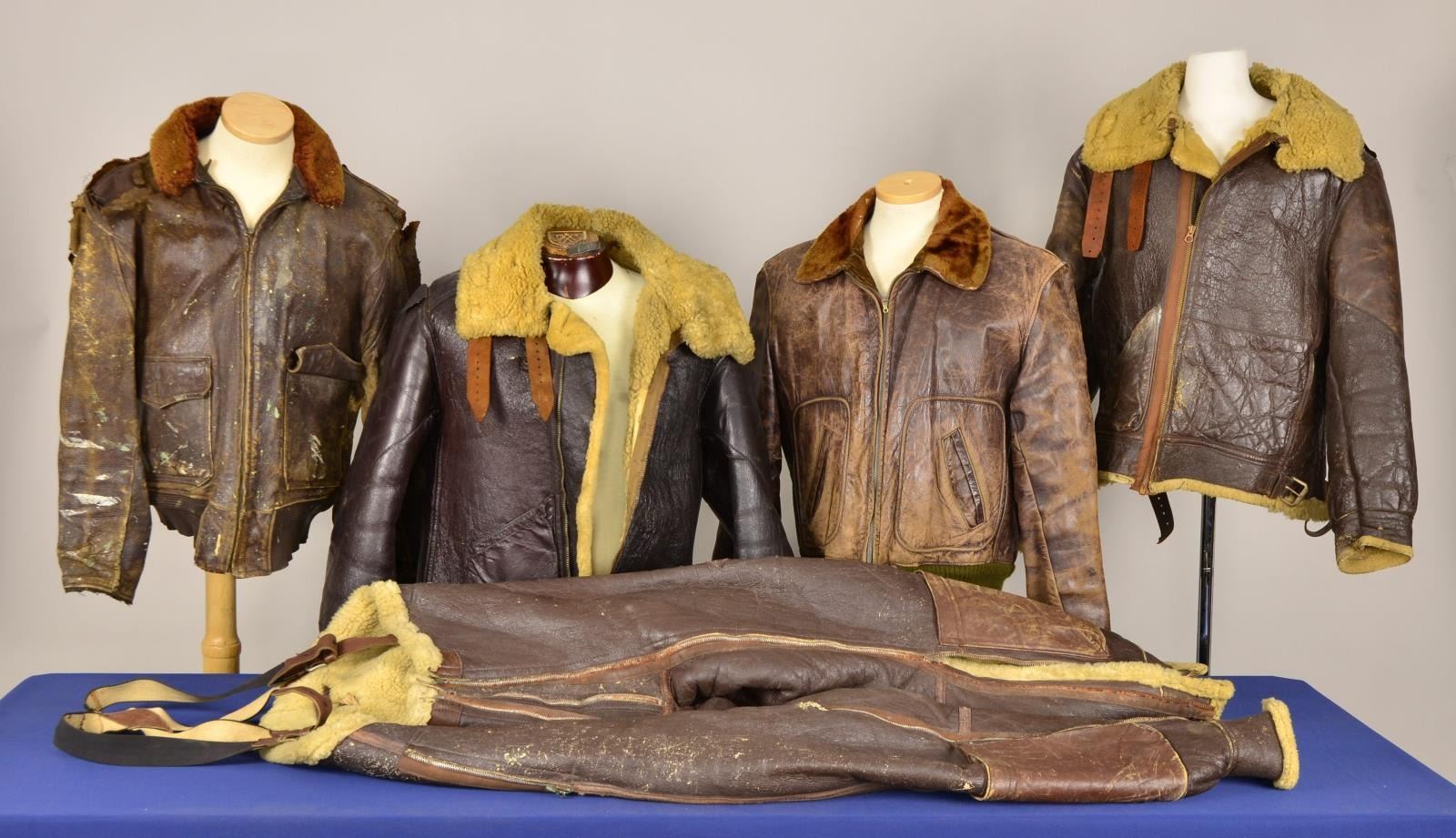 1) FLIGHT JACKET. A Type A3 leather flight jacket w/ sheared wool lining, size 42. Produced by H.L.B. Corp. CONDITION: leather is a bit crazed w/ a few punctures. There are scattered repairs. The sheared lining is quite dirty. 2) FLIGHT JACKET. A Type B3 leather flight jacket w/ sheared wool lining. Inside tag reads in part, “TYPE B3 SIZE 38R. Order No. 42-12691-1”. CONDITION: leather is crazed & flexed w/ expected wear. The sheared lining is a bit dirty. 3) FLIGHT JACKET. A leather shearling lined flight jacket w/ no tag. CONDITION: leather is quite distressed. Shearling lining is torn & dirty. Overall, jacket is heavily worn. 4) FLIGHT JACKET. A leather G1 flight jacket w/ an interior tag that reads in part, “BUAER-U.S. NAVY G-I FLIGHT JACKET SPEC. 55 J14(AER) 40”. CONDITION: jacket is in overall poor condition w/ major damage throughout. 5) FLIGHT TROUSERS. Leather Type A3 flight trousers, size 40R w/ suspenders. Trousers were produced by Werber Sportswear Co. of Newberg, NY. CONDITION: trousers show general wear w/ flaking & crazing. (02-14328/BF). $800-1,200.