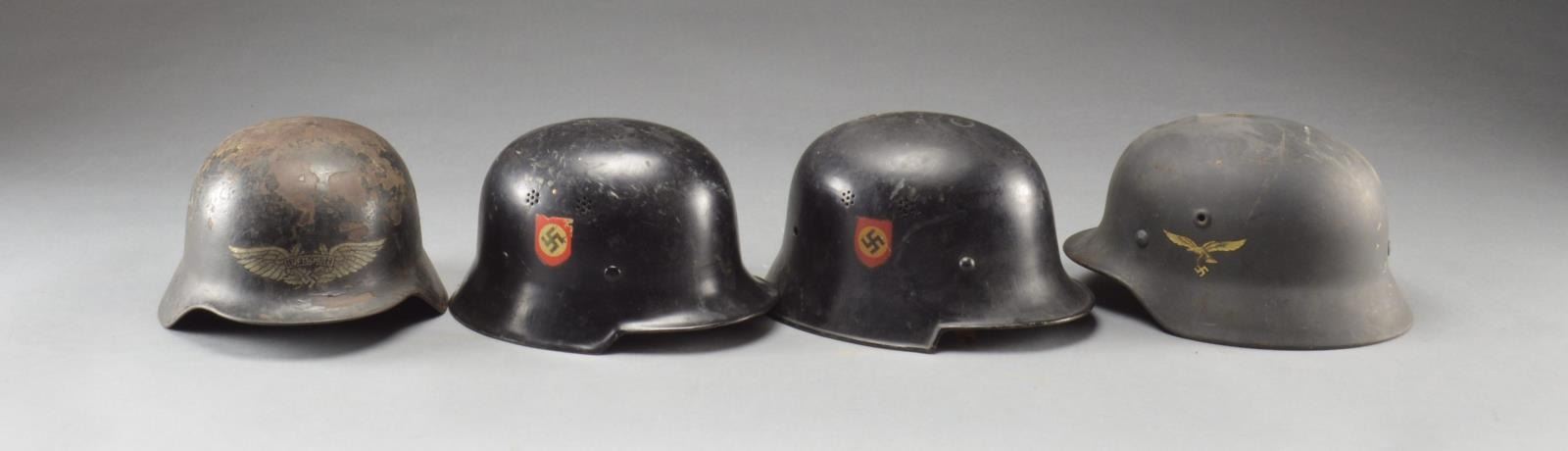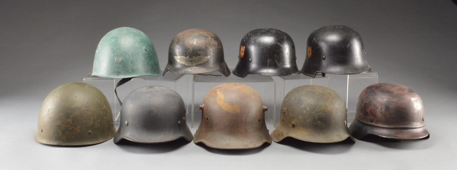 1) German M1916/17 helmet w/ no liner or chinstrap. CONDITION: helmet is a battlefield relic. 2) German M1940 Luftwaffe single decal helmet, no liner but band is intact. No chinstrap. CONDITION: finish is about 98%. Decal is about 85%. 3) German beaded M1935 Luftschutz helmet. Liner & chinstrap are intact. CONDITION: finish has mostly been removed by wire brush. Liner & chinstrap show moderate wear. 4) German civic square dip helmet. Liner is intact. No chinstrap. Police decal on left side. National colors w/ Party symbol on the right. CONDITION: finish is about 95%. Decals are about 90%. Liner shows moderate wear. 5) German M1940 helmet converted for Luftschutz use. Liner is complete. No chinstrap. CONDITION: decal on front is approx. 90%. Liner shows moderate wear. 6) German civic square dip helmet. Liner is intact. No chinstrap. Police decal on left side. National colors w/ Party symbol on the right. CONDITION: finish is about 95%. Decals are about 95%. Liner shows moderate wear & is a bit loose because of 2 missing rivets. 7) German M1942 helmet. Liner is intact. No chinstrap. There are remnants of an eagle decal on the left side. CONDITION: finish is approx. 80%. Decal is about 10%. Liner shows light to moderate wear. 8) Italian M1933 helmet painted in a blue green color. Liner & chinstrap are intact. CONDITION: finish is about 95% intact as repainted. Liner & chinstrap show light to moderate wear. There appears to be a metal clip or bracket removed from the front of the helmet. 9) Polish WWII helmet w/ liner & chinstrap intact. CONDITION: finish is about 85%. Liner & chinstrap are dry but complete. (02-14295-1(9)/BF). $1,000-1,400.
