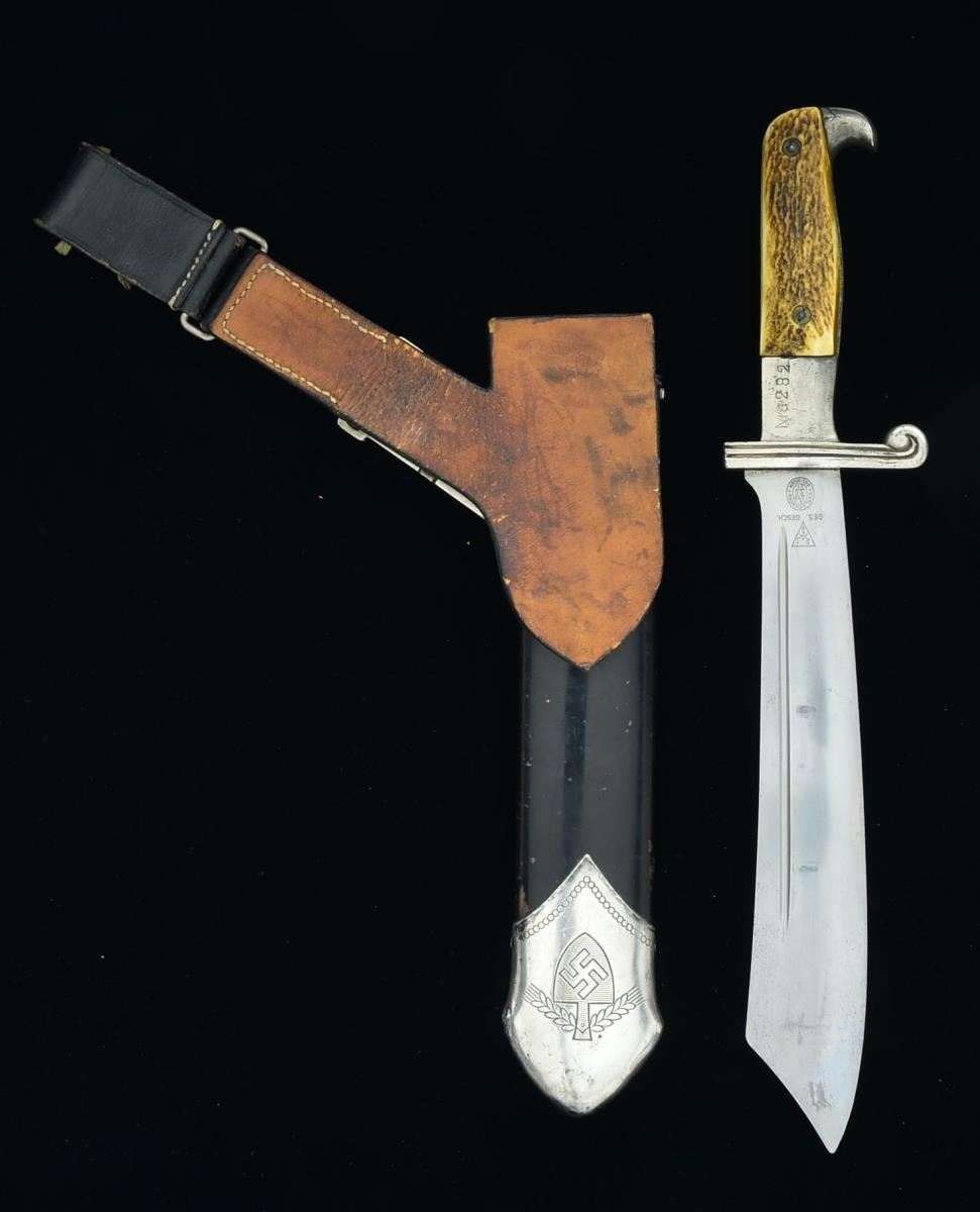 LEATHER HANGER. Overall length: 15 1/2". Blade marked, “RLAD” in a triangle & “GES. GESCH. CARL EICKHORN * SOLINGEN * CE”. Front of blade etched, “Arbeit adelt”. 2 Piece stag horn grips. “Ma282” stamped below the grip. Scabbard has a black enameled body w/ plated mounts. Hanger is black leather w/ correct plated clip. CONDITION: blade shows primarily scabbard wear. Grips are undamaged. Hilt shows light wear w/ some impact marks on the pommel. Scabbard tip has several minor shallow dents along w/ a significant dent at the left corner. Both screws are missing on the tip. Scabbard finish is about 95% but appears to have been retouched in spots. Hanger shows light expected wear & remains quite solid. (02-14790/BF). $700-1,100.