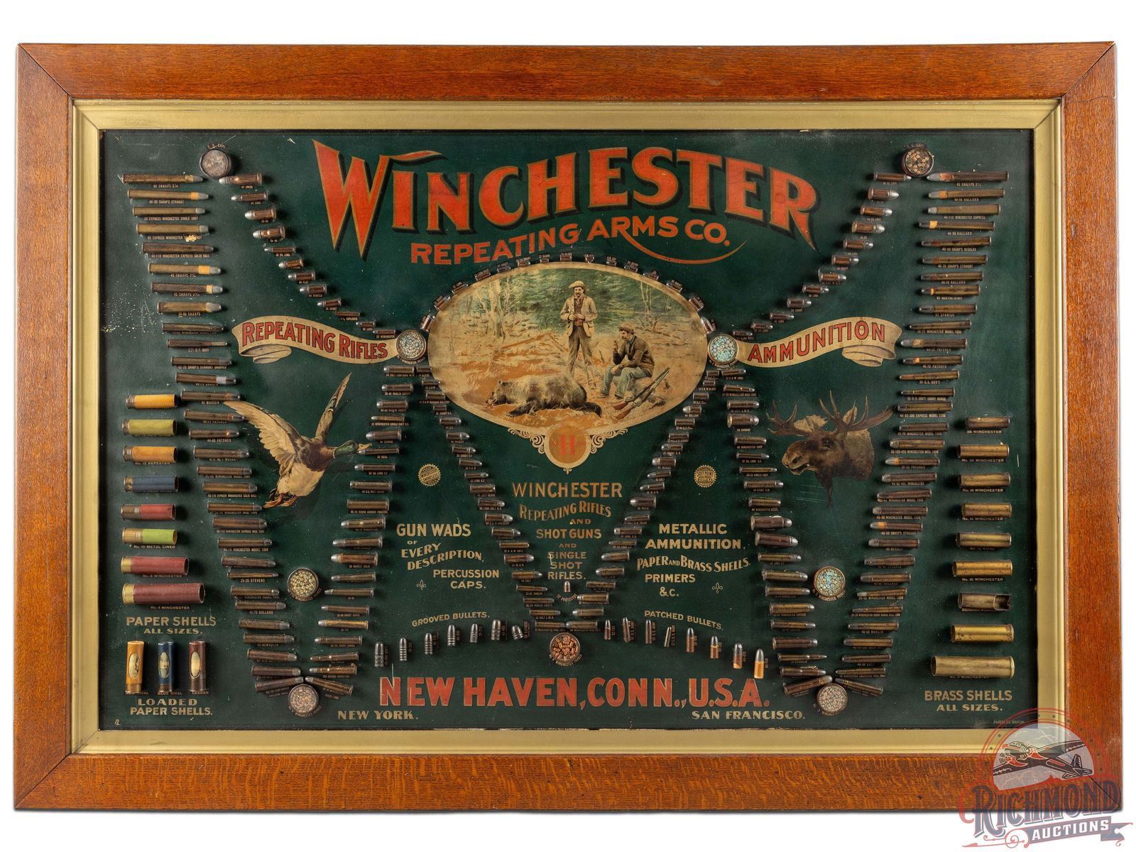 Winchester Repeating Arms Company Double "W" cartridge board made in 1897 for major Winchester Sporting Goods Dealers. Board measures 40" x 58 1/2" with A.B. Frost hunting and game scenes. Board has all the shells loaded at the time which amounts to well over 100 cartridges with wads and primer displays. Board is numbered on back "No. 1931" with standard oak frame.