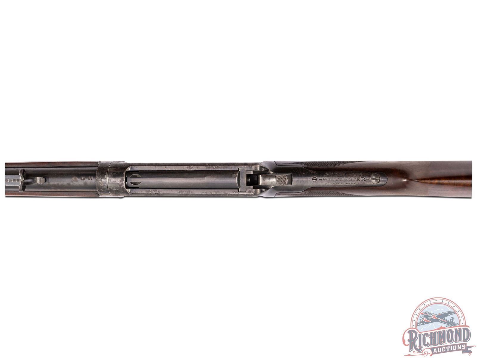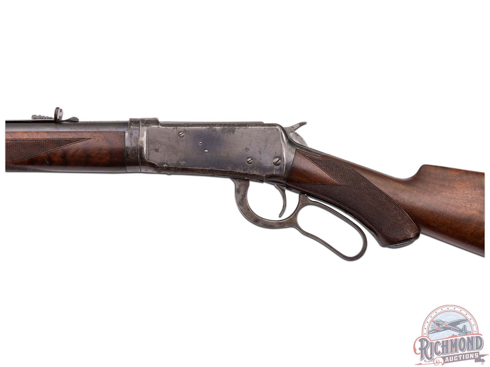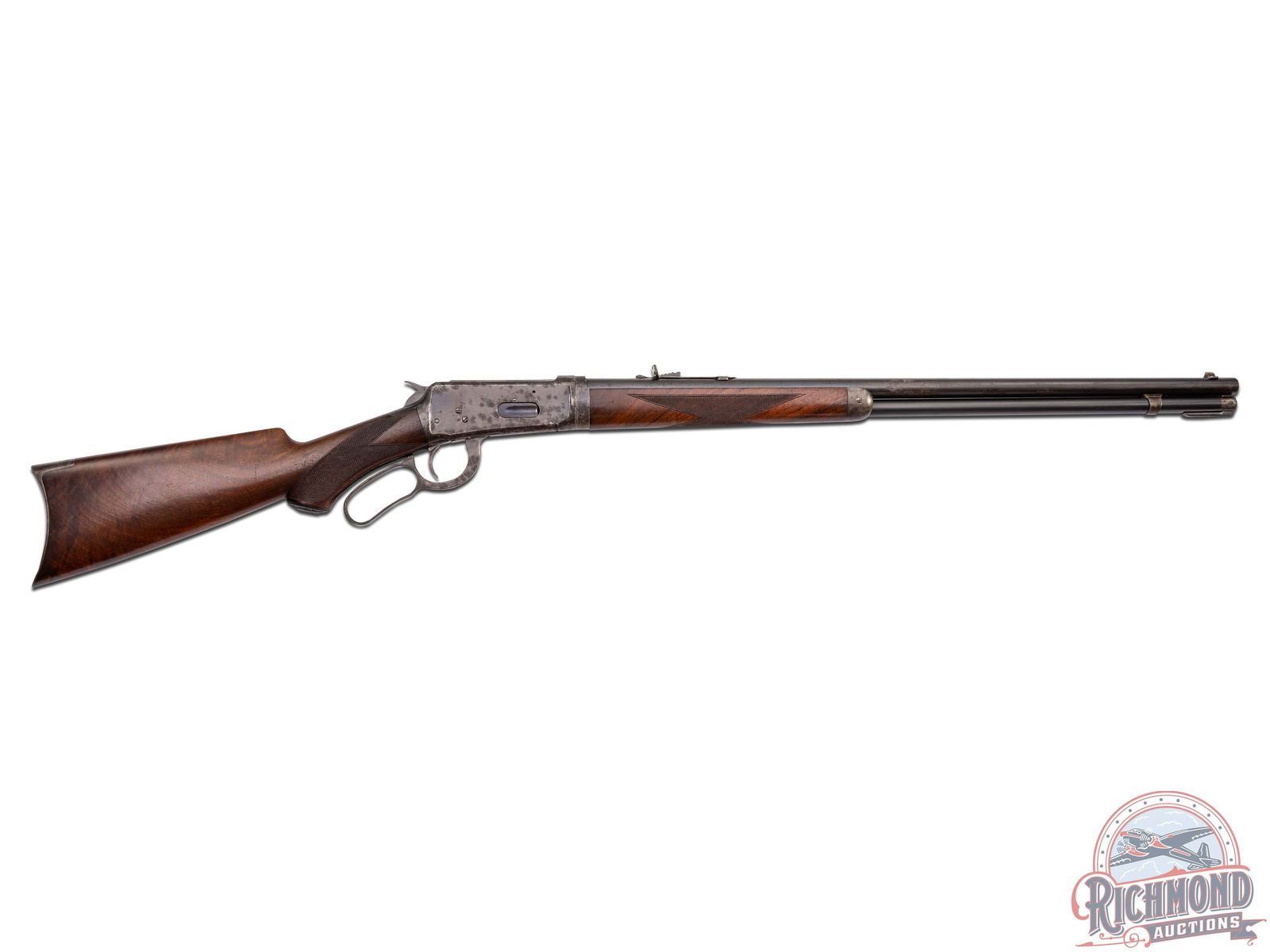 Made by Winchester Repeating Arms in 1902. 24" blued round Winchester Steel barrel with two line address in desirable 38-55 caliber. Barrel is fitted with standard blade front sight and 22G rear notch sight. Blued takedown action with full magazine and plain trigger. Oil finished checkered 2x wood with cupped pistol grip and case-hardened crescent steel butt plate. Cody Research confirms all options. CALIBER: 38-55. S/N: 273336. FFL STATUS: Curio & Relic.