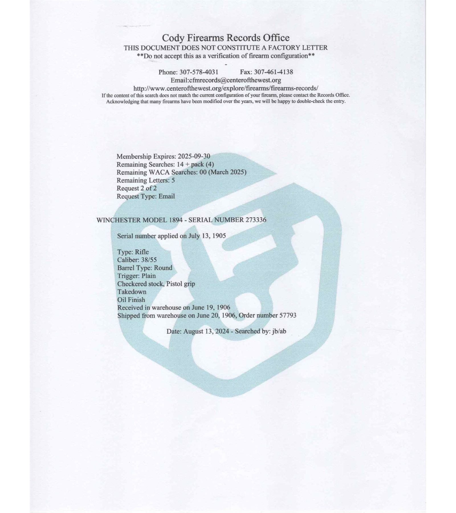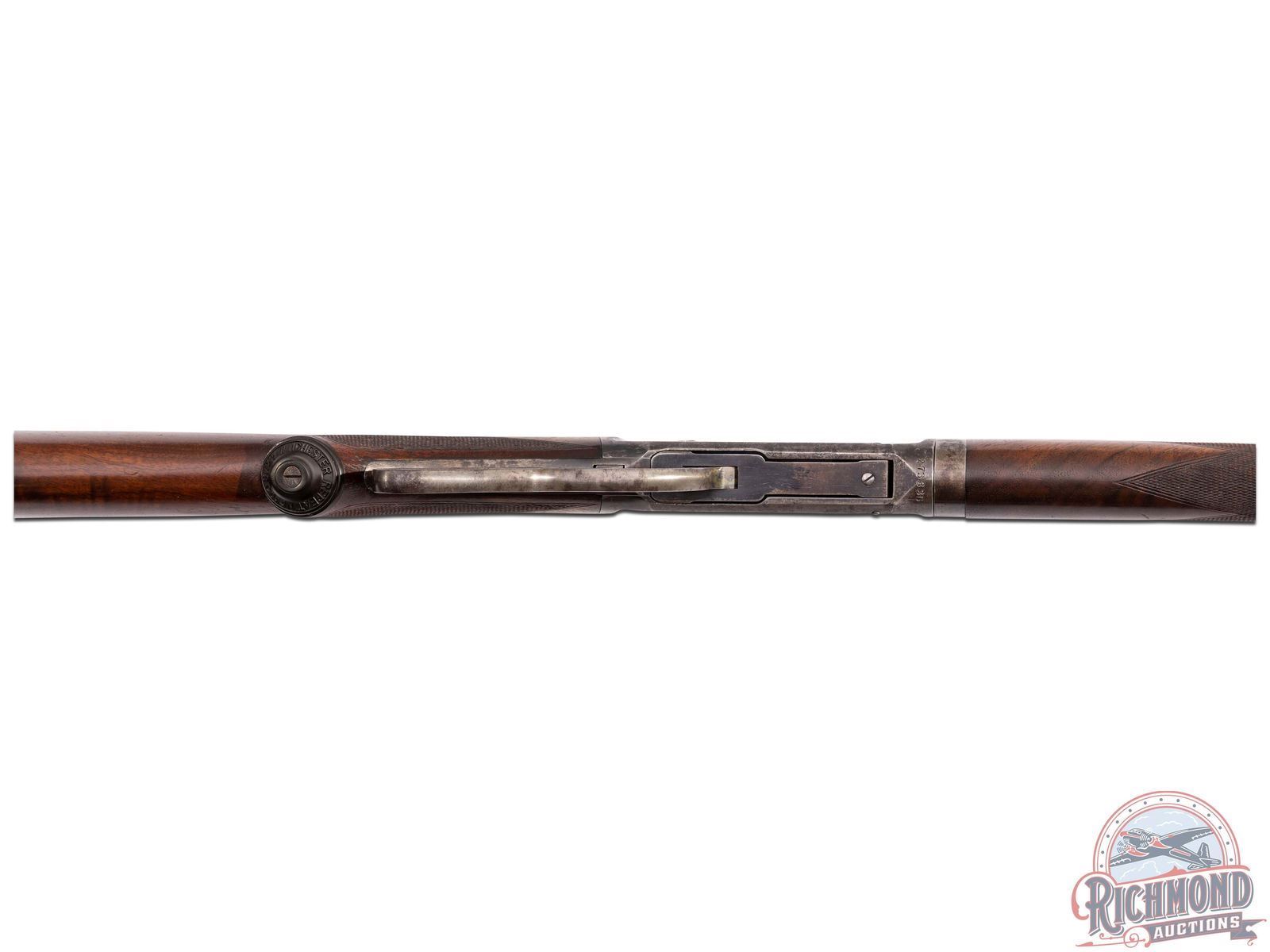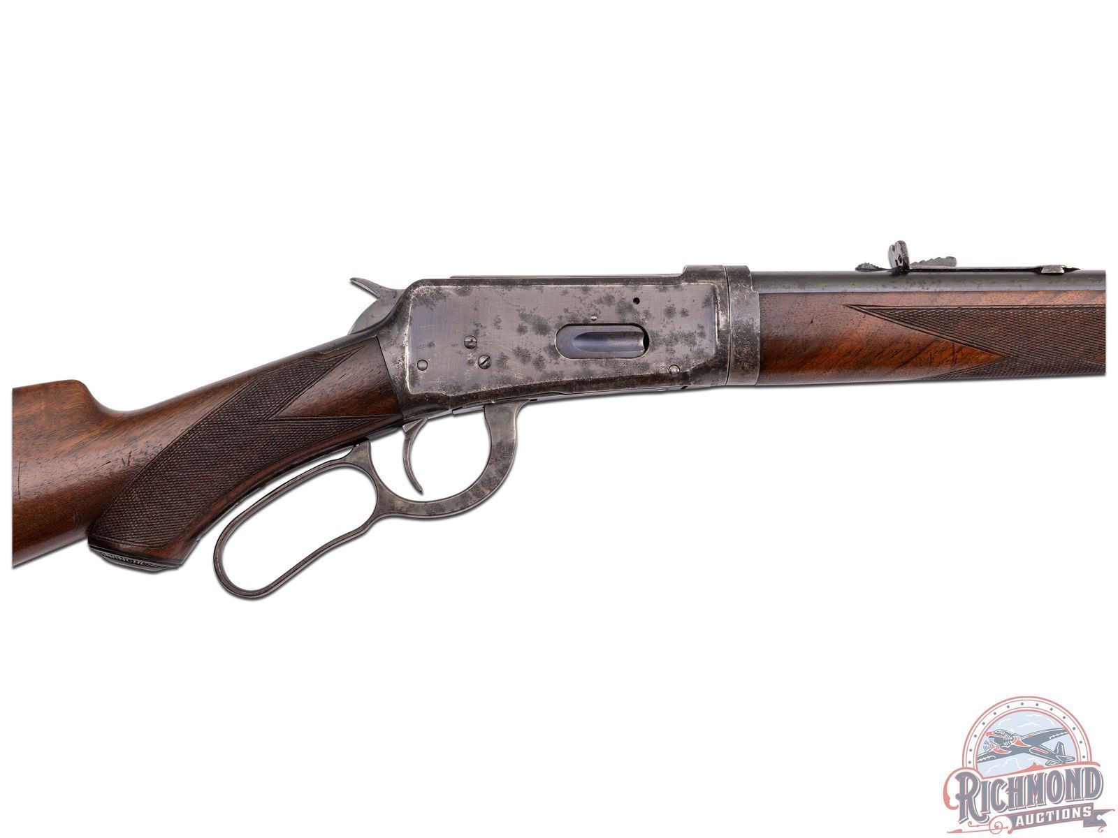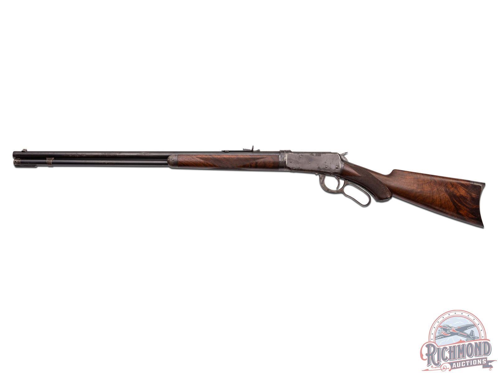 Made by Winchester Repeating Arms in 1902. 24" blued round Winchester Steel barrel with two line address in desirable 38-55 caliber. Barrel is fitted with standard blade front sight and 22G rear notch sight. Blued takedown action with full magazine and plain trigger. Oil finished checkered 2x wood with cupped pistol grip and case-hardened crescent steel butt plate. Cody Research confirms all options. CALIBER: 38-55. S/N: 273336. FFL STATUS: Curio & Relic.