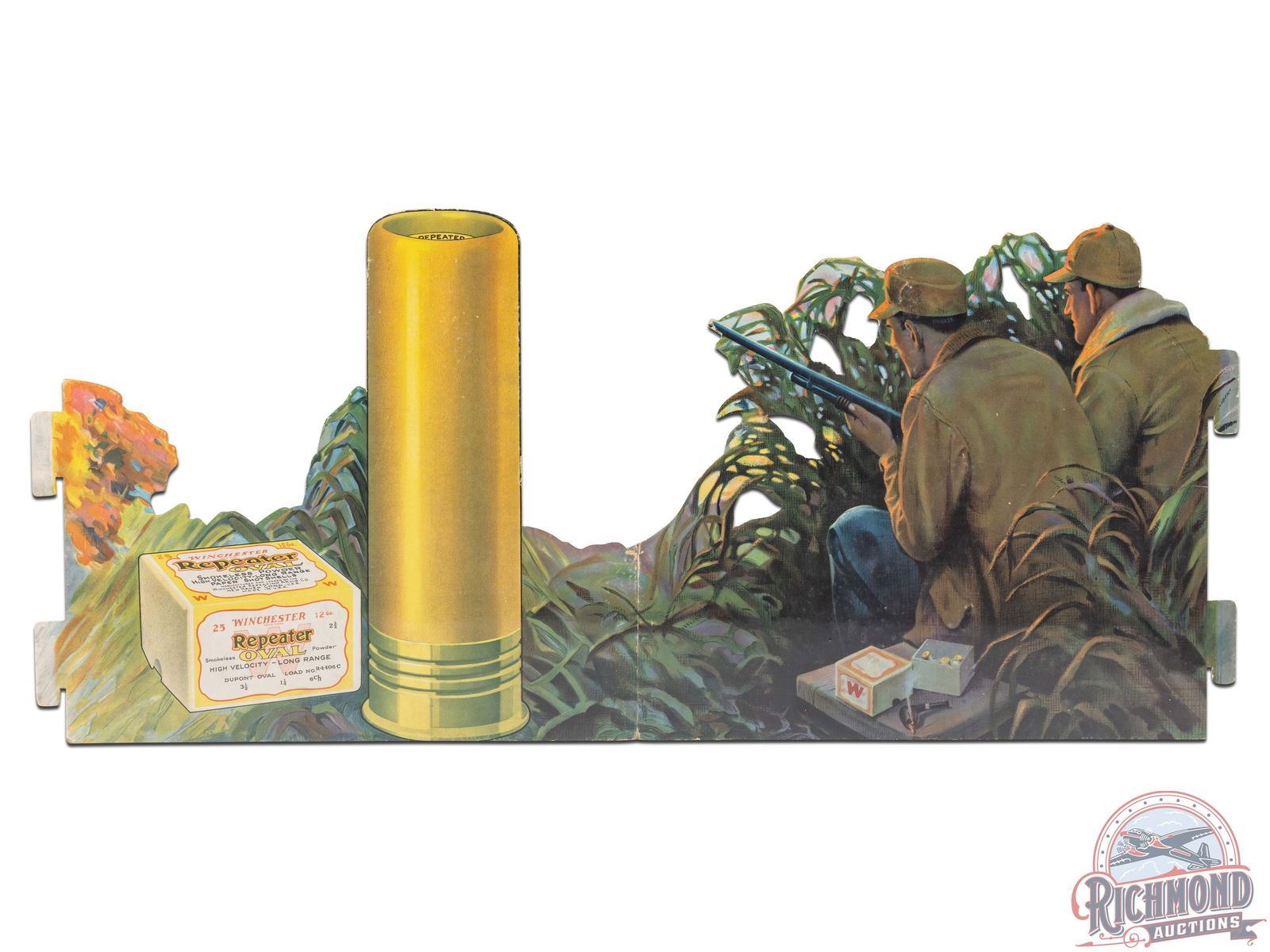 Unique 1920's cardboard die cut with great color and featuring two hunters in wait on a bench, lit pipe, a large shotgun shell and box graphic of Repeater Oval 12 Gauge shells. This was an insert to part of a larger die cut point of purchase display, "Guns and Shells - Results!" Exhibits with good color and some general age wear, predominately along the center fold and around the edges. Shrink wrapped and secured to foamboard. 17" H x 38" W.