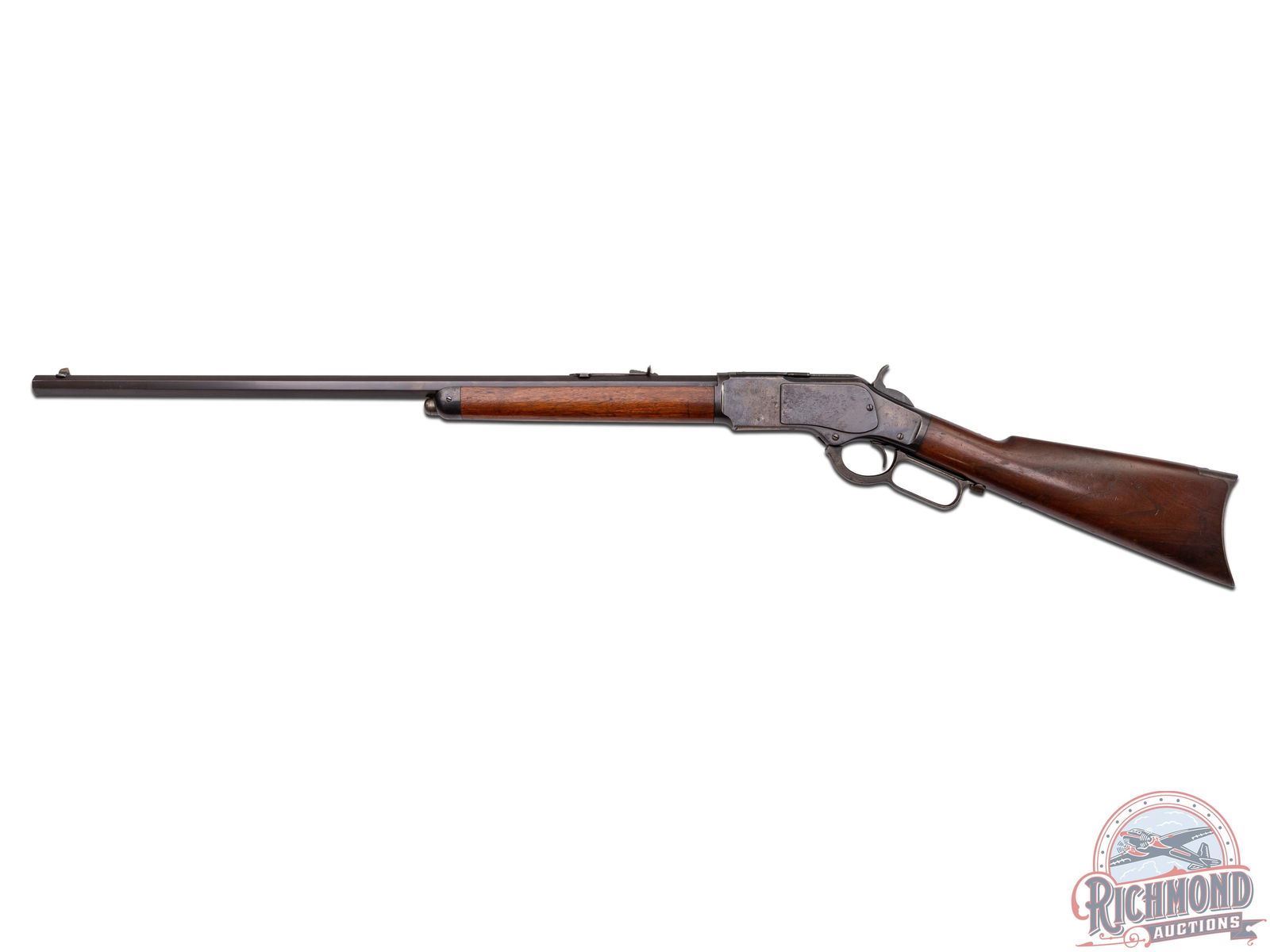 Manufactured in 1905. Features a 26" octagon barrel with button magazine tube, rear elevator notch sight and brass blade front sight. The top of the barrel flat is stamped "WINCHESTER'S REPEATING ARMS, NEW HAVEN, CT / KING'S-IMPROVEMENT-PATENTED-MARCH 29, 1866. OCTOBER 16, 1860". case-hardened receiver with dust cover, side loading gate, lever lock and the iconic brass follower. Tang is stamped "MODEL 1873 / -WINCHESTER- / TRADE MARK". Walnut straight stock and matching forearm with blued end cap. Fitted with a steel butt plate with brass gate for field cleaning storage. Includes factory quick check letter. LOP: 12-1/2". CALIBER: 38 CAL. S/N: 591209. FFL STATUS: Curio & Relic.