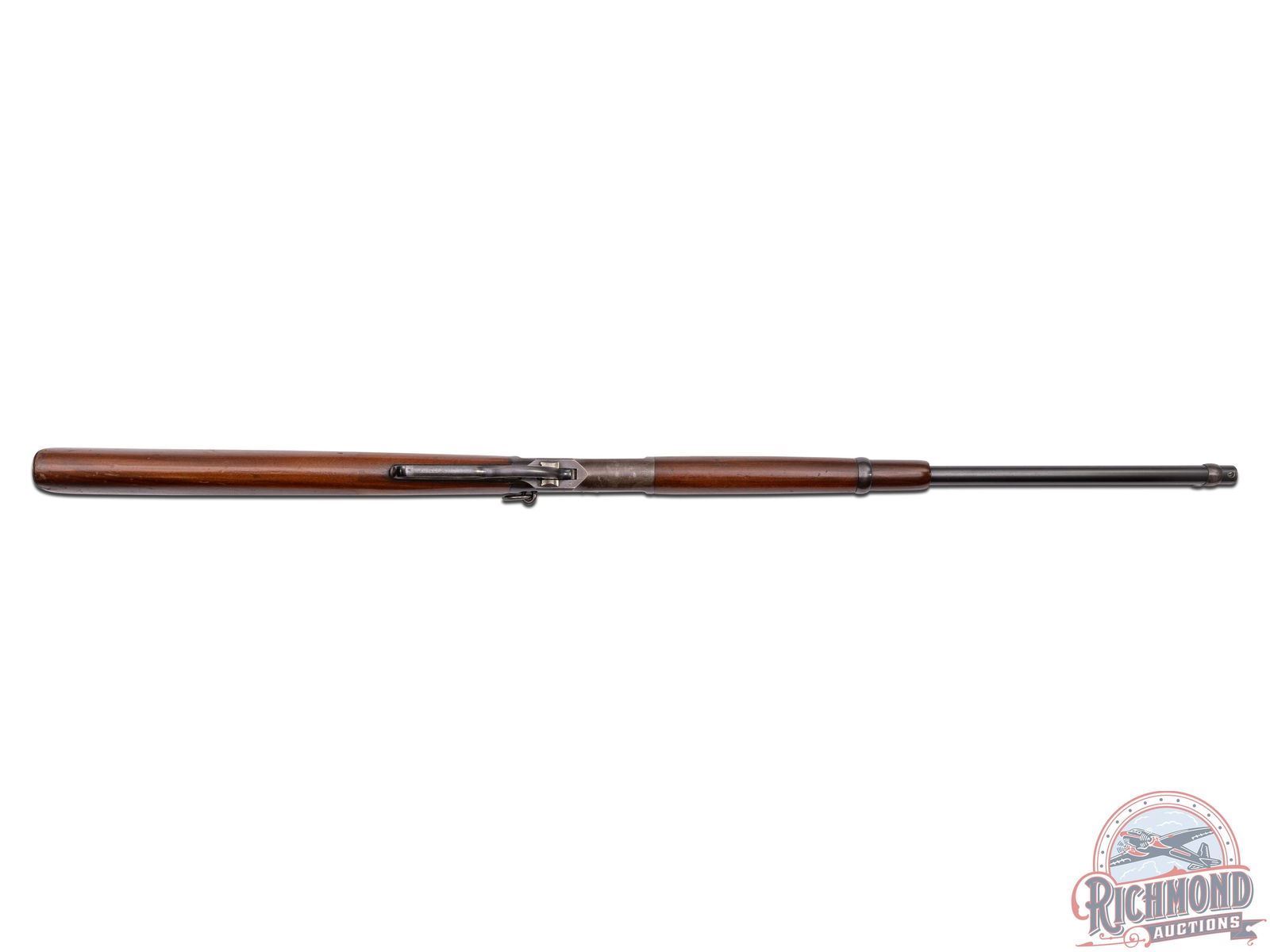 Manufactured in 1915. This sporting rifle features a 20" blued round barrel with original rear ladder sight and blade front sight. Full length magazine tube with two barrel rings. Barrel is stamped on the left side with the two line Winchester address and "44 WCF" near the receiver. Left side of the receiver is fitted with a saddle ring. Winchester proof marks on barrel and receiver. Tang is stamped "MODEL 92 / -WINCHESTER- / TRADE MARK REG. IN US PAT OFF". Straight walnut wood stock and matching forearm with period correct metal butt plate. LOP: 12-3/4". CALIBER: 44 WCF. S/N: 785258. FFL STATUS: Curio & Relic.