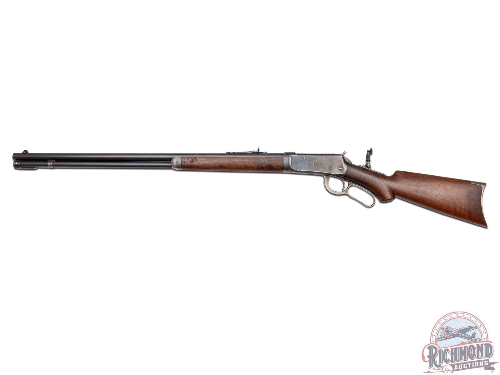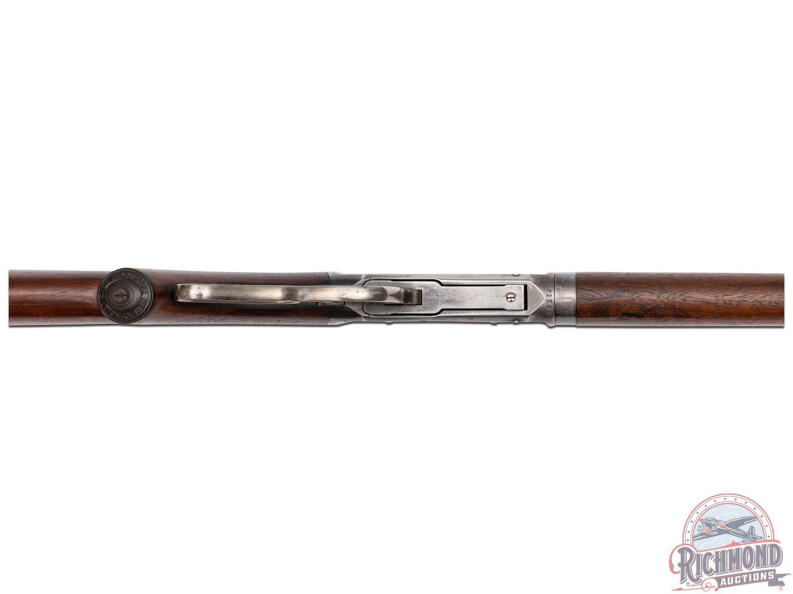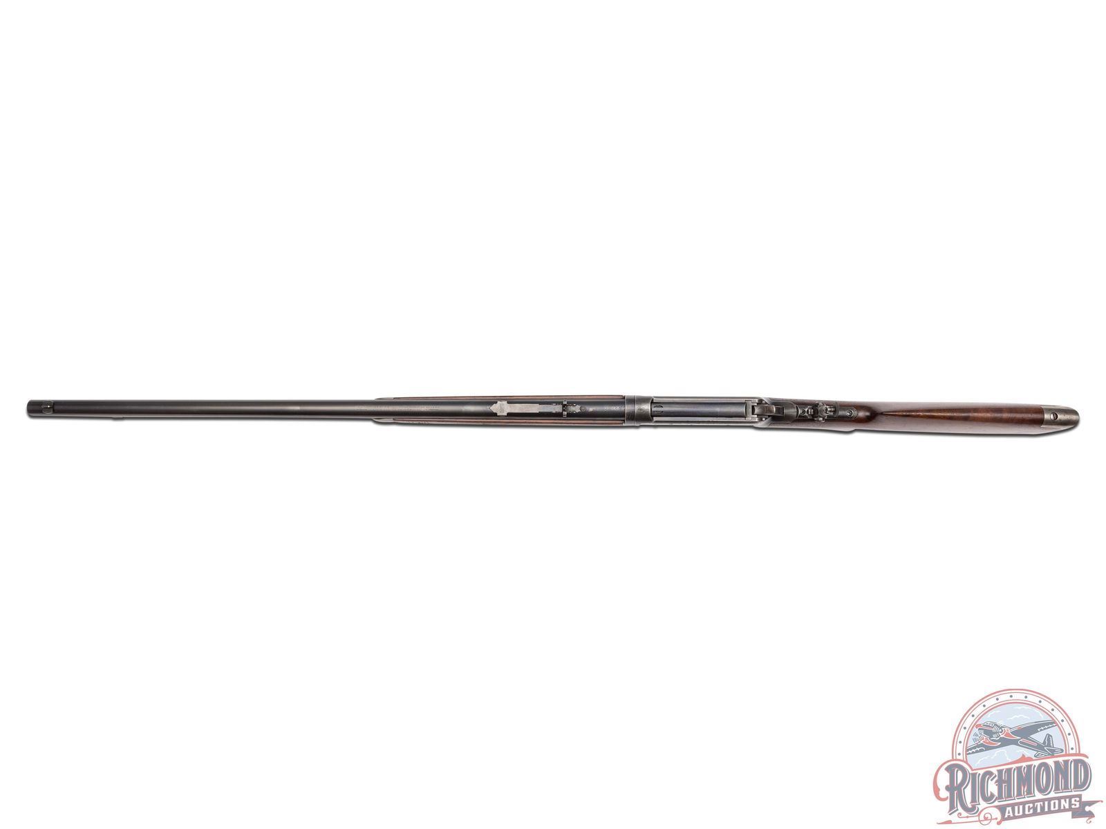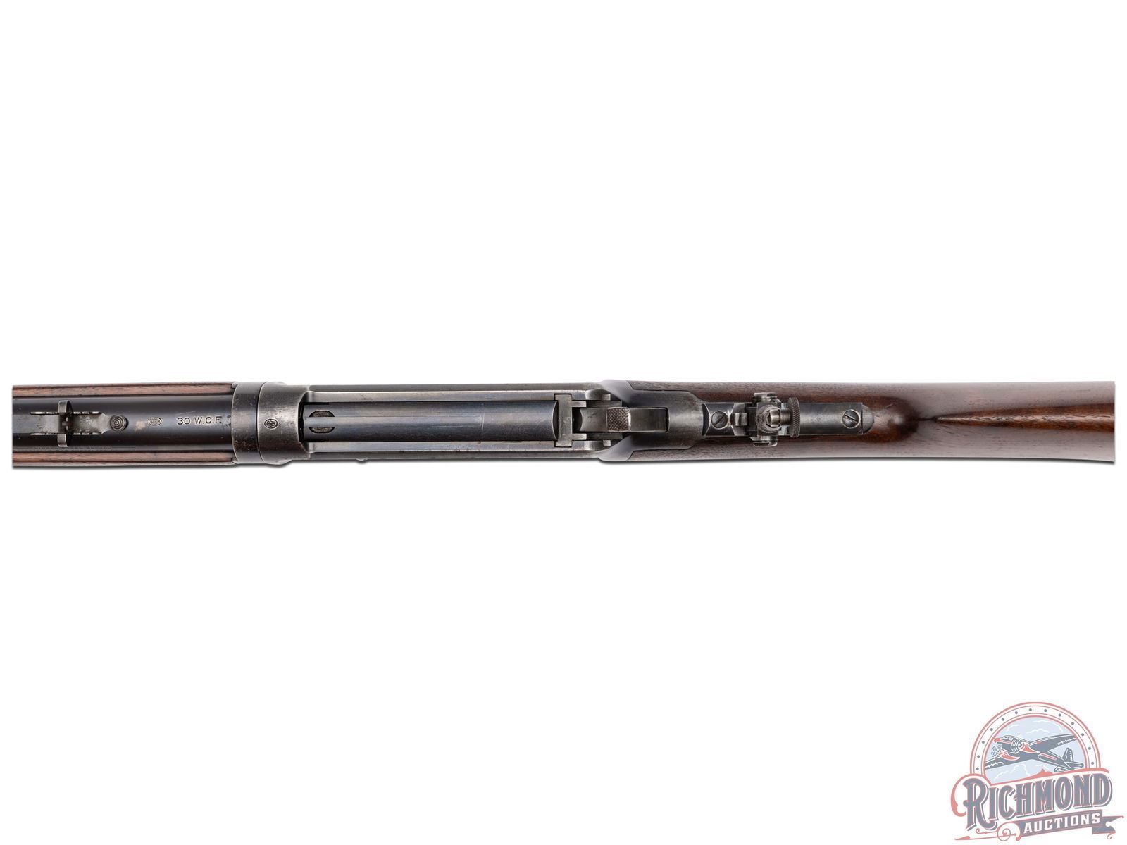 Manufactured in 1907. This nice model 1894 features a 26" blued round barrel with full length magazine. Marble's rear semi-buckhorn, Marble's tang mounted adjustable peep and Marble's No 6 front blade with white bead sight. Period correct barrel stampings with Winchester proof marks. Walnut pistol grip stock and matching forearm. Pistol grip fitted with a factory Winchester cap. Stock is fitted with a steel crescent butt plate. LOP: 13". CALIBER: 30 WCF. S/N: 371769. FFL STATUS: Curio & Relic.