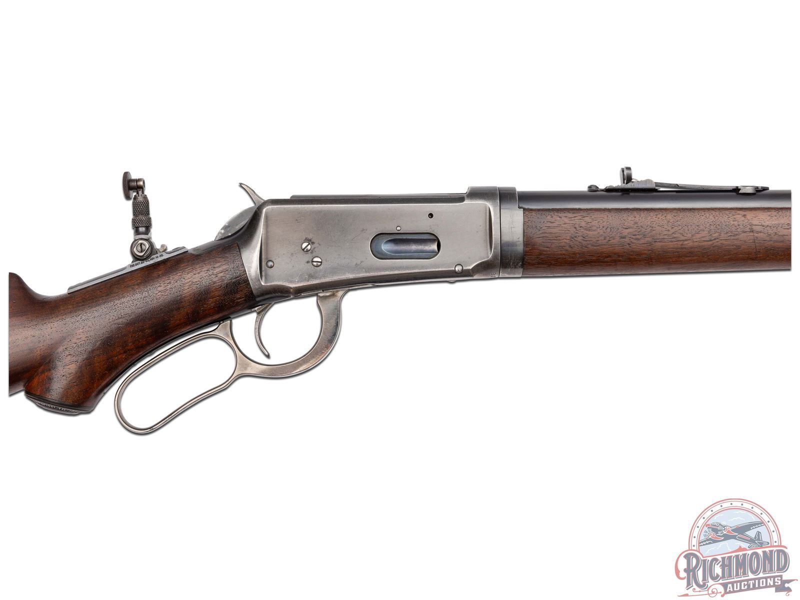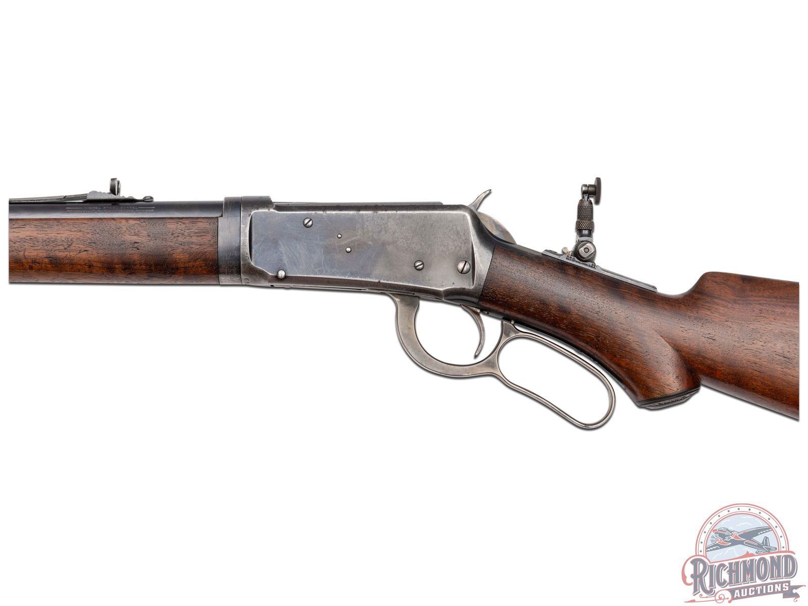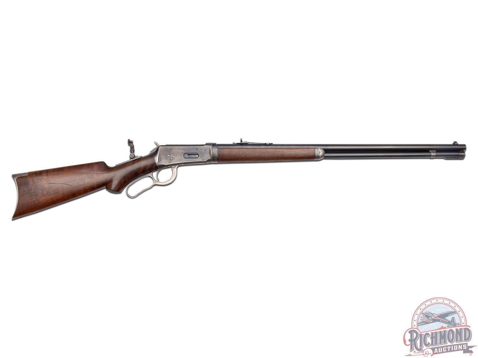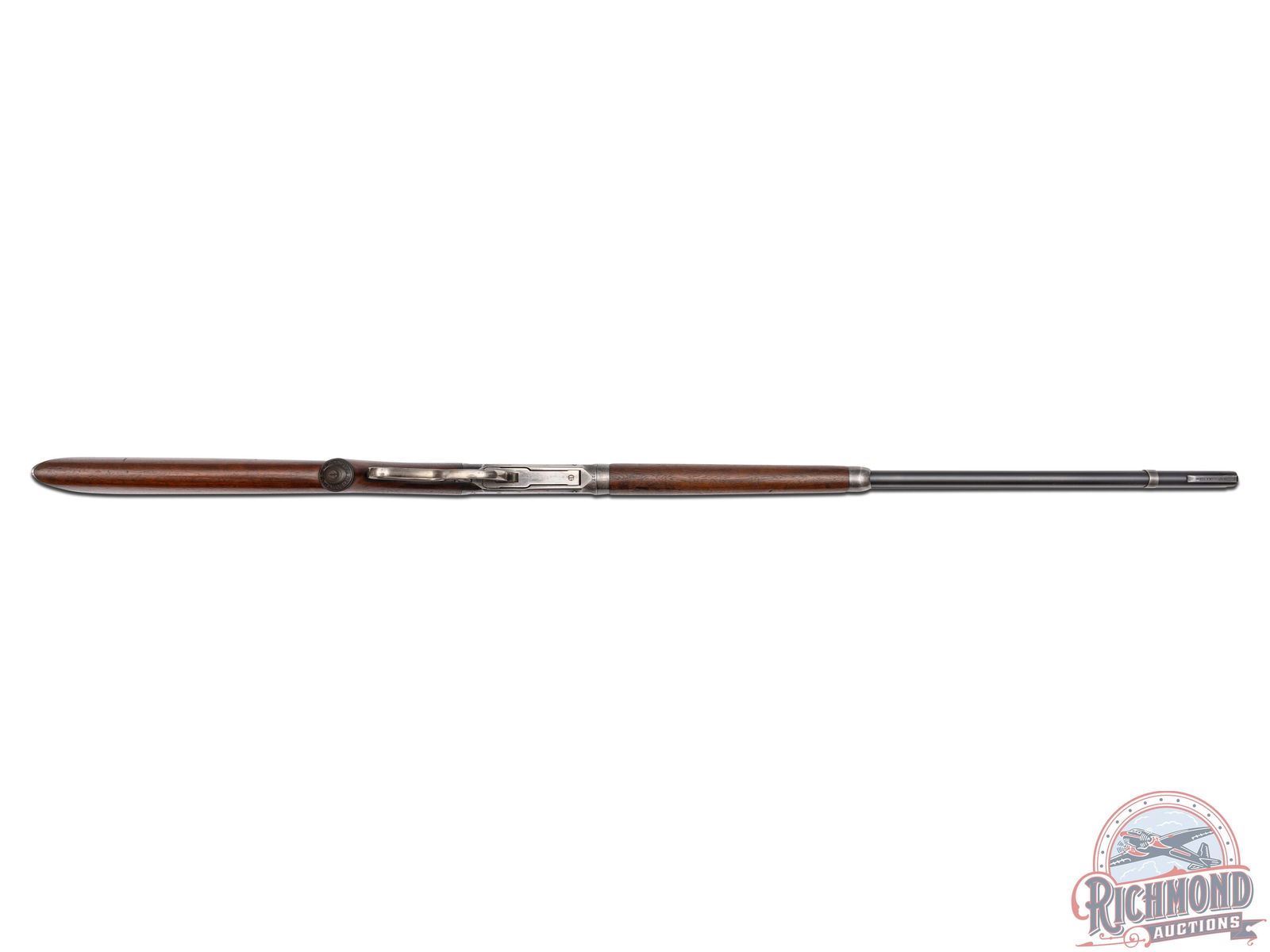 Manufactured in 1907. This nice model 1894 features a 26" blued round barrel with full length magazine. Marble's rear semi-buckhorn, Marble's tang mounted adjustable peep and Marble's No 6 front blade with white bead sight. Period correct barrel stampings with Winchester proof marks. Walnut pistol grip stock and matching forearm. Pistol grip fitted with a factory Winchester cap. Stock is fitted with a steel crescent butt plate. LOP: 13". CALIBER: 30 WCF. S/N: 371769. FFL STATUS: Curio & Relic.