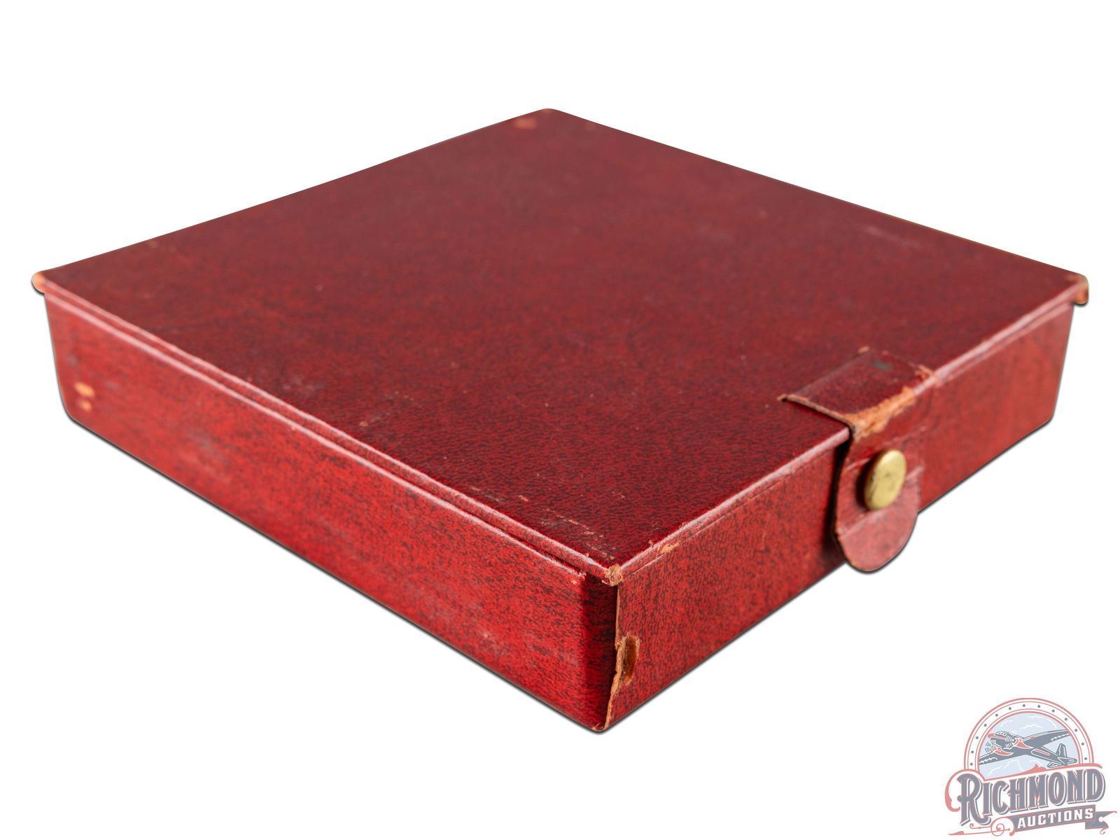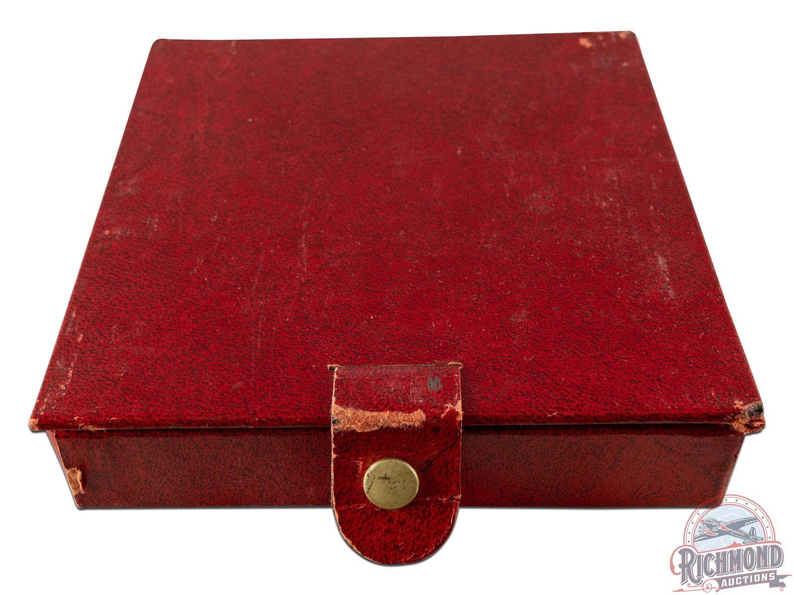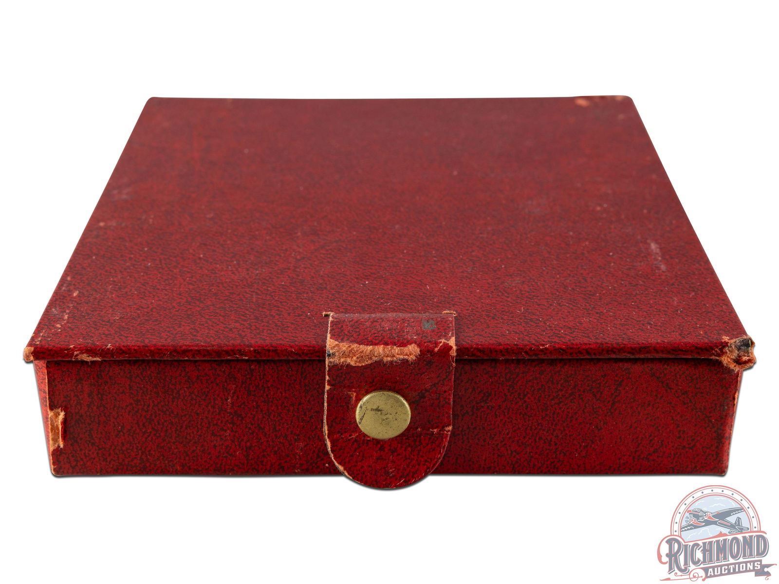 1950's vintage Winchester Salesman kit showcasing Winchester "Super Speed and Ranger" SuperSeal Crimped Shotgun shells with two SuperSpeed Window shells and a Super Trap Ranger shell, all with "Mark 5" marking in satin lined fitted red cardboard case with glass shot display tube.