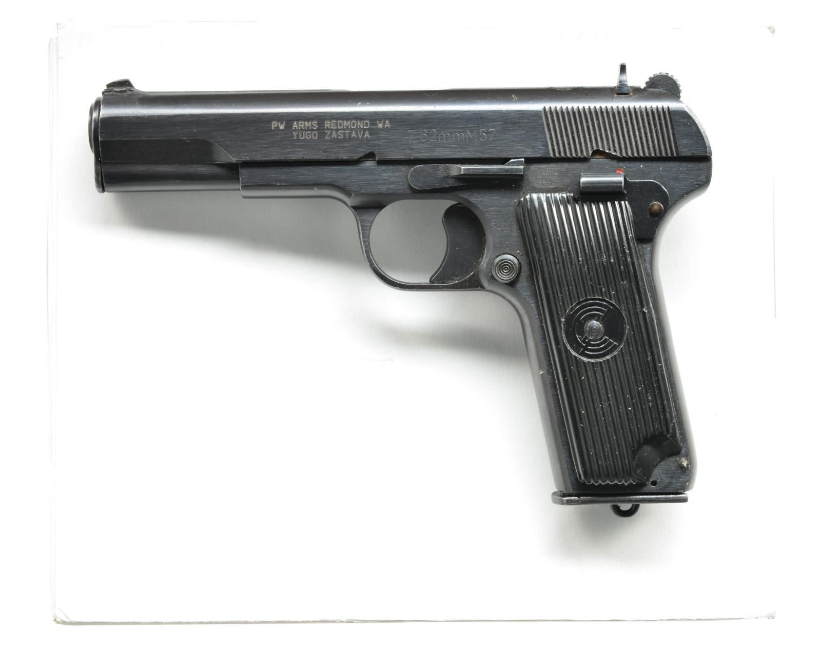 Cal. 7.62x25. Bbl. 4 1/2". Fixed sights. SA. S# O-274387. Slide is marked on left side "PW ARMS REDMOND WA YUGO ZASTAVA 7.62mm M57". Numbered match on frame, slide & bbl. Thumb safety on left side. Vertically grooved black plastic grips w/ Zastava logo on left side & encircled star w/ "FRSJ". MAGS: 1 - 9 rd. UNATTACHED ACCESSORIES: white cardboard shipping box w/ matching numbered sleeve. CONDITION: very good grips & metal finish. Metal has light high point wear. Very good shiny bore. (21-825/RW). MODERN. $300-400.